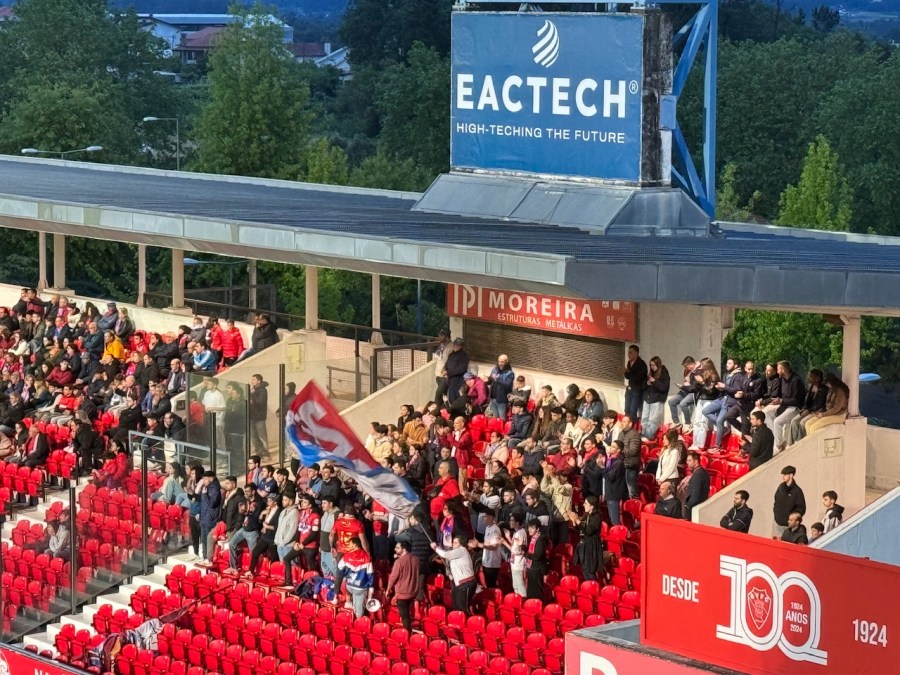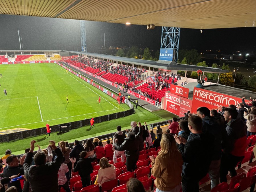 Ich suchte mir einen Platz auf der Hintertortribüne und war sofort vom Treiben auf den Rängen positiv überrascht. Hier war einiges los und in einem Block der Gegentribüne hatte sich ein kleiner Kern von 70 Leuten gebildet, der die Mannschaft 90 Minuten unterstützte. Es gab eine Schwenkfahne mit einem muskulösen Hahn. Sehr passend, denn der berühmte Hahn von Barcelos ist eines der bekanntesten Symbole Portugals. Im hinteren Bereich des Blocks waren auch Teile der Dorfjugend präsent, die zumindest artig mitklatschten. Das machte richtig Spaß und vor allem gelang es dem Block immer mal wieder auch weite Teile des Stadios zum Mitmachen zu animieren. Das war zweifelsfrei einer der besseren Auftritte in der portugiesischen ersten Liga.