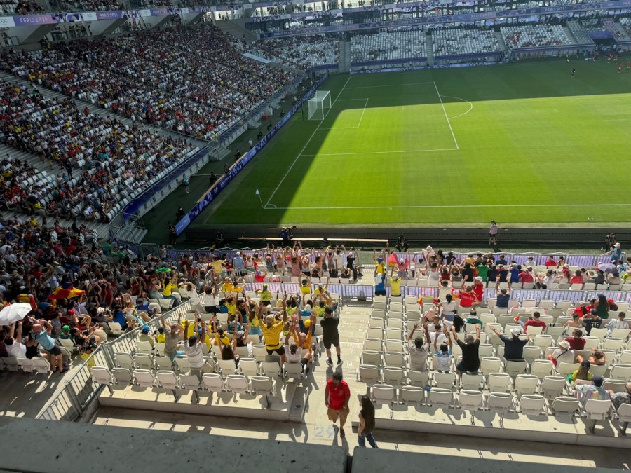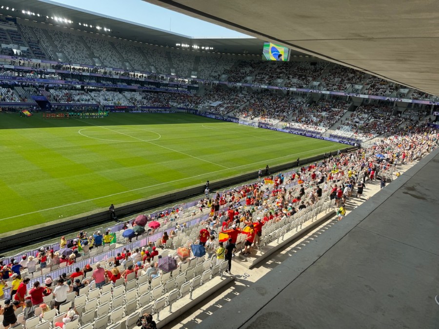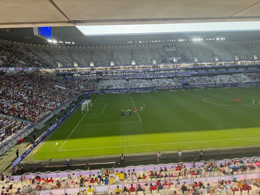 Dann ging es mit der Tram zum Stadion und zielsicher begab ich mich zum richtigen Eingang. Auf das Spiel heute, hatte ich mich im Vorfeld fast ein bisschen mehr gefreut. Im Gegensatz zu den Männern, laufen bei den Frauen die richtigen Nationalteams auf. Mit Marta auf der brasilianischen Seite und Alexia und Aitana auf der spanischen Seite, durfte ich einige der besten Spielerinnen der Welt auf dem Feld bestaunen. Spanien rotierte leider ein wenig, sodass die beiden Starspielerinnen erst im Laufe des Spiels eingewechselt wurden.