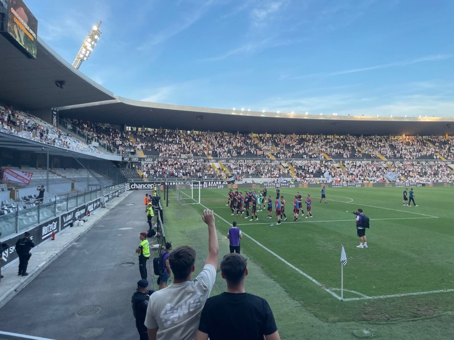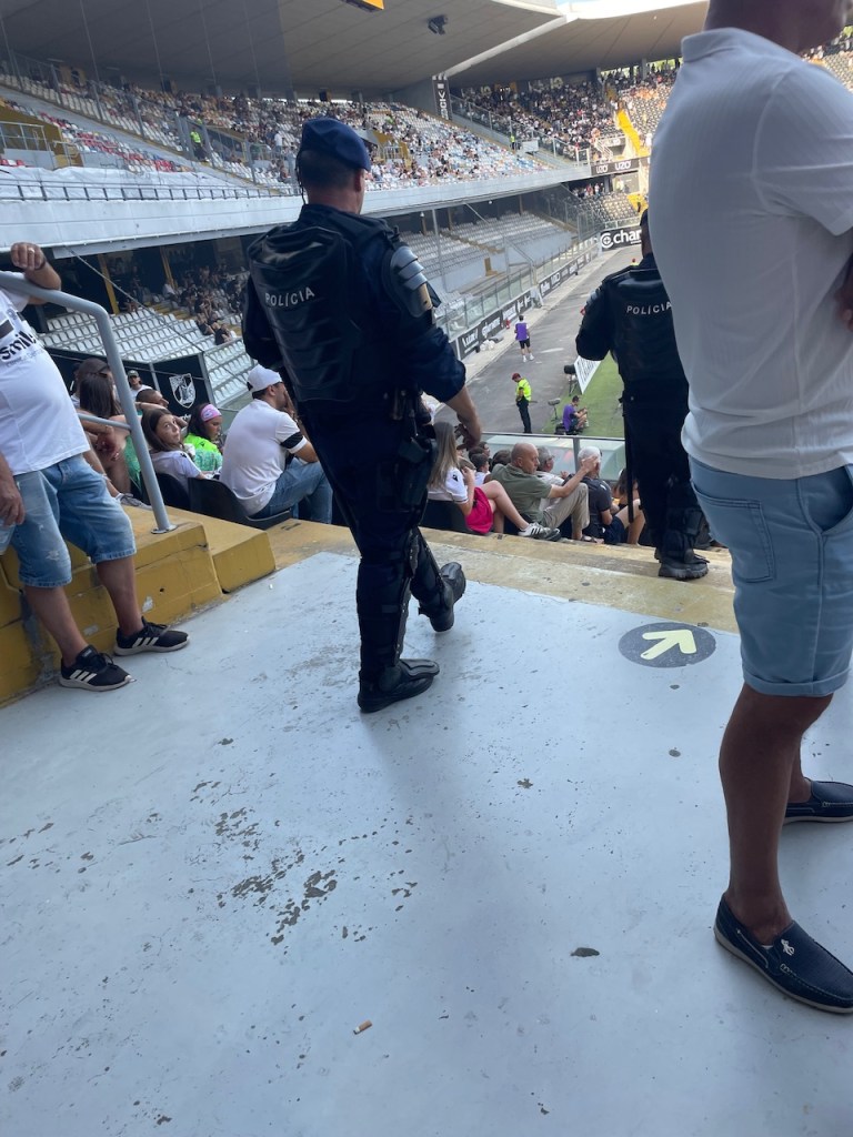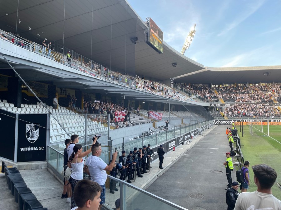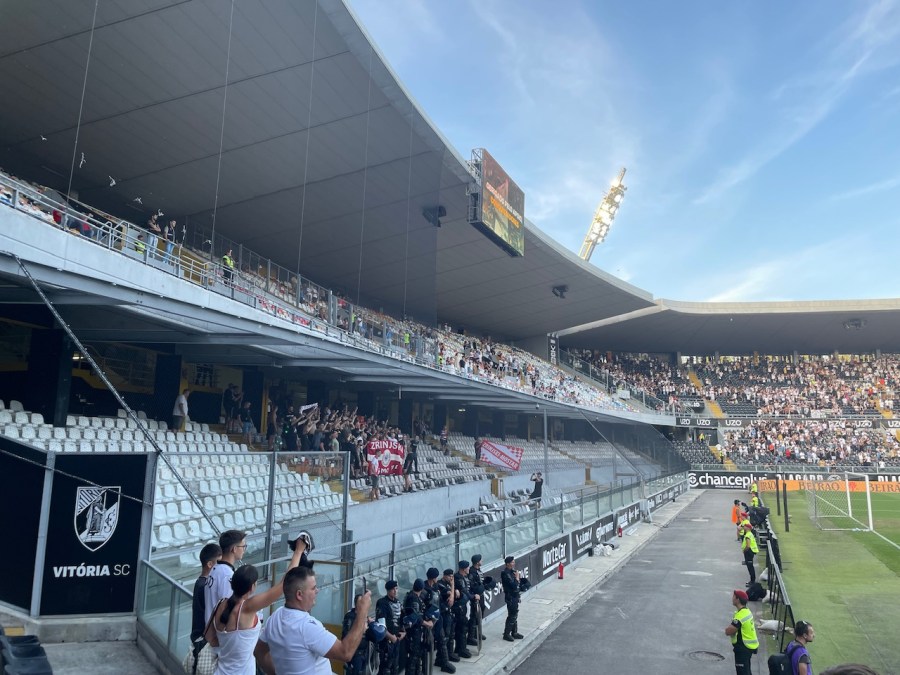 Mit dem Fernbus ging es kurz vor Anpfiff nach Guimarães. Der Busbahnhof ist nur knappe 10 Minuten vom Stadion entfernt und so kehrte ich auf dem Weg noch für zwei schnelle Bierchen ein und ging dann in das Stadion. Ich hatte mir eine Karte neben den Gästen geholt- nur leider war mein gebuchter Platz zu weit außen, sodass ich die Gäste nicht mehr sehen konnte. Ich guckte dann noch schnell im Buchungsportal und Platz 13 war als einziger im Block nicht gebucht. Da man die Karte auch zehn Minuten blockieren konnte, hatte ich relative Gewissheit, dass der Platz frei bleiben sollte. Schlussendlich waren dann aber sogar noch einige Plätze in dem Bereich frei.