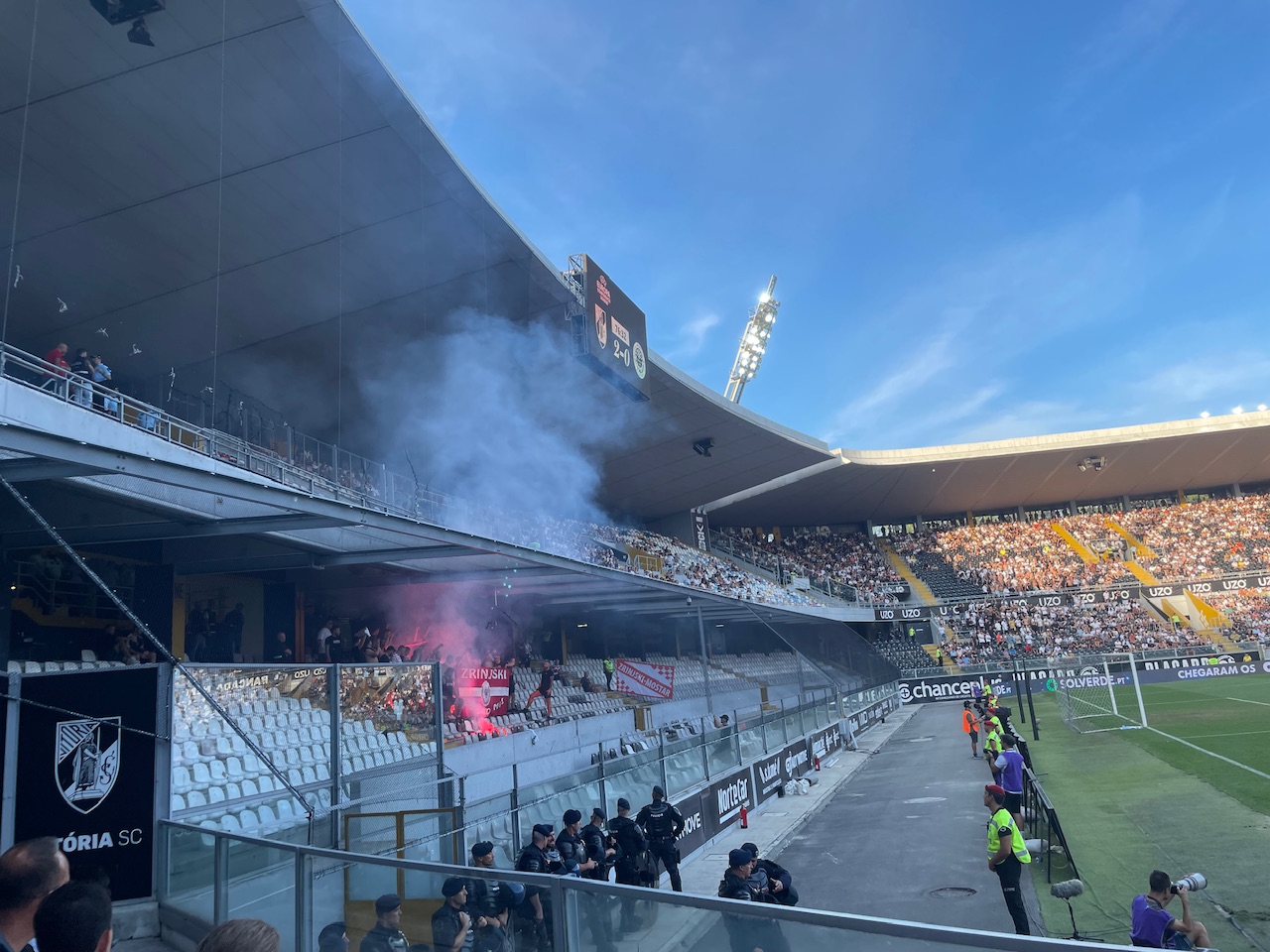 Mit dem Fernbus ging es kurz vor Anpfiff nach Guimarães. Der Busbahnhof ist nur knappe 10 Minuten vom Stadion entfernt und so kehrte ich auf dem Weg noch für zwei schnelle Bierchen ein und ging dann in das Stadion. Ich hatte mir eine Karte neben den Gästen geholt- nur leider war mein gebuchter Platz zu weit außen, sodass ich die Gäste nicht mehr sehen konnte. Ich guckte dann noch schnell im Buchungsportal und Platz 13 war als einziger im Block nicht gebucht. Da man die Karte auch zehn Minuten blockieren konnte, hatte ich relative Gewissheit, dass der Platz frei bleiben sollte. Schlussendlich waren dann aber sogar noch einige Plätze in dem Bereich frei.
