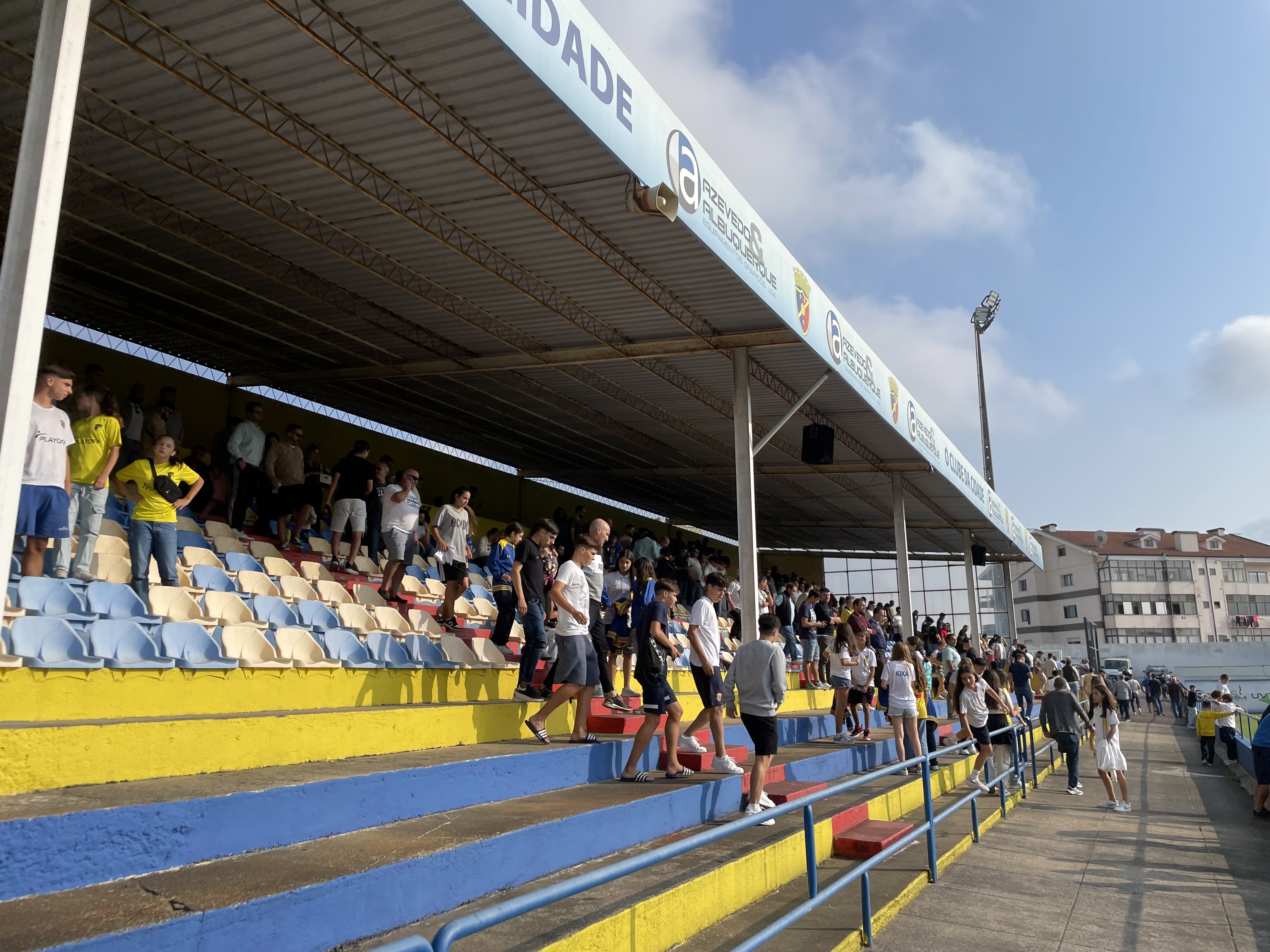 Ich konnte die Verspätung in Grenzen halten, da ich mich dann einfach an der Kasse für Gandra versorgte. Der nette Mann gab mir sogar ein Ticket zum Mitgliederpreis und im Stadion wurde auf Selbstselektion gesetzt, sodass ich trotzdem auf der Haupttribüne Platz nehmen konnte. Das Stadion ist für die Liga wieder eine echte Perle. Bemalte Stufen in den Vereinsfarben und ein paar punte Sitzschalen. Das ganze an zwei Seiten.