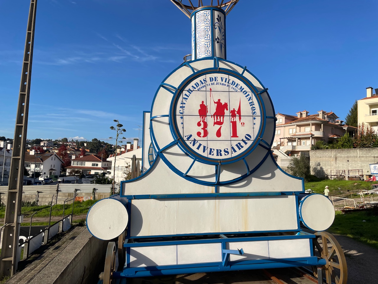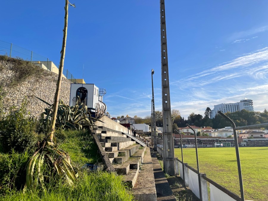 Ich entschied mich dafür das Auto stehen zu lassen. Das hatte mehrere Vorteile: Zum einen konnte ich mir meinen Ligenkomplettierungswein munden lassen: Zum anderen konnte ich zu Fuß durch die sehenswerte Altstadt Viseus zum Stadion laufen. Mich erwartete mal wieder eine echte Überraschung- in der Groundhopper App war kein Bild hinterlegt und so war ich gespannt, was mich bei Ankunft erwarten würde. Mein erster Eindruck war ein freundlicher Mann im Kartenhäuschen, der mir meine Karte aushändigte. Dann ging es hinein und ich traute meinen Augen kaum: Eine schöne Haupttribüne, eine kultige Imbissecke, eine grasbewachsene Gegentribüne und als Kirsche auf der Torte ein Zug, der als Dekoration auf der Gegentribüne stand. Was war denn hier wieder los?
