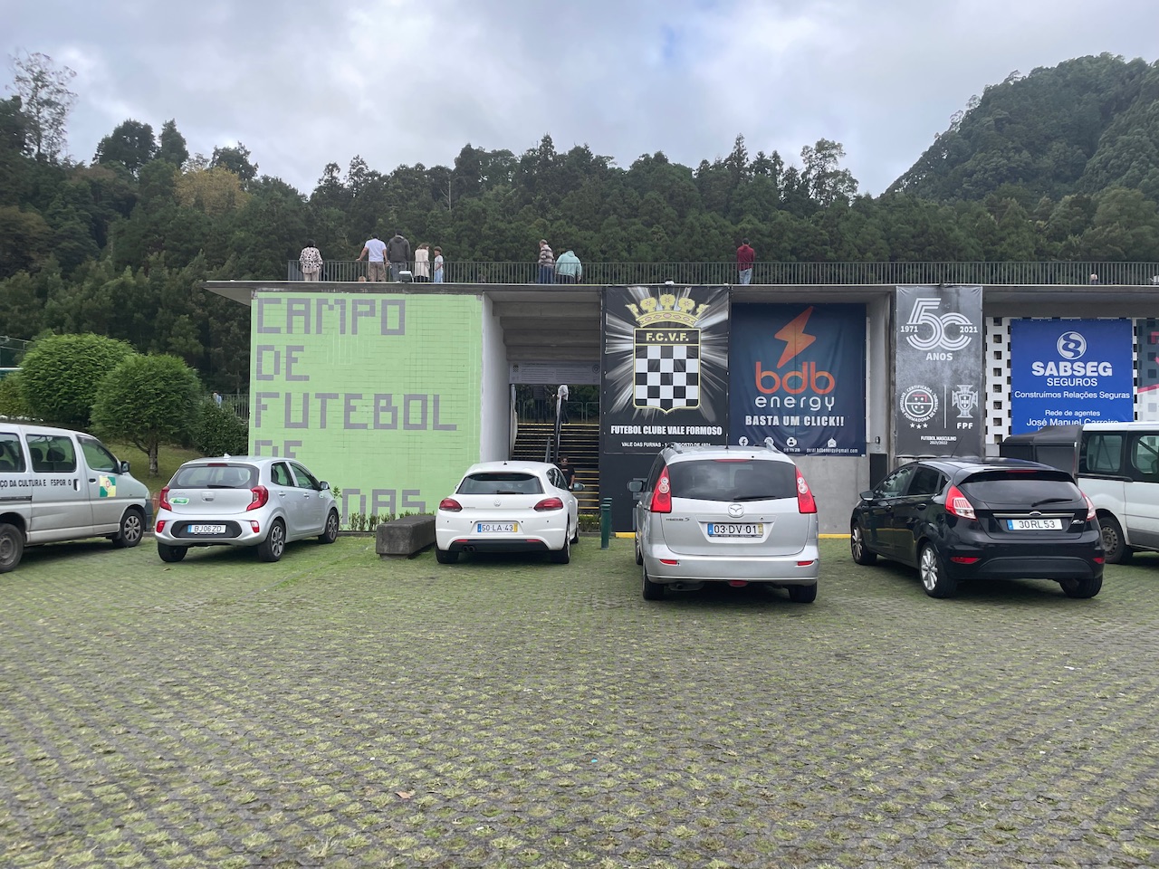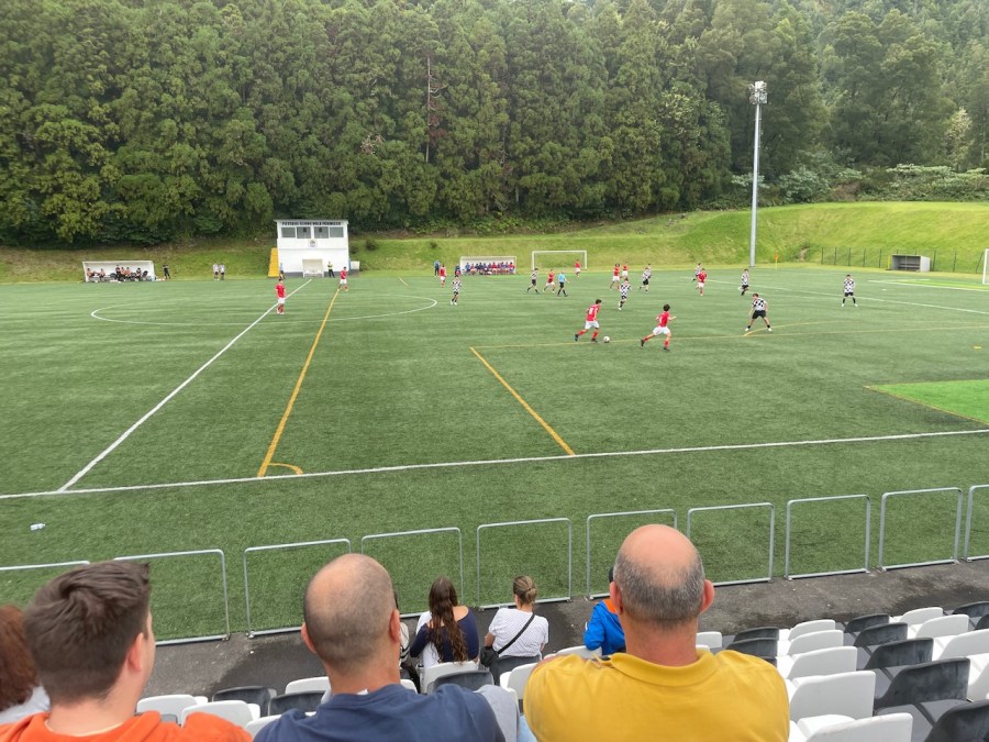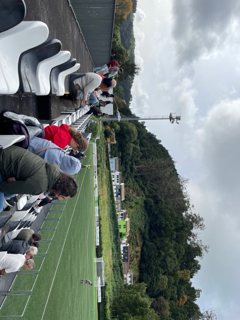 Ich war auf den Azoren! Ja, was könnte ich da nur machen? An diesem Vormittag wollte ich eigentlich eine Wanderung machen- als ich dann jedoch auf einer Ananasplantagee saß und frühstückte, scrollte ich doch noch einmal durch ZeroZero und fand dieses U19 Spiel zwischen Vale Formoso und Santa Clara. Nicht, dass Vale Formoso irgendwann überraschend in den Profifußball aufsteigt und einem dieser Ground dann fehlt, dachte ich mir. Und so schmiss ich den Plan um und fuhr spontan in die Stadt der heißen Quellen: Furnas. Dort parkte ich am Stadion und wollte im Eiltempo noch eine Wanderung bis zum Anpfiff um 12 Uhr machen. Ich wurde aber skeptisch, als ich schon Musik aus den Stadionlautsprechern hörte. Ich fragte also noch einmal nach und das Spiel sollte tatsächlich schon um 11 Uhr angestoßen werden. Also drehte ich nur noch eine kleine Runde durch das Dorf, konsumierte ein Getränk in der kultigen Dorfkneipe und ging dann zum Stadion.
