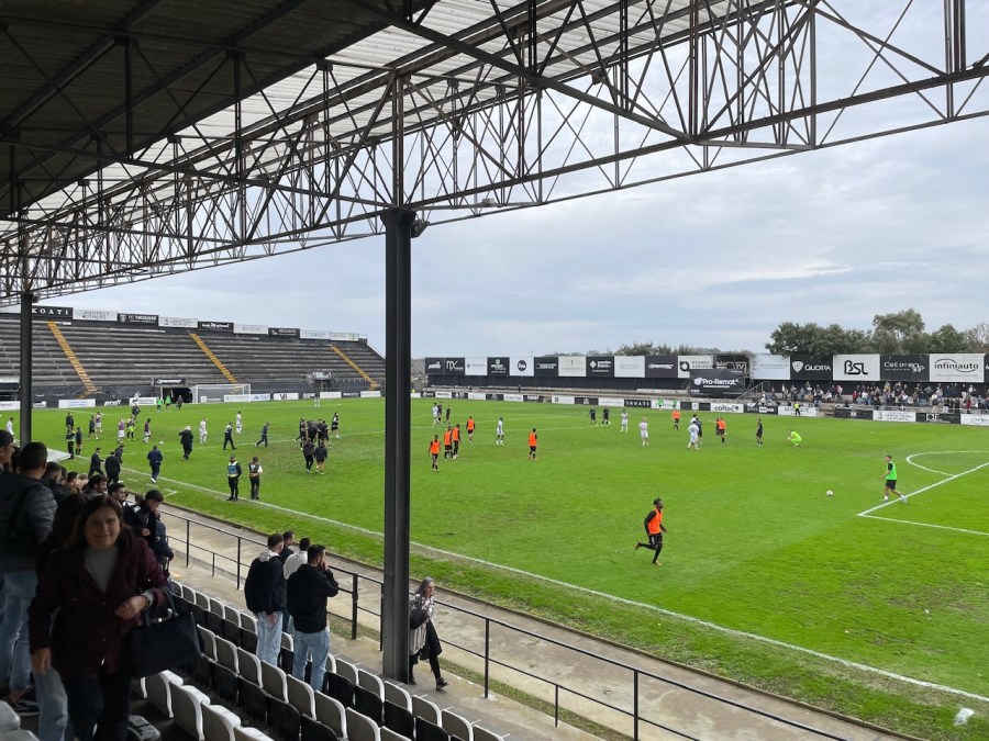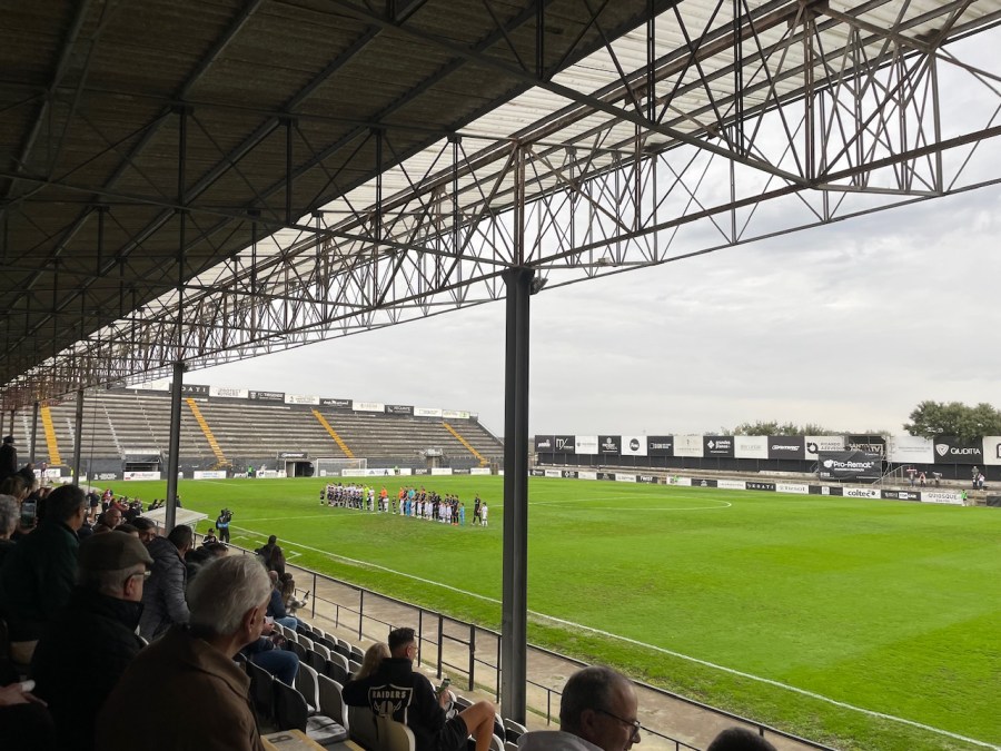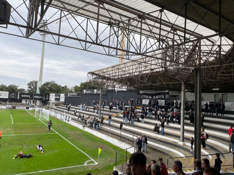 Tirsense hat definitiv die ruhmreichere Vergangenheit und kann auf vier Saisons in der höchsten Spielklasse zurückblicken. Das reicht immerhin für Platz 32 in der ewigen Tabelle. Damit ist man verrückterweise sogar vor Leixões, was ich im Leben nicht für möglich gehalten hätte. Das Stadion ist definitiv noch erstligatauglich und bietet Platz für 15.000 Leute. Es gibt Ausbau an vier Seiten, wobei die imposante Hintertortribüne heute nicht genutzt wurde. Ein kleiner Stimmungskern der Heimmannschaft fand sich hinter dem Tor ein. Im Stadionumfeld und eingebunden in den Verpflegungsverkauf sah man einige ältere Ultras, die nahelegten, dass es hier wirklich einmal bessere Zeiten gab.