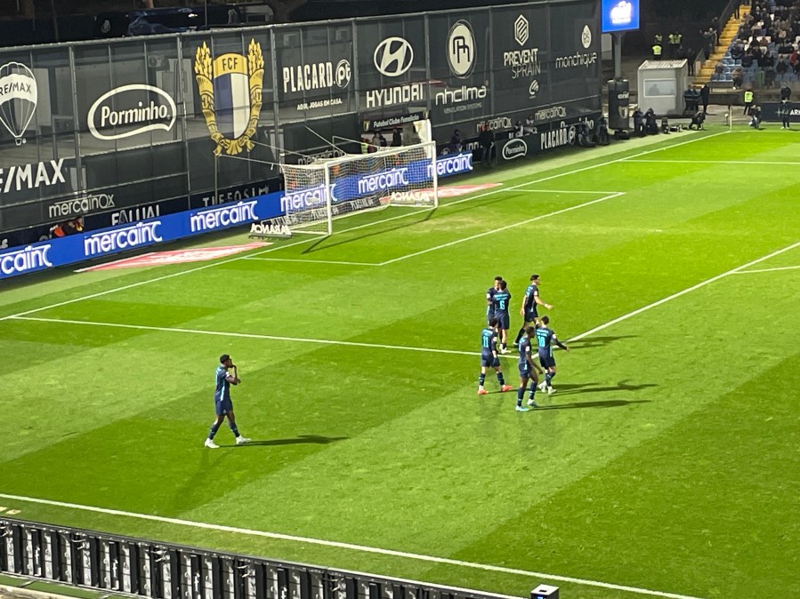 Ich trank noch einen Café und drehte dann eine kurze Runde durch das weihnachtliche Fama. Ich liebe es wie portugiesische Städte festlich geschmückt sind. Zündet mich einfach an und ich vermisse auch die überteuerten deutschen Weihnachtsmärkte nicht so richtig. Die Schlange am Stadion war dann überschaubar und so war ich zehn Minuten vor Anpfiff schon drin. Ich nahm wieder meinen Platz in der letzten Reihe in der Nähe des Gästeblocks ein.