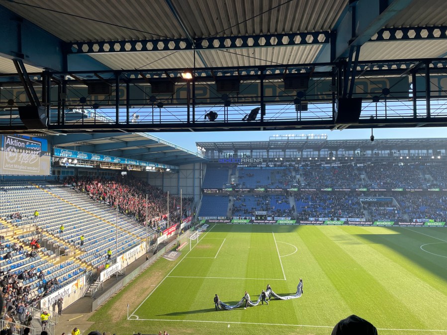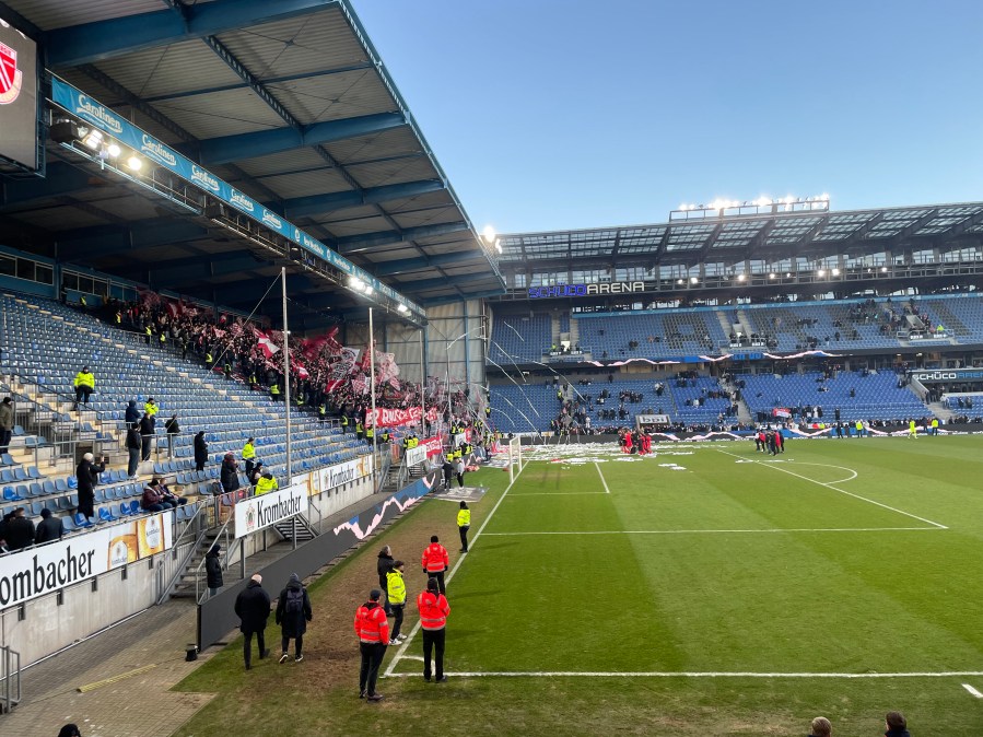 Die Heimkurve startete ebenfalls mit einer optischen Aktion in die Partie. Hier wurde ebenfalls ein Chaosintro mit Fahnenmeer gezeigt. Zudem gab es ein großes Spruchband „Jeder so laut er kann, schreit Arminia voran“. Abgerundet wurde das Intro im zweiten Teil durch einige blaue Stoffbahnen. Die Kutten waren etwas zu übereifrig und so war das Spruchband kurz nicht mehr zu lesen. In der Folge war der Auftritt leider sehr durchwachsen. Immer mal wieder gab es längere Pausen und richtig Laut wurde es nur bei den Wechselgesängen. Da habe ich schon deutlich bessere Auftritte von Bielefeld gesehen.