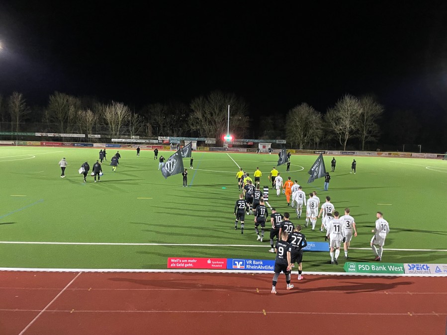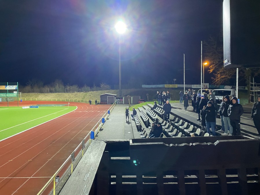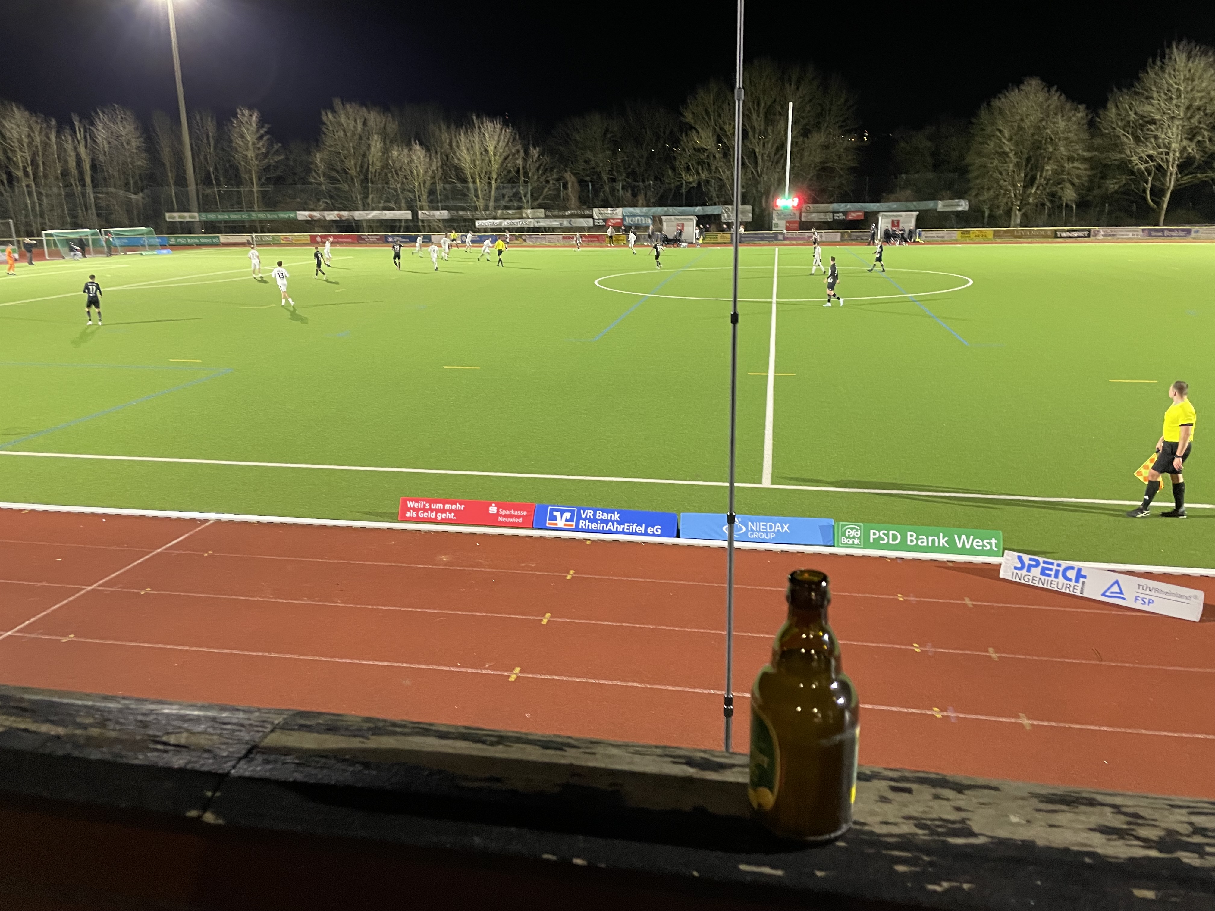 Mit Blick auf das Zeitbudget, passte der Stopp perfekt und kurze Zeit später machte ich mich dann auf den Weg zum Kaiserbergstadion. Das Stadion hatte ich bereits vor einigen Jahren beim Wandern entdeckt. Ein bekannter Wanderweg führt direkt am Stadion entlang. Schon damals imponierte mir die majestätische Lage direkt auf einem Hügel am Rhein. Nachteil der Lage war, dass ich im Dunkeln dann auch die Serpentinen nach oben stapfen durfte. Etwas gruselig, aber auch eine besondere Anreise. 6 Euro kostete die Zulassberechtigung zum Abstiegskracher in der Rheinlandliga. Gewitzelt wurde viel über einen möglichen Zuschlag, da es wohl das erste Spiel mit der neuen Flutlichtanlage war.