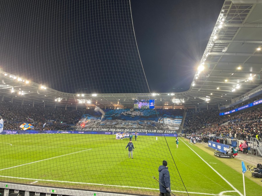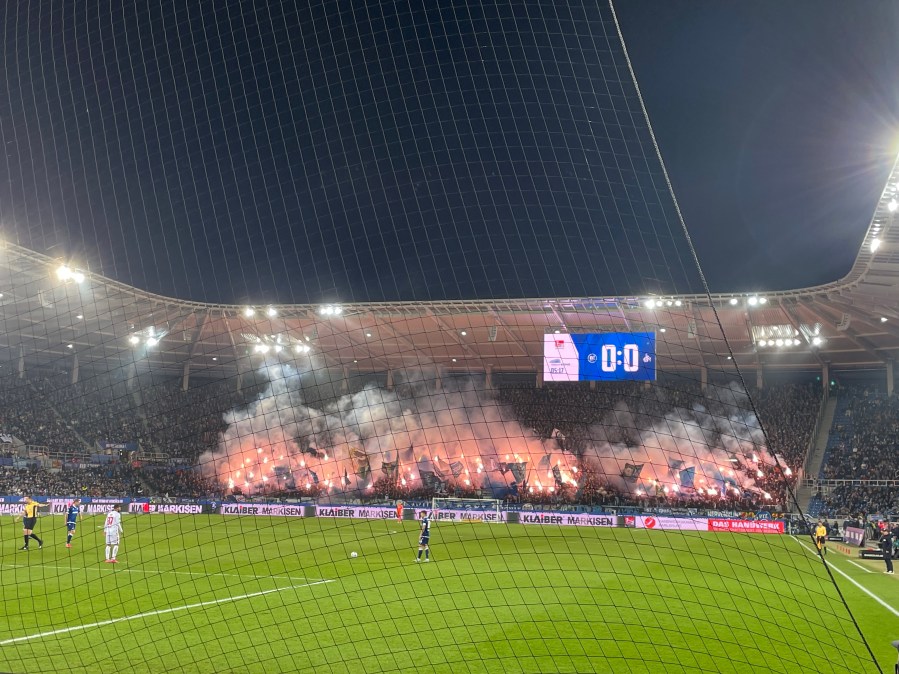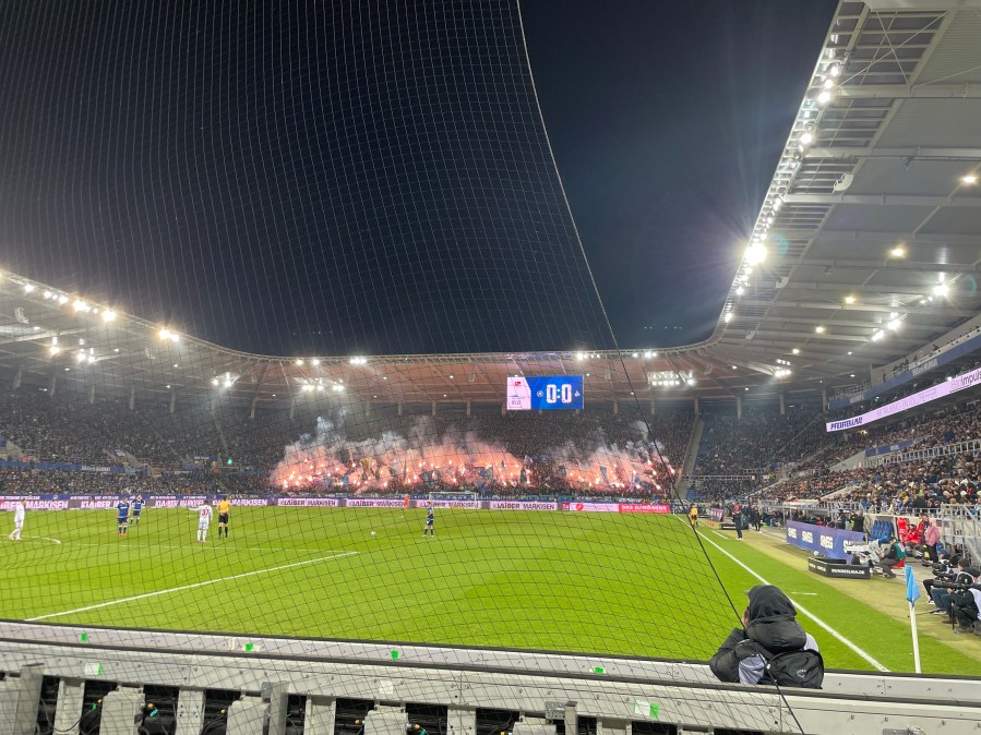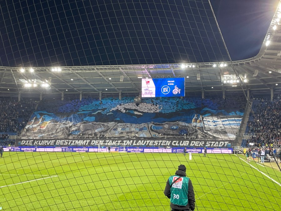 Die Gegengerade startete früh mit einer genialen Choreo in die Partie. Unter dem Motto „Die Kurve bestimmt den Takt im lautesten Club der Stadt“ wurde eine geniale Blockfahne gezeigt. Als kleines Schmankerl wurden zwei Platten mit Gegengerade und KSC-Logo in die Blockfahne eingearbeitet gedreht. Dazu gab es eine Fackel und dann im oberen Bereich zahlreiche Blinker als „Discokugel“. Mir gefiel die Choero und dieser anlassbezogene Einsatz der Pyro extrem gut. 10/10! Auch in der Folge zeigte die Gegengerade einen richtig guten Auftritt. Man startete mit einer massiven Pyroshow. Auch in der Folge wurden immer mal wieder Fackeln angerissen und akustisch ging der Sieg klar nach Karlsruhe. Ein winziger Schönheitsfehler ist die Mitmachquote in den oberen Bereichen der Kurve- aber in welcher Heimkurve ist das anders?