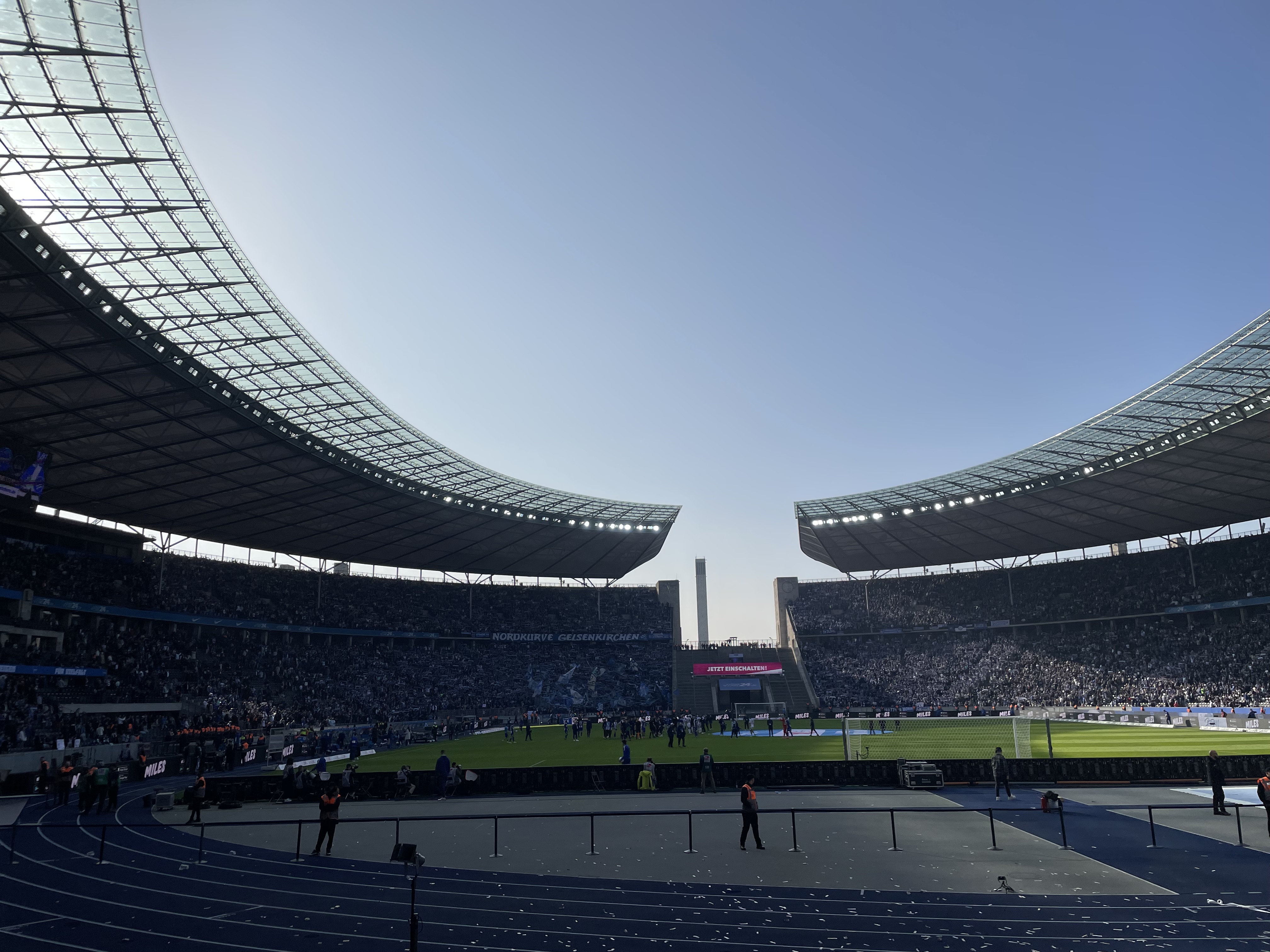 Im Vorfeld war wieder das Wort Invasion im Umlauf. Bis zu 40.000 Schalker sollten in das Olympiastadion einziehen. Das war dann doch etwas zu hoch gegriffen. Knapp über 20.000 Schalker werden es am Ende aber sicher gewesen sein. Die aktive Fanszene positionierte sich im eigentlichen Gästeblock und hatte im oberen Bereich die „Nordkurve Gelsenkirchen“ Zaunfahne angebracht. Optisch sah das für mich sehr gut aus und durch Wechselgesänge schaffte man es immer mal wieder die umliegenden Blöcke mitzunehmen. Auch die Mitmachquote sah aus der Ferne sehr anständig aus. Merkwürdigerweise war die Lautstärke dennoch eher durchschnittlich. Ich teilte trotzdem nicht das negative Urteil vieler Umstehenden.