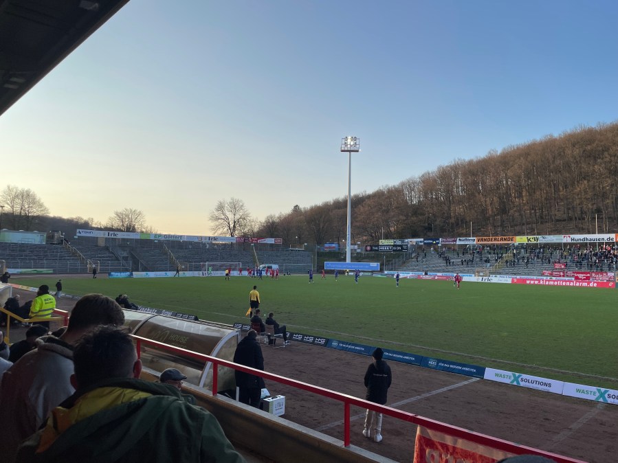 Die Schlange am Tickethäuschen war leider noch vorhanden und die Leute slow. Zur achten Minute war ich dann aber drin. Das Stadion ist wirklich sehenswert mit Ausbau an allen vier Seiten. Ich guckte den Großteil des Spiels von der Haupttribüne in relativer Nähe zu Siegener Fanszene. Diese überzeugte mit der schönen Zaunfahne der Turnschuwcrew, lang gehaltenen Liedern und einer beeindruckenden Altersstruktur. Ich finde ältere Szenen immer cool, auch wenn das vermutlich auch dafürspricht, dass die Siegener Jugend nicht unbedingt in die Fanszene strömt. Schade- die Lage im Niemandsland wäre dafür eigentlich prädestiniert. Vermutlich greifen Köln, Dortmund und Frankfurt da aber auch teilweise Leute ab.