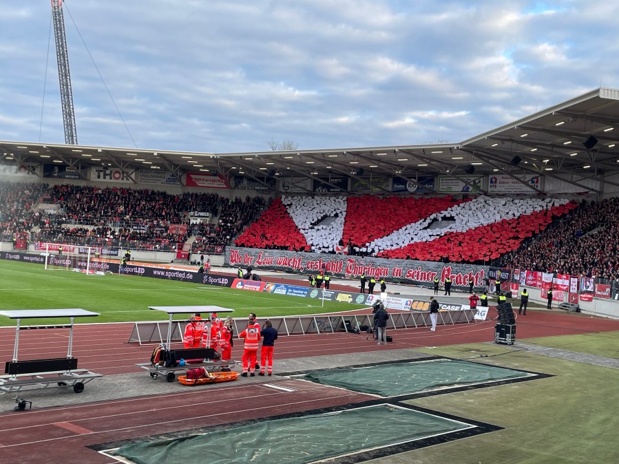 Beide Seiten starteten dann mit großartigen Intros in die Partie. In der Steigerwaldkurve wurden rote und weiße Pappen gezeigt. Am Zaun prangte das Choreospruchband „Wo der Löwe wacht, erstrahlt Thüringen in seiner Pracht“. Im zweiten Schritt wurde ein Löwe mit Krone hochgezogen, der seine Krallen schützend, um die Silhouette Erfurts legt. Einige der Bauwerke sind zudem rot-weiß verschönert. Die Motive wurden auch im Stadtbild so gestaltet, wie der Derbyrückblick der Erfordia Ultras zeigt. Anschließend wurde das Bild durch zahlreiche Fackeln gerahmt. Eine absolut sackstarke Aktion.