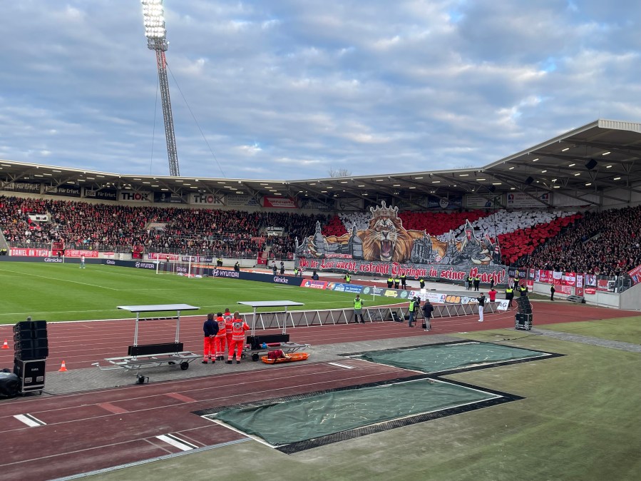 Viel Zeit hatte ich in Erfurt leider nicht mehr und so reichte es nur noch für ein Streifen der sehenswerten Innenstadt. Ich mag Erfurt wirklich gerne. Dann ging es zu Fuß zum Steigerwaldstadion. Ich hatte noch meinen Rucksack dabei- aber am Hauptbahnhof war kein Schließfach frei und auch ein Versteck drängte sich mir nicht auf, sodass ich hoffte, dass eine Abgabe am Stadion, wie angekündigt möglich wäre. Schlussendlich hätte ich den Rucksack sogar mitreinnehmen können, aber auch die Abgabe klappte problemlos und ermöglichte mir einen entspannteren Spielbesuch.