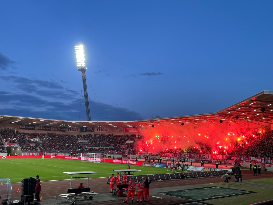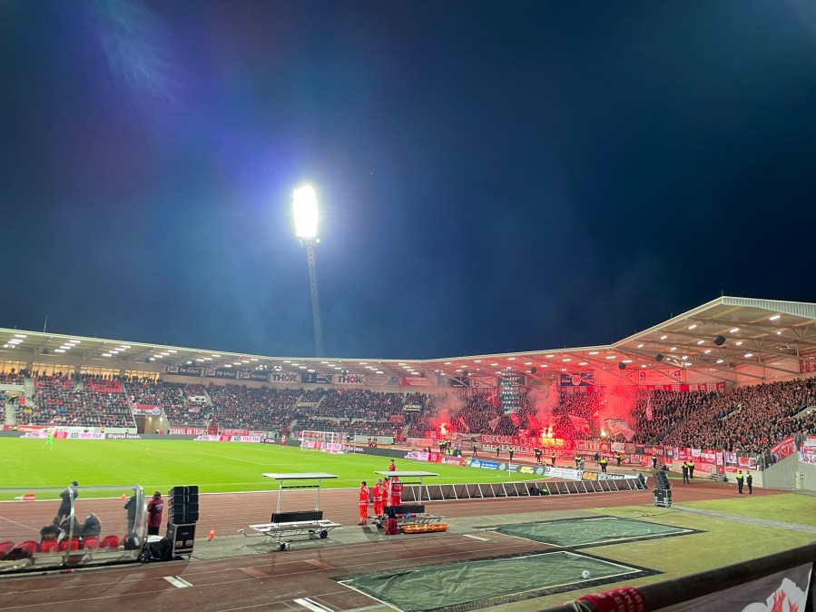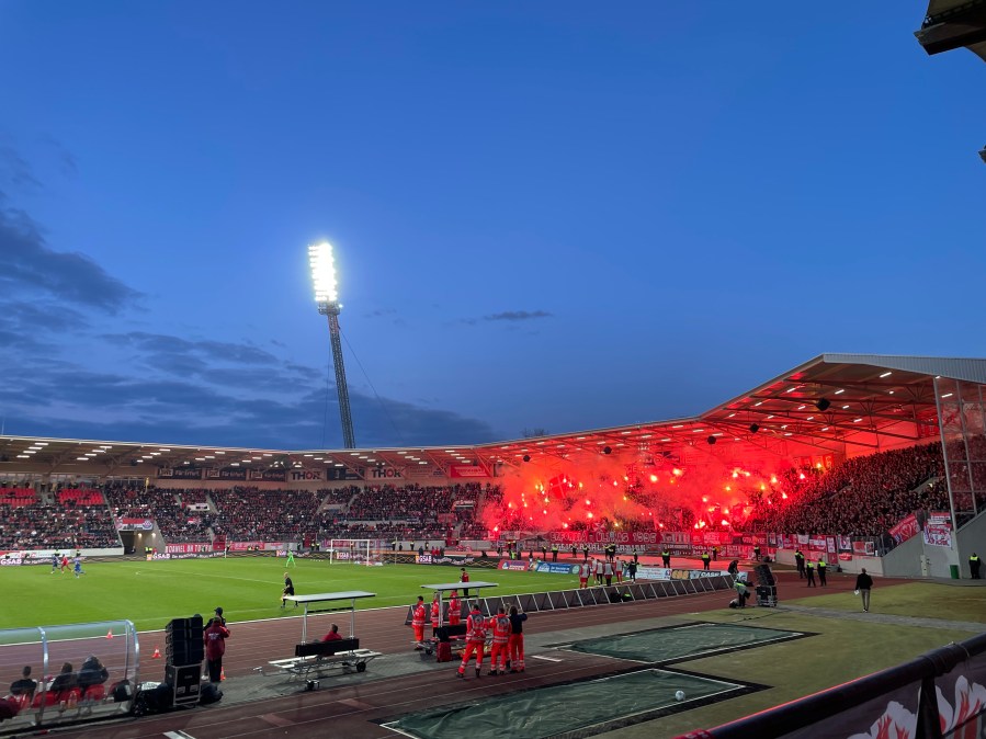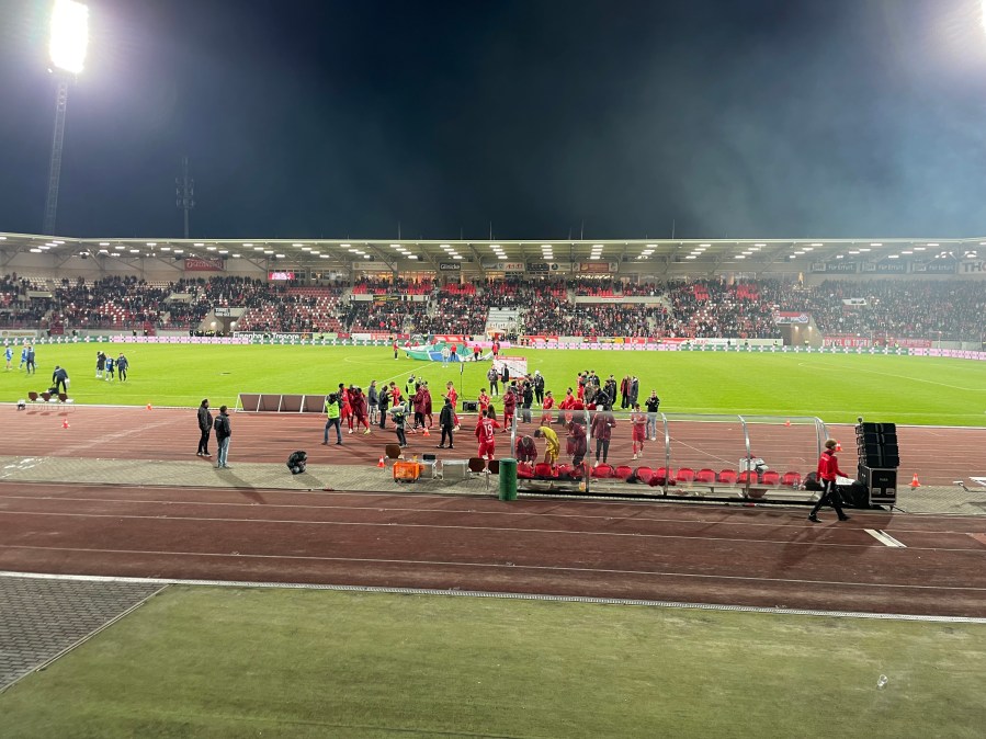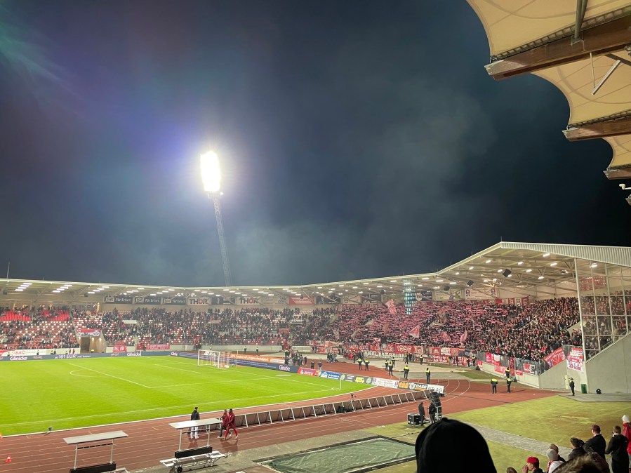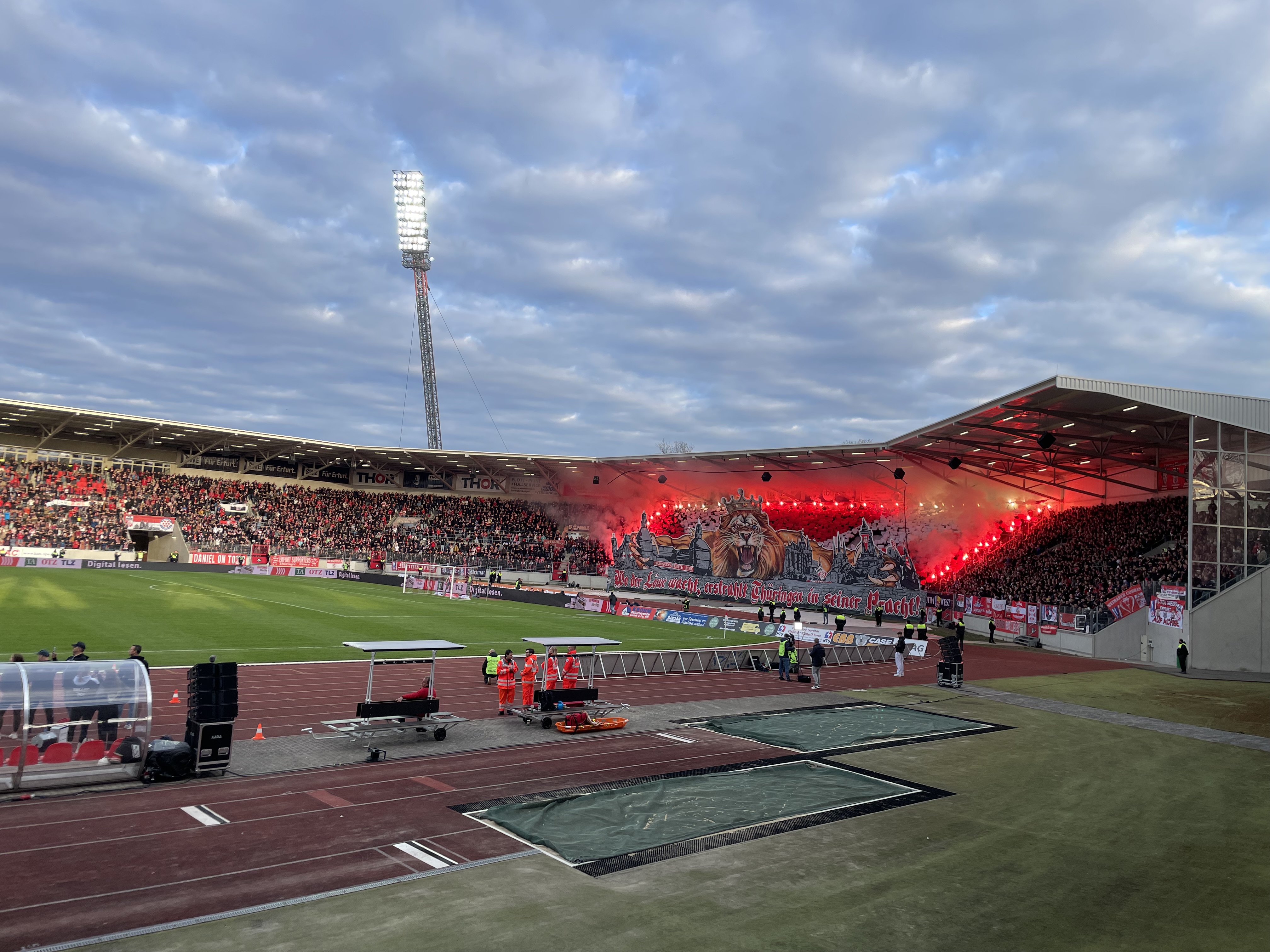 Akustisch hatte die Heimkurve die Nase vorne. Jenas Auftritt war mit Blick auf den Spielverlauf aber auch nicht von schlechten Eltern. Das machte heute einfach riesigen Spaß. Jena setzte wie erwartet auf das etwas melodiösere Liedgut.