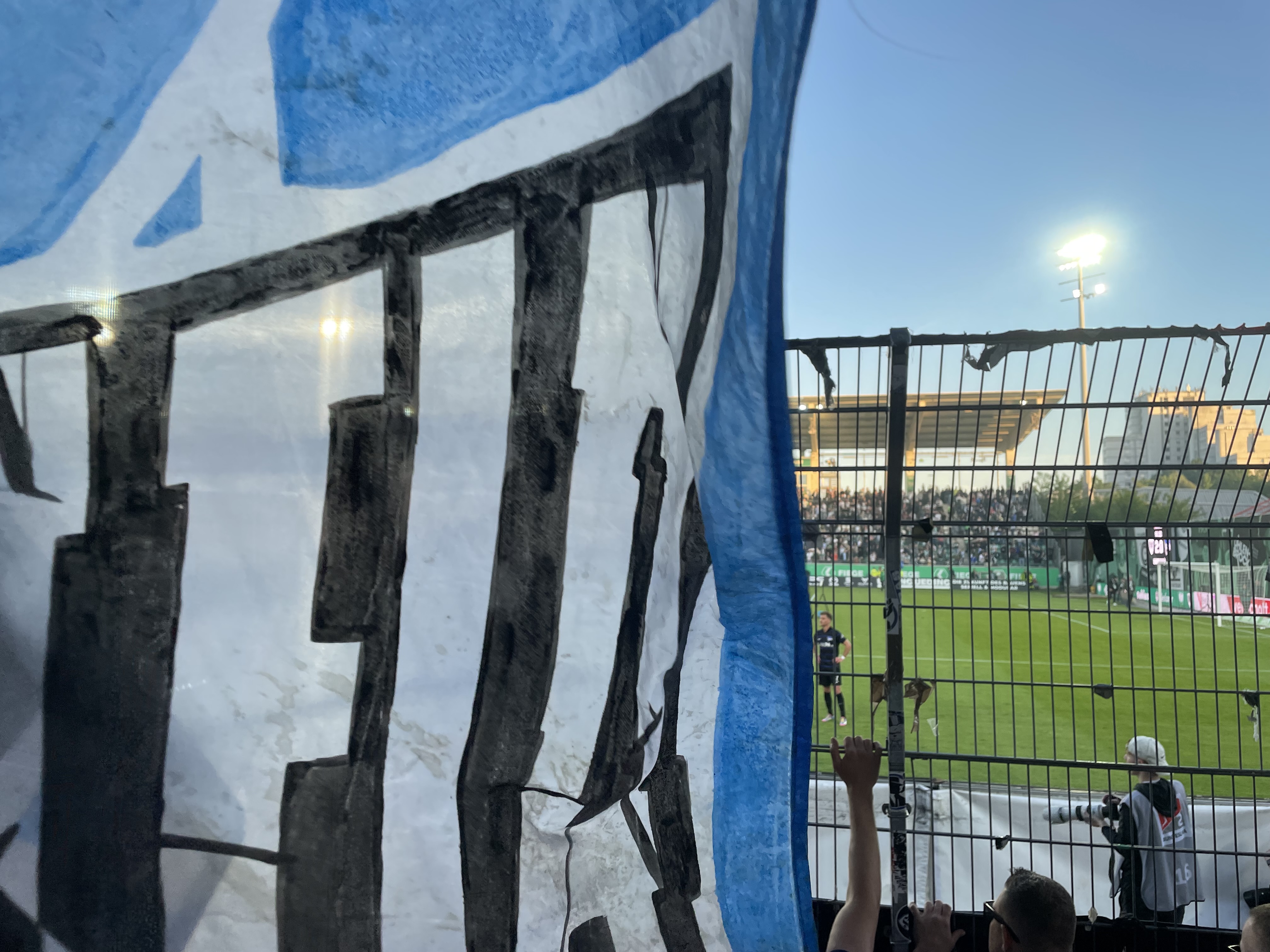 Trinkgut statt Portugiesen und dann verfranzte ich mich ziemlich im Versuch den Gästeblock zu finden. Schön an der Heimkurve vorbei und dann in eine Sackgasse zu einem Art Vereinsheim. Stark! Da ich aber zumindest nur teilzeitdumm bin, wurde der Fehler nicht bestraft. Im zweiten Anlauf fand ich dann auch den richtigen Zufahrtsweg und war dann am Gästeblock angekommen. Die Securities waren ziemlich freundlich und so entschied ich mich spontan dazu heute auf Tasche und Fleecejacke zu verzichten und leicht wie ein Vogel dem Spiel beizuwohnen. Bei den fast tropischen Temperaturen vermisste ich den Ballast auf jeden Fall nicht.