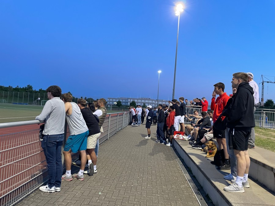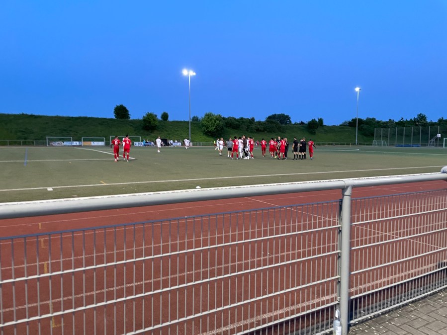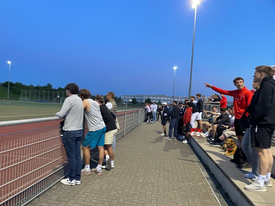 Kurz vor dem Anpfiff erreichten wir die Sportanlage, die wir ohne Ticketkauf betreten durften und suchten uns ein Plätzchen auf einer der Stufen. Auf der gegenüberliegenden Seite gab es noch einen begrasten Hügel und das Vereinsheim hatte einen Balkon, von dem man auch das Spielfeld sehen konnte. Ich war definitiv schon auf schlechteren Plätzen unterwegs.