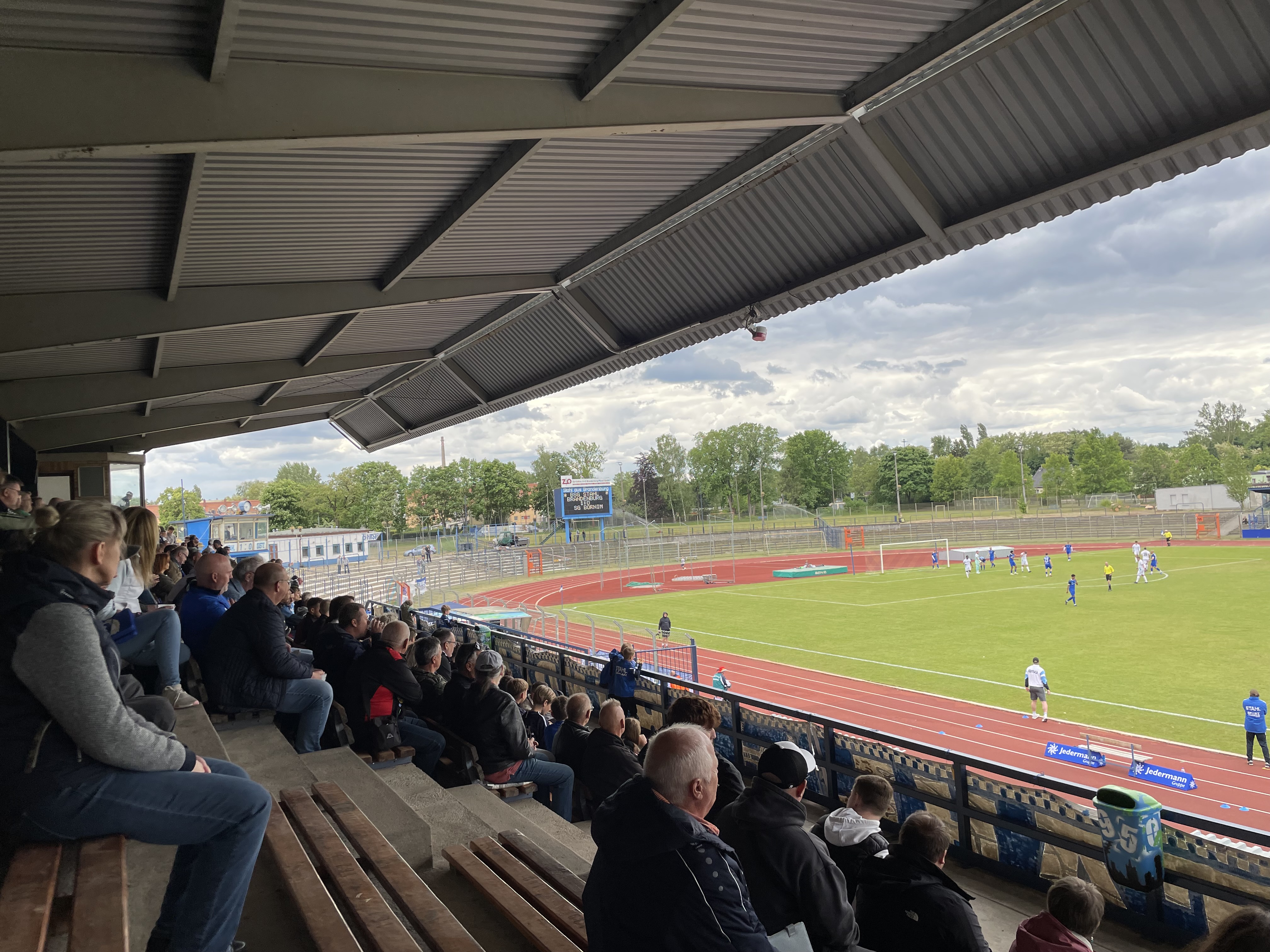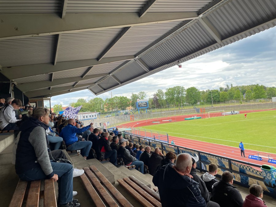 Das Stadion am Quenz ist richtig stark. Das Herzstück ist die Tribüne auf der Gegengerade, auf der sich auch die Fanszene von Stahl Brandenburg niedergelassen hat. Dazu gibt es im gesamten Rund grasbewachsene Stufen und eine Laufbahn um das Stadion herum. Mit einer Zulassung von 15.500 Zuschauern ist es immerhin das drittgrößte aktive Stadion in Brandenburg. Es wurde allerhöchste Zeit diesen Ground mal zu kreuzen.