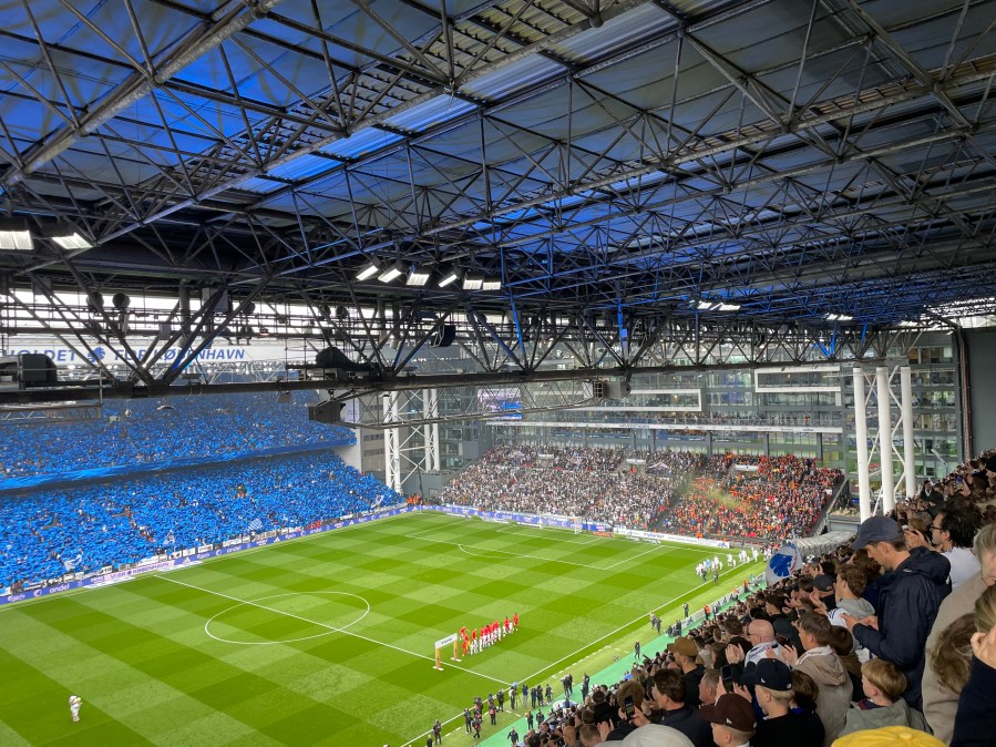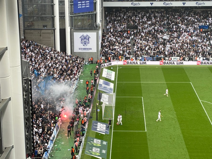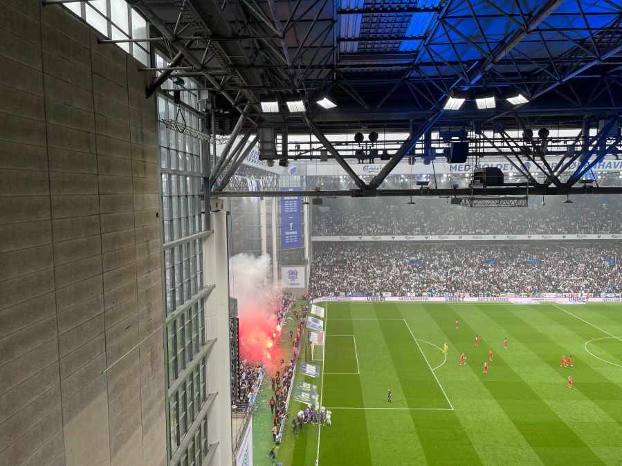 Zu Beginn der Partie gab es eine kleine Choreo auf der Gegentribüne mit blauen Pappen und dem FC Kopenhagen Logo. Ich bin mir nicht zu 100% sicher, ob das nicht vielleicht sogar eine Vereinschoreo war. Unwissenheit olé! Sehr bemerkenswert war noch die Gummitierchen Aktion der Kopenhagener, die seit 2004 jedes Jahr am letzten Spieltag durchgeführt wird. 2004 kaufte Parken Sport & Entertainment (Klub‑Eigner) einen Wasserpark und wurde dafür von den Rivalen Bröndby verspottet. Kopenhagen Fans nahmen das auf und machten sich ihrerseits durch den Wurf von Gummitieren darüber lustig. 21 Jahre später hat die Aktion wahnsinnige Ausmaße angenommen. Eigentlich fliegen die Tierchen in der 13. Minute, aber der Verein hatte aufgrund der Angst um eine Spielunterbrechung (Stichwort Meisterspiel) um einen Start zur Halbzeit gebeten. Teils in der 13. Minute und dann großflächig zur Halbzeit segelten dann im ganzen Stadion Gummitiere und Reifen durch das Stadion. Völlig verrückt und noch nie so etwas gesehen. Die Kurve Kopenhagen wollte sich wohl nicht ganz darauf einlassen und so flogen kurz nach Beginn der zweiten Halbzeit noch einmal einige Tierchen auf das Spielfeld und die Partie wurde kurz unterbrochen. Während der Partie zeigte die Heimkurve immer mal wieder kleinere Pyroshows. Das war schwer in Ordnung.