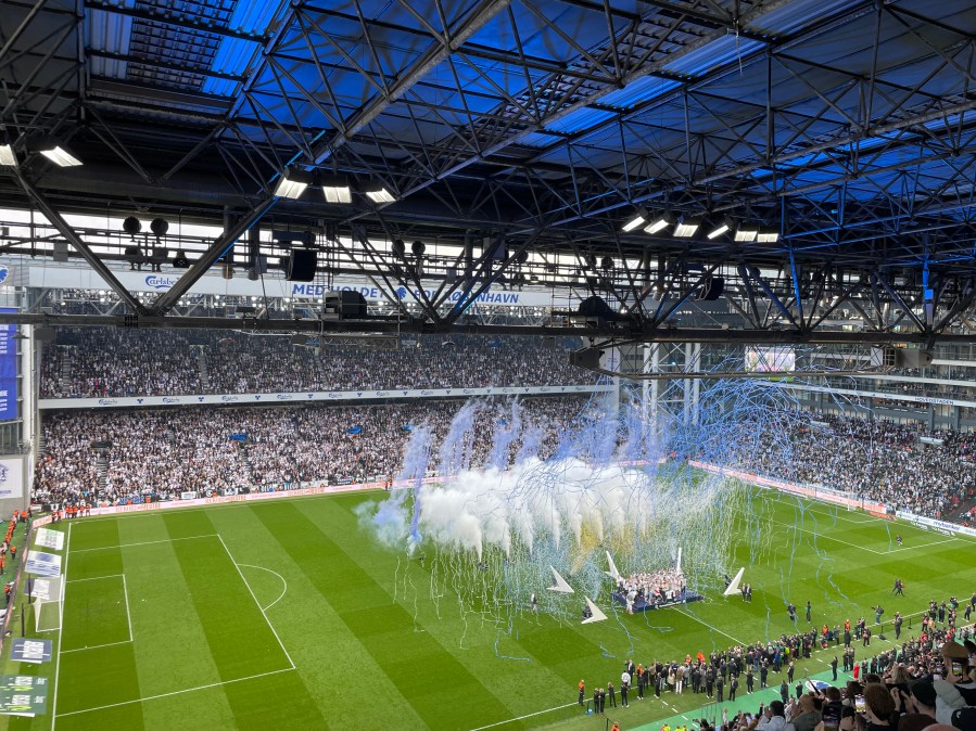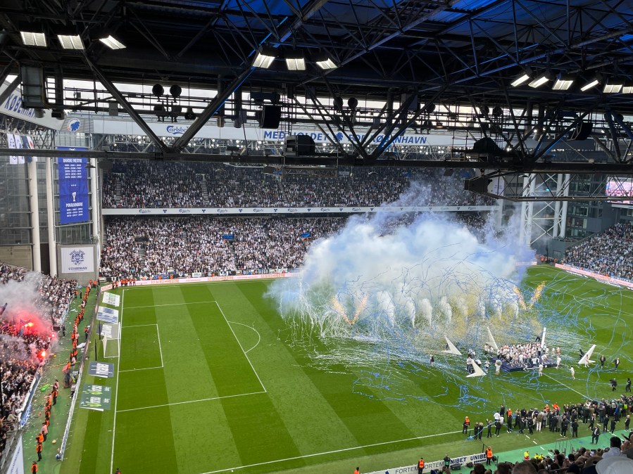 Auf dem Rasen konnte Kopenhagen früh in Führung gehen und damit die größten Ängste beseitigen. Ziemlich routiniert konnte das Spiel mit 3:0 gewonnen werden und somit aus eigener Kraft der Meistertitel eingefahren werden. Nach dem Abpfiff gab es keinen riesigen Ausbruch und keinen Platzsturm. Wir warteten alle recht verzweifelt auf den Aufbau der Bühne auf dem Spielfeld und dann konnte irgendwann auch der Pokal in die Höhe gereckt werden. Die Kurve untermalte das auch noch einmal mit einigen Fackeln. Etwas komisch war die Szenerie schon. Gar nicht so einfach damit umzugehen, wie man so ein Event dann flankiert oder damit umgeht.