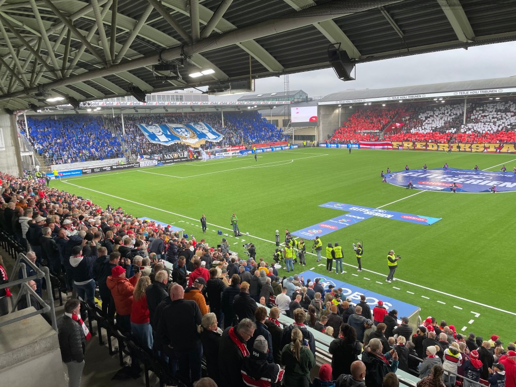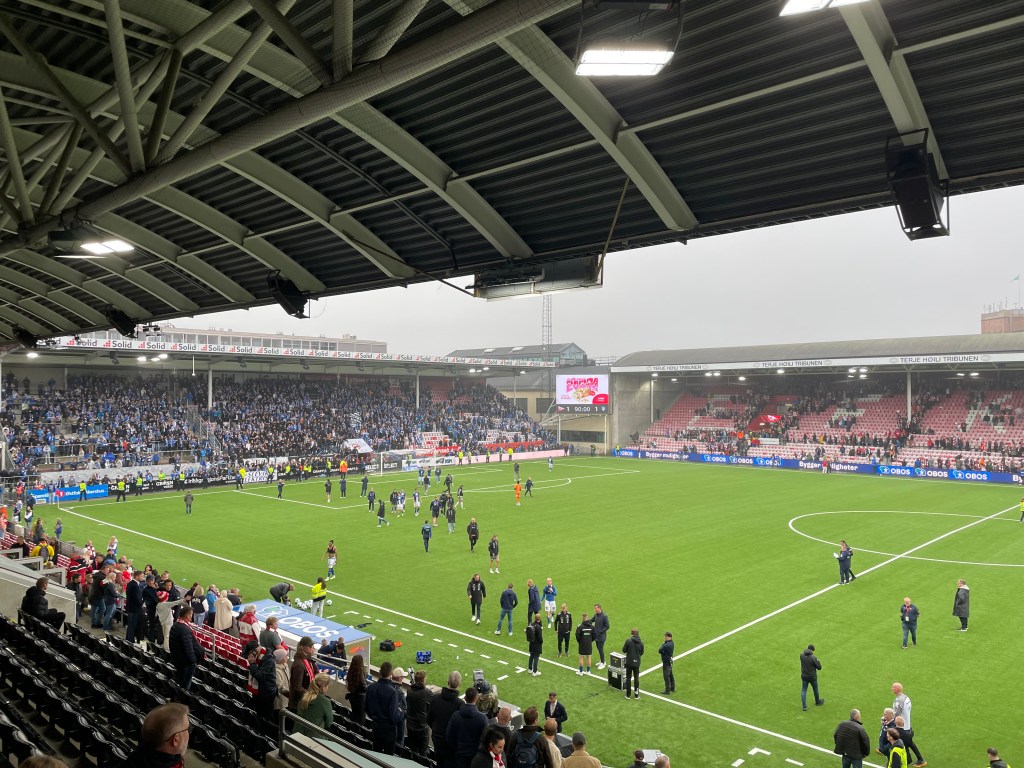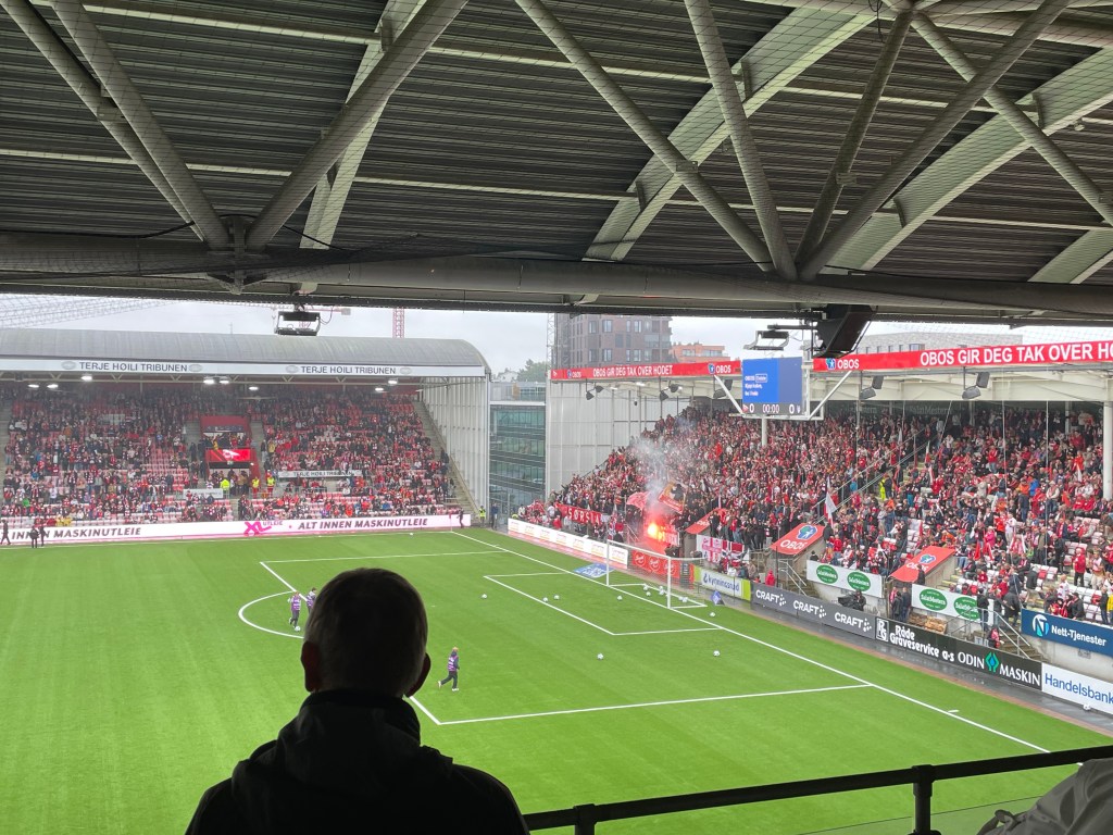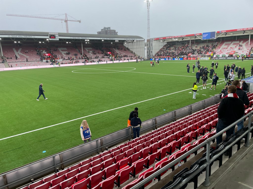 Ganz zweifelsfrei konnte ich das alles nicht klären- aber es wirkte so, als hätte ich unbegrenzten Zugang im Stadion. Mein Norwegisch reichte aus, um den kleinen Presseraum zu finden. Nach einer kleinen Orientierungsphase gelangte ich dann in die Mixed Zone und konnte auch an den Kabinen vorbeilaufen und bis an den Spielfeldrand. Das war schon ein ziemlicher kleiner Jungen Traum, der in diesem Moment in Erfüllung ging. Ich wollte meine „Rechte“ nicht überstrapazieren und verzichtete daher auf einen Spaziergang im Innenraum. Anstattdessen suchte ich mir einen Platz auf der Pressetribüne. Die erste war rappelvoll- aber es gab auf der anderen Seite noch eine. Entspannt fand ich dort einen Platz. Bis zum Anpfiff war ich dann aber von Kindern, Feuerwehrmenschen und anderen Konsorten umgehen. Schon krass wie selbstverständlich Leute sich da auch immer hinsetzen. Ich dachte nur die Hopper wären frech?