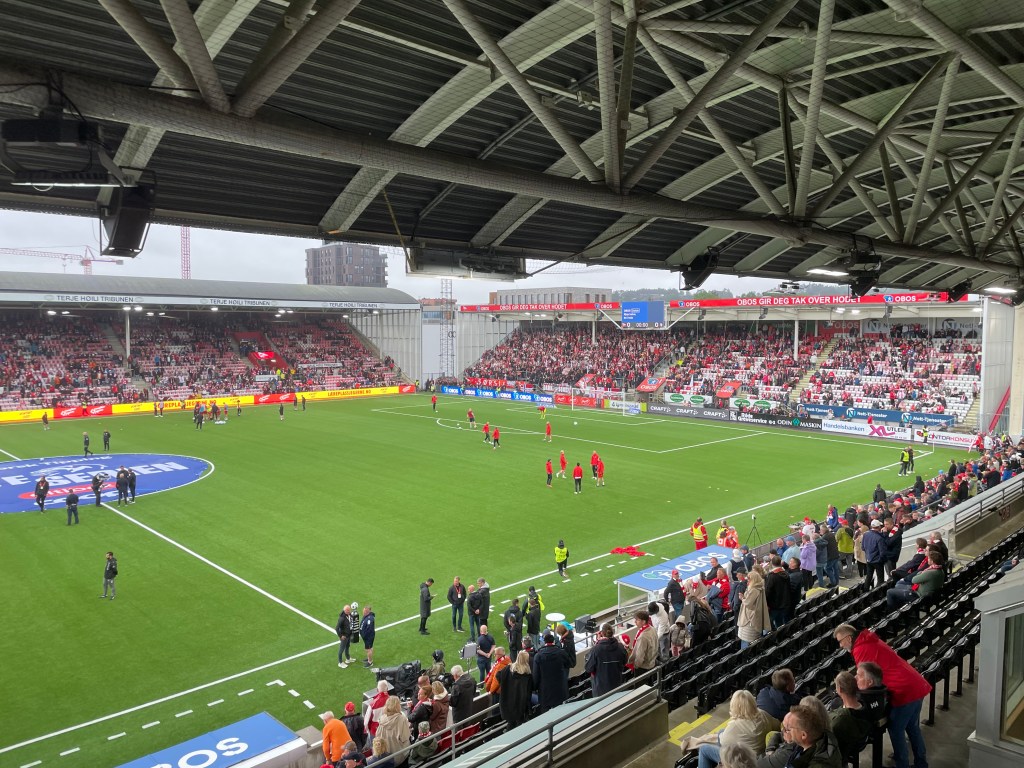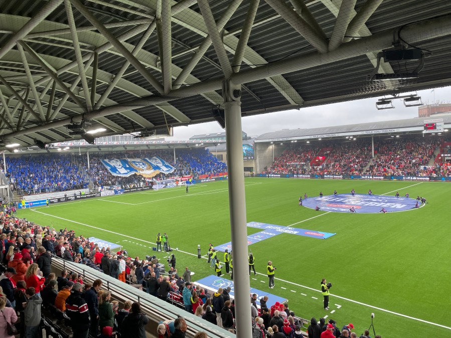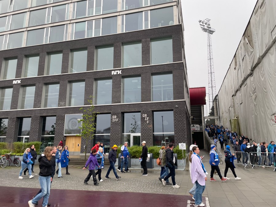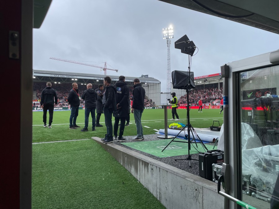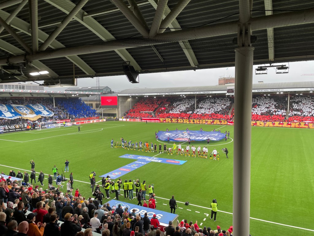 Ganz zweifelsfrei konnte ich das alles nicht klären- aber es wirkte so, als hätte ich unbegrenzten Zugang im Stadion. Mein Norwegisch reichte aus, um den kleinen Presseraum zu finden. Nach einer kleinen Orientierungsphase gelangte ich dann in die Mixed Zone und konnte auch an den Kabinen vorbeilaufen und bis an den Spielfeldrand. Das war schon ein ziemlicher kleiner Jungen Traum, der in diesem Moment in Erfüllung ging. Ich wollte meine „Rechte“ nicht überstrapazieren und verzichtete daher auf einen Spaziergang im Innenraum. Anstattdessen suchte ich mir einen Platz auf der Pressetribüne. Die erste war rappelvoll- aber es gab auf der anderen Seite noch eine. Entspannt fand ich dort einen Platz. Bis zum Anpfiff war ich dann aber von Kindern, Feuerwehrmenschen und anderen Konsorten umgehen. Schon krass wie selbstverständlich Leute sich da auch immer hinsetzen. Ich dachte nur die Hopper wären frech?