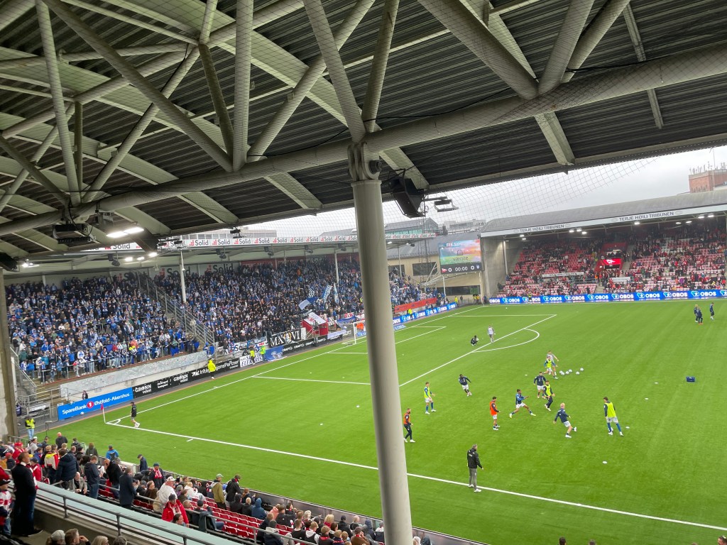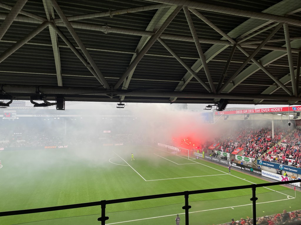 Die Heimseite zündete immer mal wieder eine Emotionsfackel und hatte über weite Strecken die stimmungstechnische Oberhand. Der Mob war auffällig jung und typisch skandinavisch gut gekleidet. Dennoch wirkte die Heimseite reifer. Kurios war der „I love Milfs“ Doppelhalter. Zur zweiten Halbzeit starteten beide Kurven noch einmal mit einem Intro, wobei auch da der klare Punkt an die Heimseite ging. In der Gästekurve sah das echt nach einem kleinen Patzer aus.