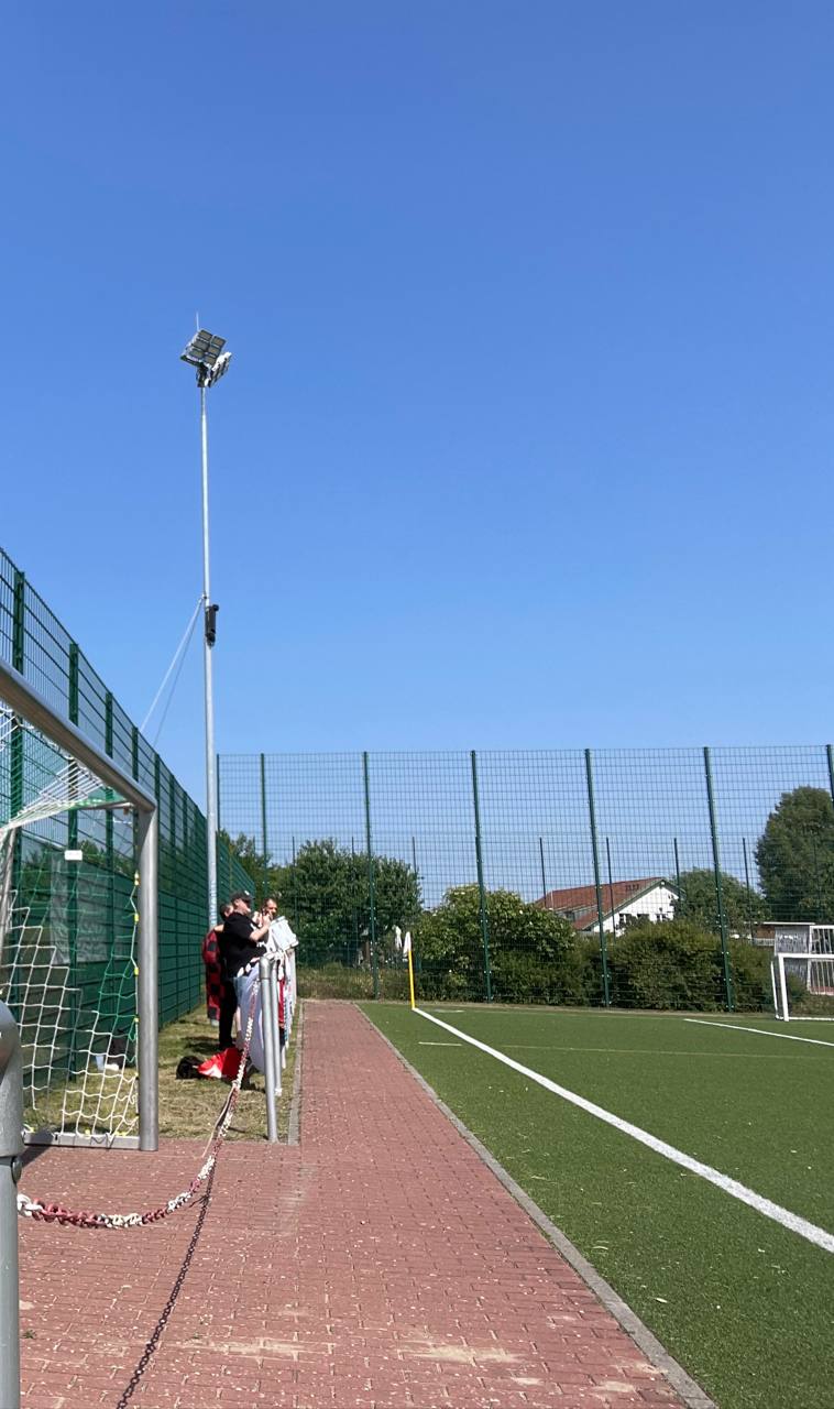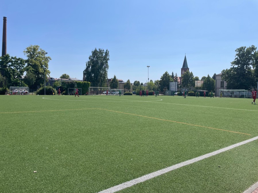 Leider wurde das Spiel heute auf dem Kunstrasen ausgetragen. Wir fragten hier und da mal nach dem Grund. In der Regel brach es dann aus den Leuten heraus, sodass man merkte, dass nicht jeder im Verein glücklich darüber war, dass der Rasenplatz von der Stadt gesperrt wurde. Wenn man es nicht mal schafft im Juni einen Rasenplatz freizugeben, dann haben wir ein Problem. Der Kunstrasen war dann leider ziemlich highlightlos. Mehr als ein Stankett war da nicht- aber immerhin gab es ein kleines Vereinsheim, samt vorgelagerten Grill, sodass wir bei den heißen Temperaturen hydriert bleiben konnten.