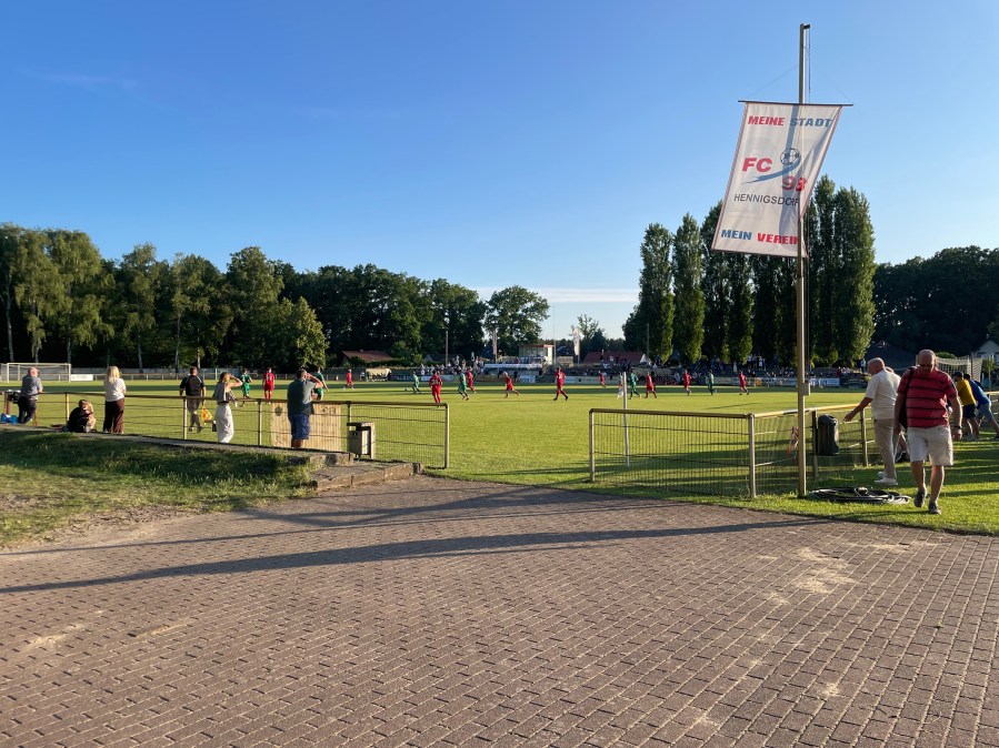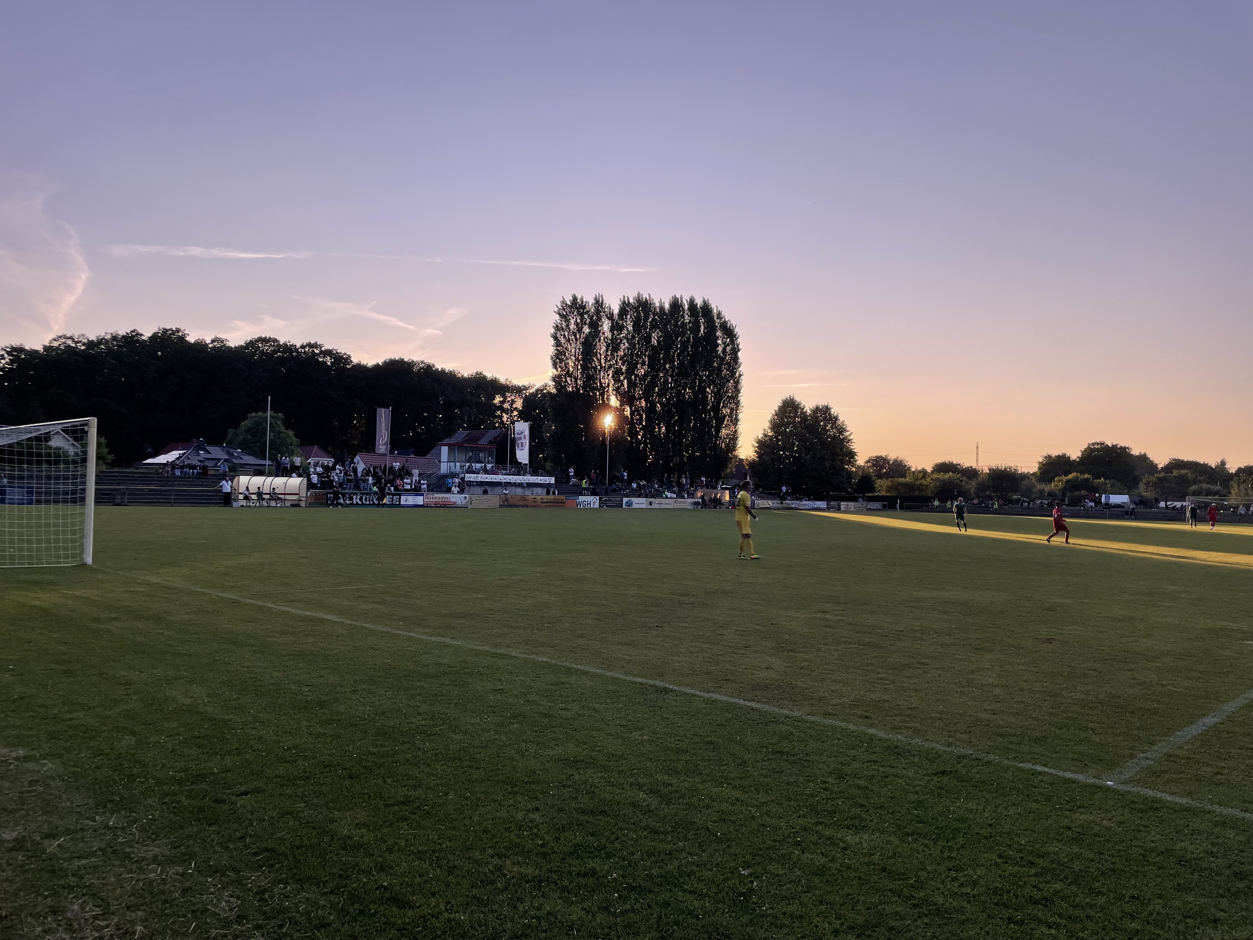 Nun war endgültig der letzte Pflichtspieltag in der erweiterten Umgebung angebrochen. Klar, dass dieser nicht ohne mich stattfinden konnte. Freitagabend Hennigsdorf? Count me in! Ich entschied mich auf dem Hinweg für eine Zug und Fahrradkombi. Ich war mal wieder auf dem letzten Drücker unterwegs, um die Zeit zu Hause zu maximieren (bei stündlichem Zugangebot war das Angebot begrenzt…). 19:26 kam ich am Bahnhof an, sprang auf das Fahrrad, fuhr in die falsche Richtung, korrigierte den Fehler und war dann drei Minuten nach Anpfiff an der Sportanlage. Noch schnell eine Eintrittskarte für nen Fünfer geschossen und dann sah ich gerade noch den Führungstreffer für die Heimmannschaft.