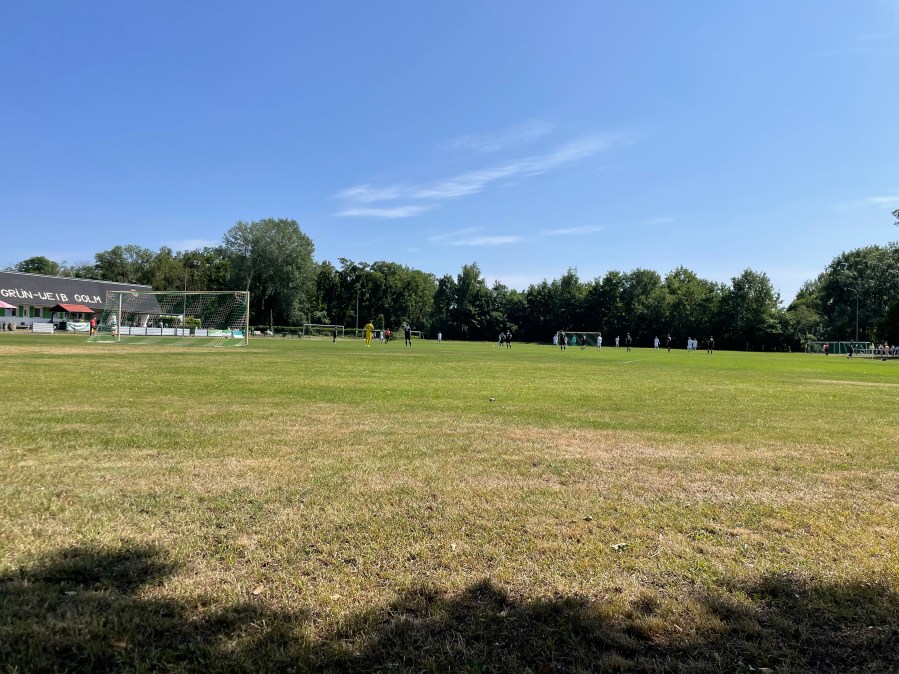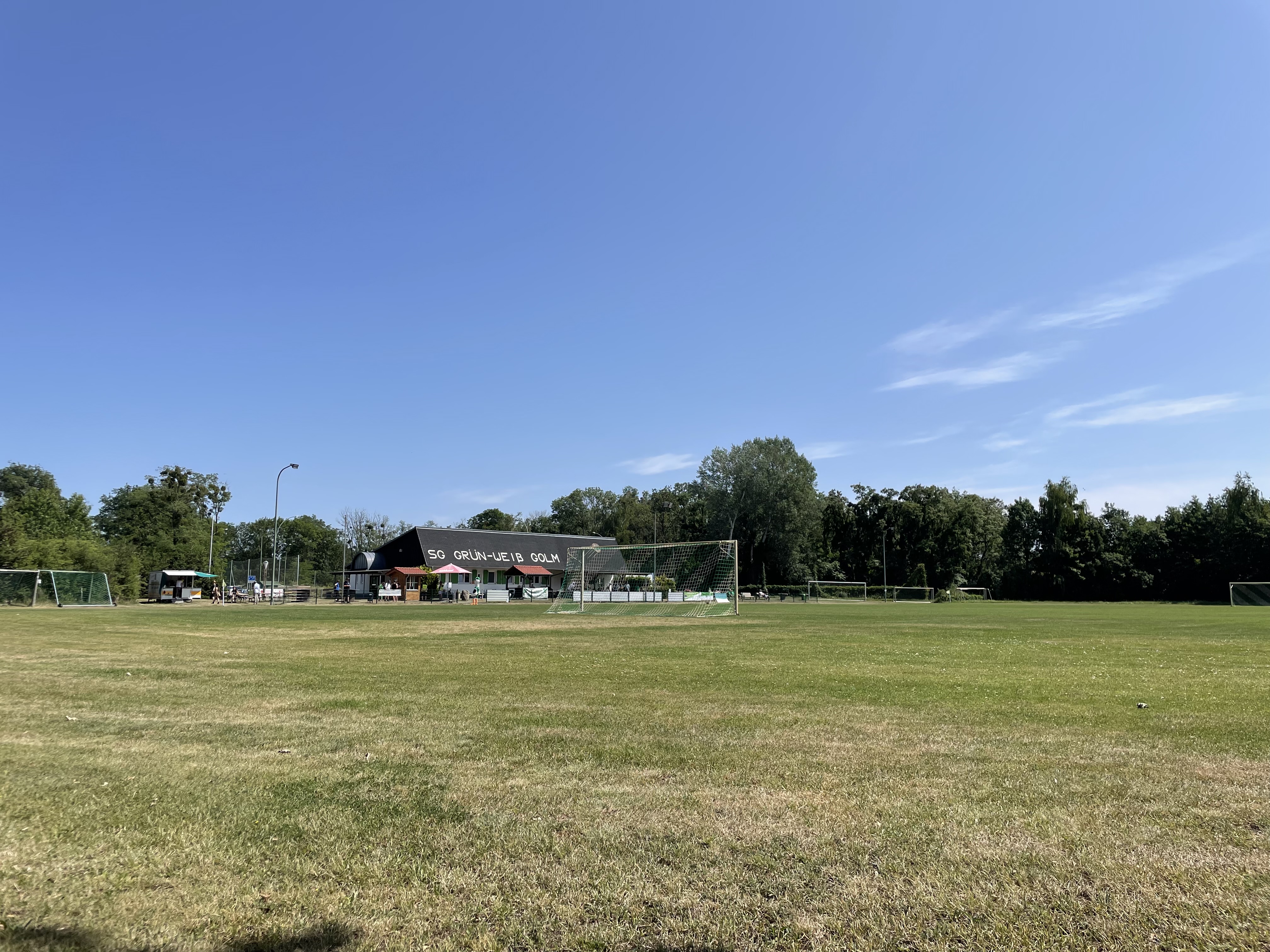 Die Lage war prekär. Das Portemonnaie elegant zu Hause vergessen. Die Mitstreiter noch nicht einmal losgefahren und wir schon auf der Sportanlage. Davor zu warten war nicht die erbaulichste Option, sodass wir die Lage kurz beobachteten und dann per Schlenker, um die Kasse herumliefen. Nicht ganz ideal, aber in der Situation sicher moralisch vertretbar. Wir suchten uns einen Platz auf der Wiese hinter dem Tor mit ausreichend Platz für Unfug, Gekicke und weitere lustige Aktivitäten.