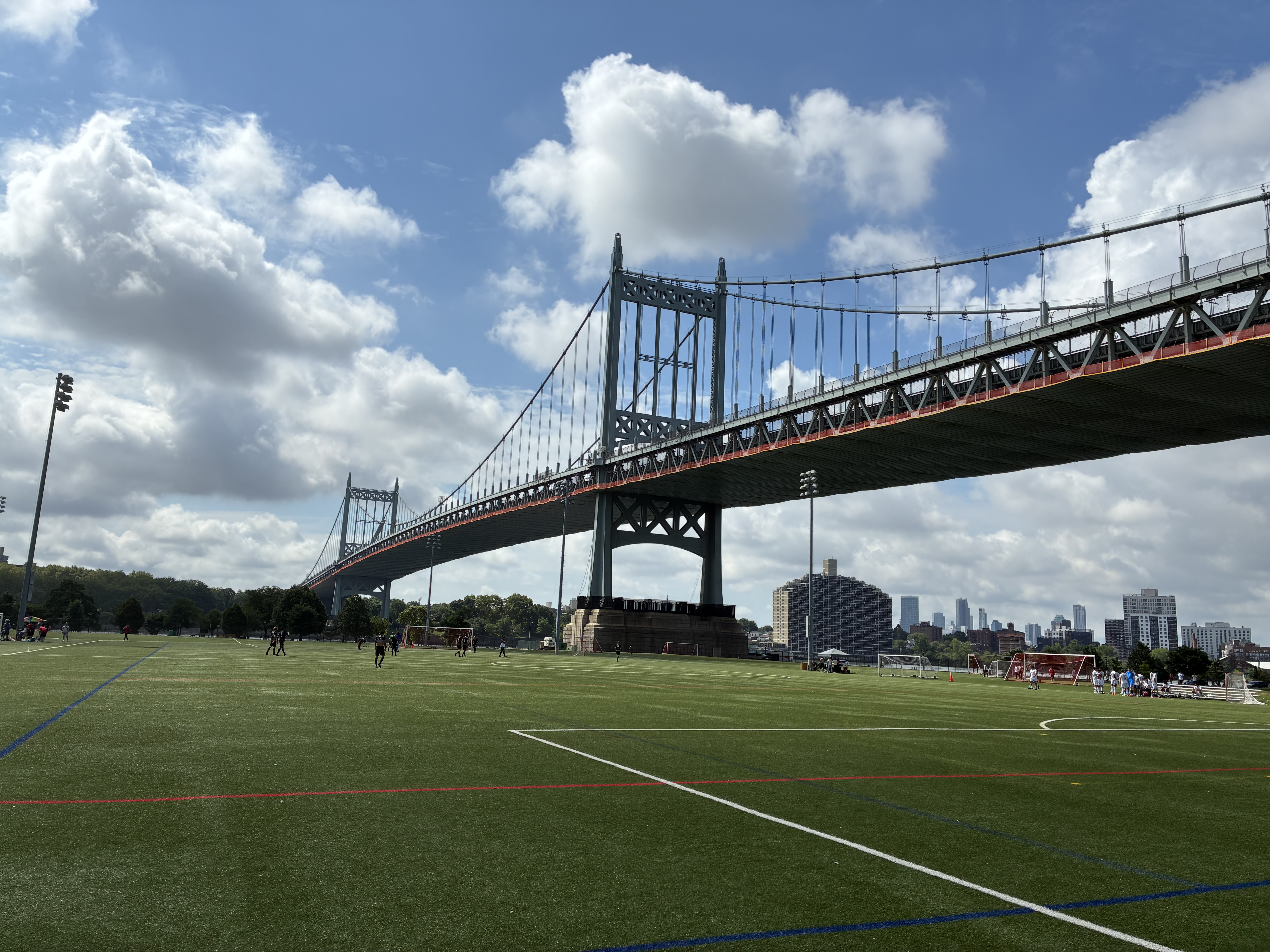 Bei einmal mehr knackigen Temperaturen erreichte ich dann irgendwann die Brücke, die mich auf die Randall’s Island führen sollte. Auch dank eines leicht verspäteten Anpfiffs, verpasste ich am Ende kaum etwas. Die Insel ist schon absolut überragend. Motorisierte Fahrzeuge sind hier kaum zu finden und im südlichen Bereich der Insel sind zahlreiche Fußballplätze angesiedelt. Mein auserwähltes Spiel der Freizeitliga fand auf dem Feld #75 statt. Der Platz bot eine spektakuläre Aussicht auf die Hell Gate Bridge. Davon abgesehen waren das einfach Fußballplätze ohne große Highlights.