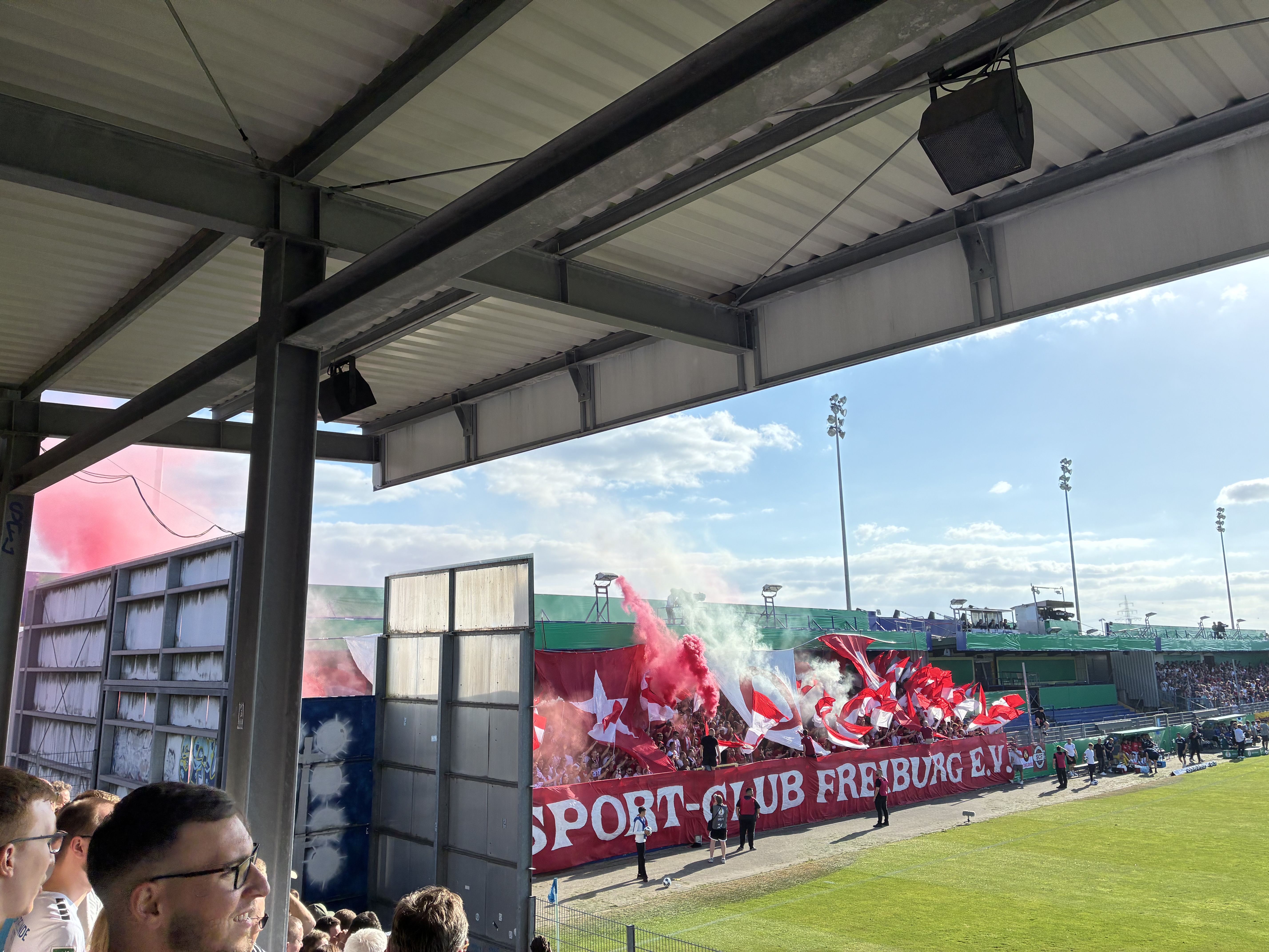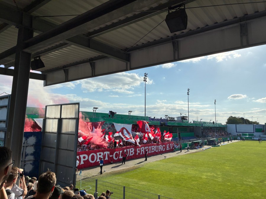 Der Gästeblock startete mit einem Wimpelintro in die Partie. Auf vier Wimpeln wurde das Gründungsjahr 1904 in den Block gezaubert und dazu etwas Rauch gezündet. Der Wind sorgte für einen umklappenden Wimpel und eine nicht optimale Rauchentwicklung. Der Auftritt danach war solide. Von meinem Standort konnte ich den Block gut sehen und hören. 1-2 schöne Lieder und Momente waren definitiv dabei. Ansonsten merkte man dem Block die Sommerpause an und nicht alles lief völlig reibungslos. Dennoch ein grundsolider Auftritt. Beachtlich waren die vielen Freiburger im neutralen Bereich. Sicher die Hälfte der anwesenden 6.000 Zuschauer hielt es mit dem SCF.