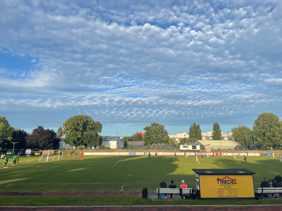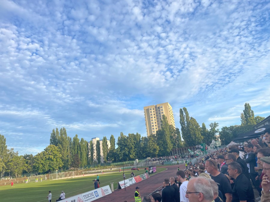Das Preußenstadion in Berlin hat kein Flutlicht und somit müssen Spiele unter der Woche selbst im Sommer um 17:30 angepfiffen werden. Das stellte mich am heutigen Dienstag vor einige Probleme. Ein Arbeitstermin verzögerte sich und so kam ich erst deutlich später los, als mir lieb gewesen wäre. Ich änderte die Verbindung wieder eigenhändig und so kam ich um 17:27 am Stadion an und traf auf eine gewaltige Schlange. Glück im Unglück, dass ich eine große Gruppe Herthaner erspähte und somit ein bisschen schummeln konnte. So richtig viel brachte es nicht, denn die Schlange bewegte sich in Zeitlupe auf den Eingang zu. Krass, wie es Britz in der letzten Woche so gut hinbekommen hat und der BFC heute an dieser Aufgabe krachend scheiterte. So betraten wir dann erst zur 15. Minute das Stadion. Maximal bitter!