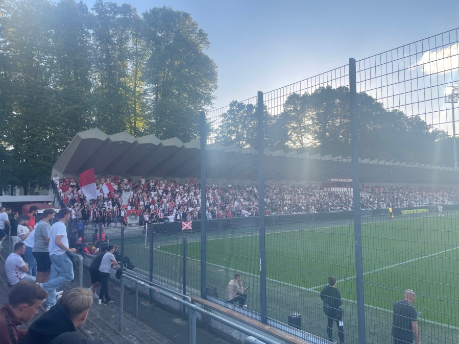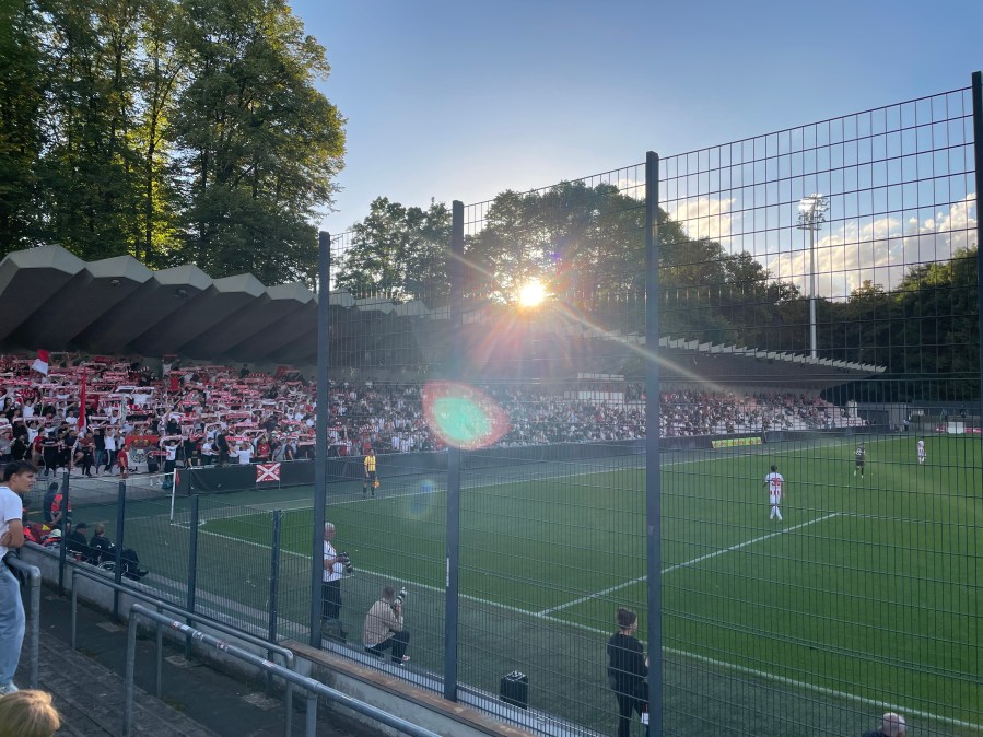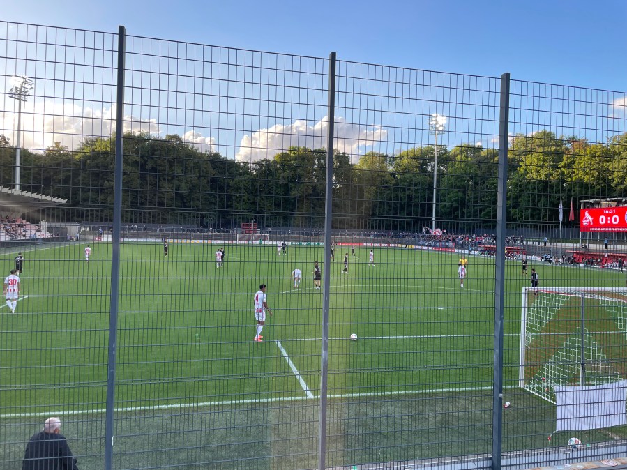 Dann schwang ich mich auf das Fahrrad und radelte durch den Stadtwald zum Franz-Kremer Stadion. Auf dem Weg machte ich noch einen Schwenk, um Geld abzuheben. Zu groß war die Angst nur mit Bargeld zahlen zu können. Am Ende wäre dieser Umweg absolut nicht nötig gewesen, denn man konnte sogar nur mit Karte bezahlen. Verrückte Welt! Eine Minute vor Anpfiff kam ich dann in das Stadion und traute meinen Augen kaum. Die Fanszene des 1. FC Köln war am Start.