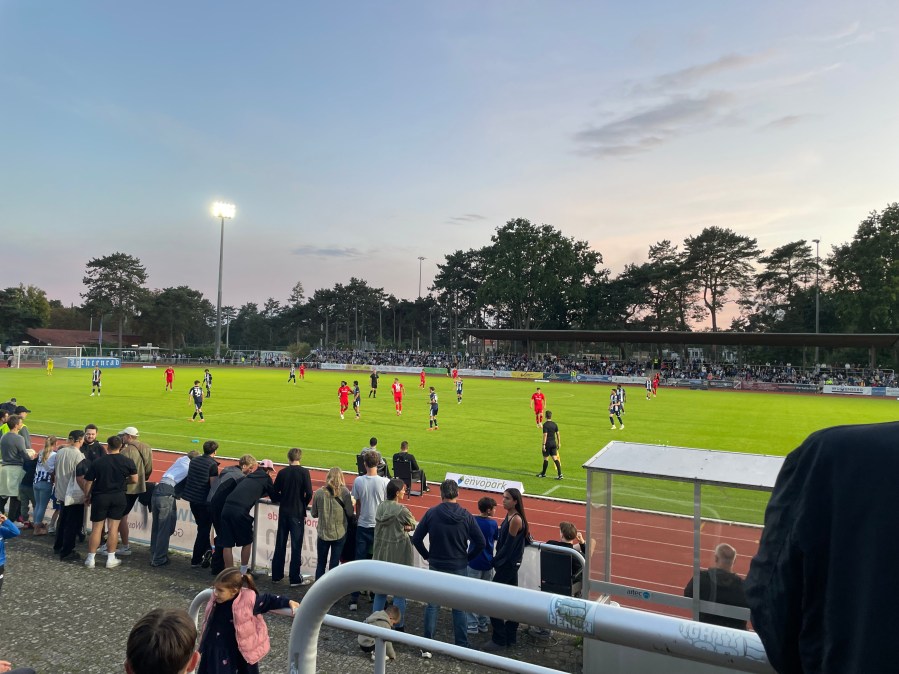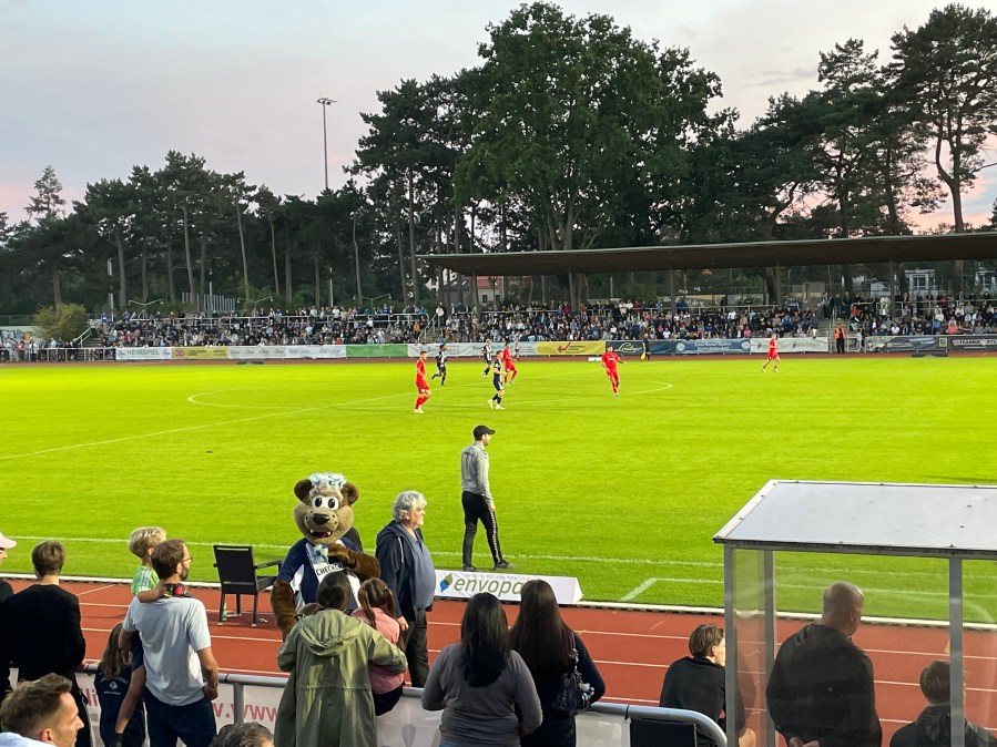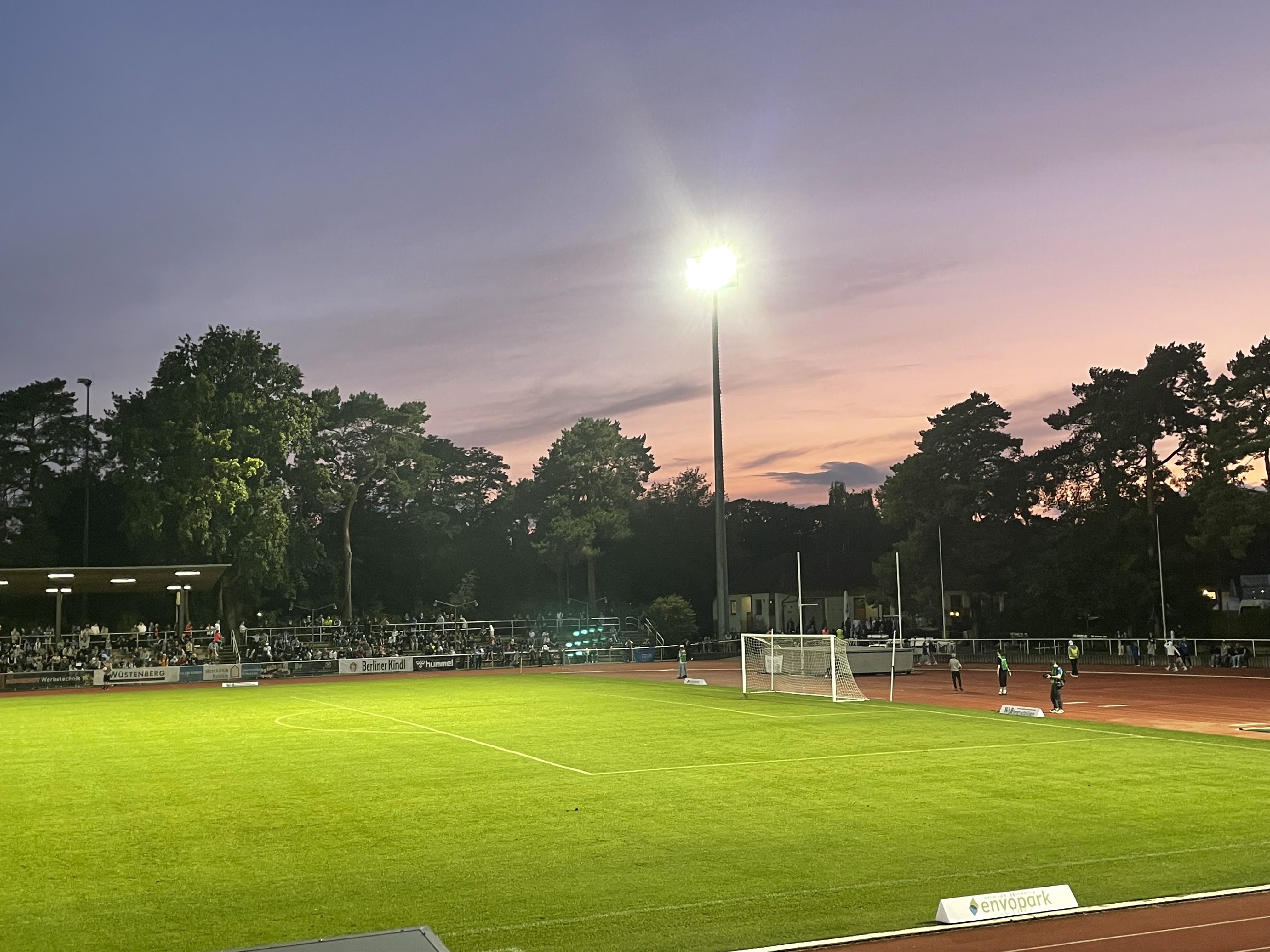 2019 war ich zuletzt im Ernst-Reuter-Sportfeld in Zehlendorf. Es wurde Zeit dort mal wieder vorbeizuschauen. Gefühlt ist ein Testspiel gegen Hertha Zehlendorf in einer der ersten Länderspielpausen der Saison mittlerweile schon Tradition. Nach einem wechselhaften Tag setzte sich am Abend die Sonne durch und mit leichter Vorfreude fuhr ich in Richtung Stadion. Mit dem Bus ging es die letzten Kilometer zu ebenjenem und kurz vor dem Eingang traf ich Südberliner Prominenz. Am Eingang machten wir noch eine Zufallsbegegnung und waren somit ein Trio. Ab auf die Sonnenseite und dann waren wir bereit für das Spiel unserer Helden.