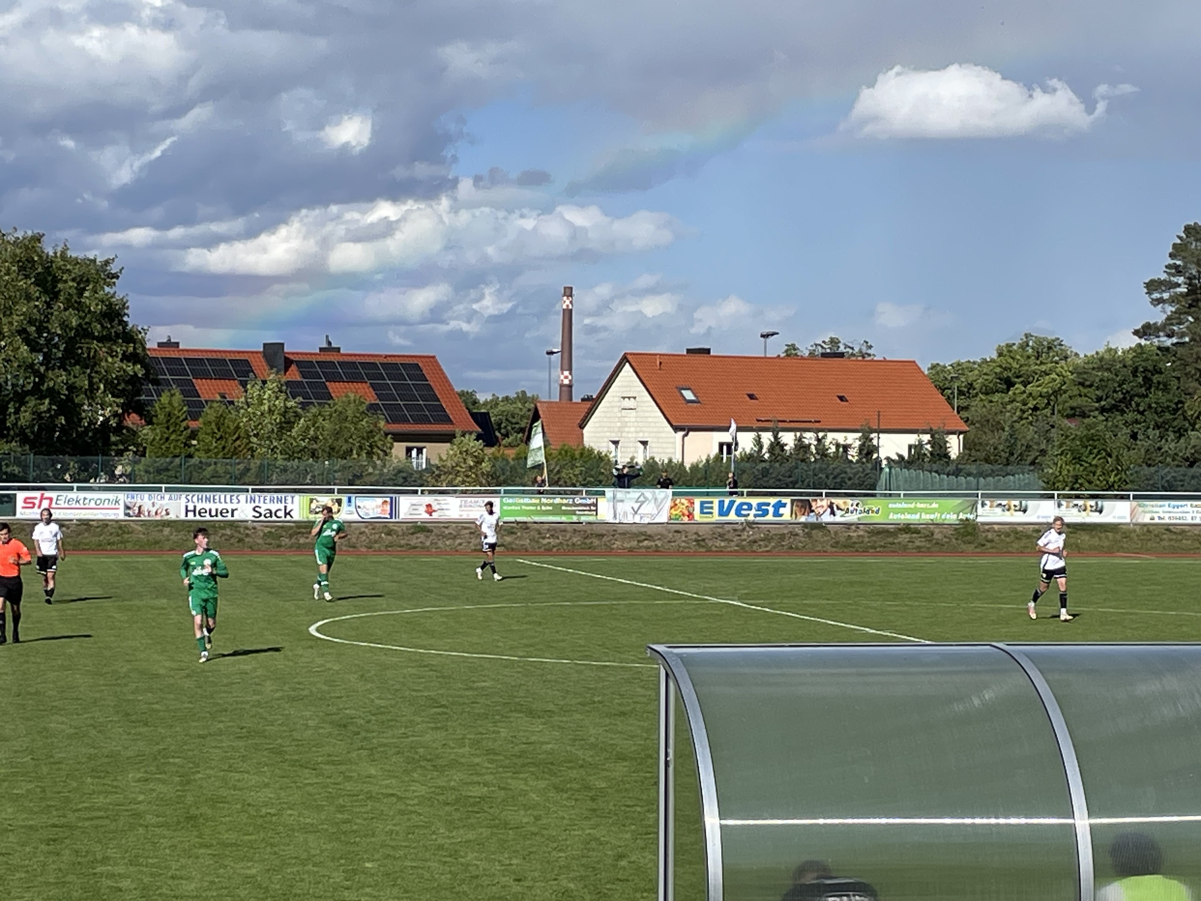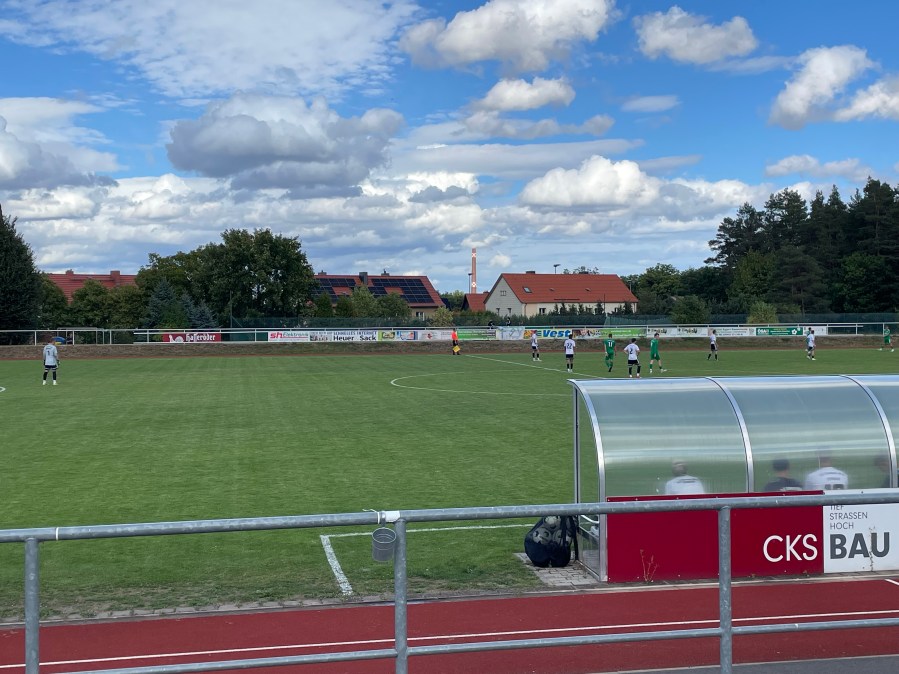 Die Sportanlage ist ganz hübsch mit einer kleinen Tribüne auf einer Seite. Neben Stufen waren auch einige Holzbänke verbaut. Dazu einen liebevoll gestalteten und großzügig angelegten Grillbereich mit Terrasse. Das Steak war der Wahnsinn. Im Hintergrund konnte man die sanften Ausläufer des Harzes erspähen. Das war eine wirklich schöne Nummer. Auf der gegenüberliegenden Seite versuchten sich drei Jugendliche an der Unterstützung der Mannschaft. Auch das restliche Publikum fiel nicht negativ auf. Das reicht mir in diesen Zeiten…