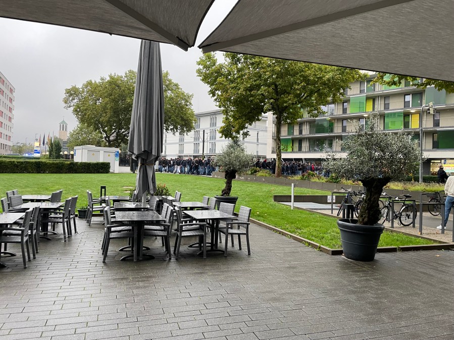 Dann checkte ich im Hotel ein und nutze die zeitliche Verfügbarkeit, um noch einen Saunagang einzulegen. Das schlechte Wetter gab mir dann auch die Entschuldigung, um nicht noch einmal in die Stadt zu düsen. Anstattdessen steuerte ich das nahegelegene und gut bewertete italienische Restaurant an. Ich gönnte mir die ersten Stücke meiner Pizza, als plötzlich eine Kolonne an Polizeifahrzeugen auftauchte, die nicht mehr abriss. Ich hatte ein bisschen darauf spekuliert und Glück gehabt, denn der Basel Corteo führte tatsächlich direkt an meinem Platz vorbei. Indiskret ließ ich meine Pizza links liegen und glotzte mir ein wenig die Augen aus. Das machte schon etwas her, wie der Mob fast durchweg in Schwarz gekleidet war. Kurze Zeit später war der Spuk vorbei, ich aß noch zu Ende, traf noch einige Vorkehrungen und setzte mich dann in die Straßenbahn zum Stadion.