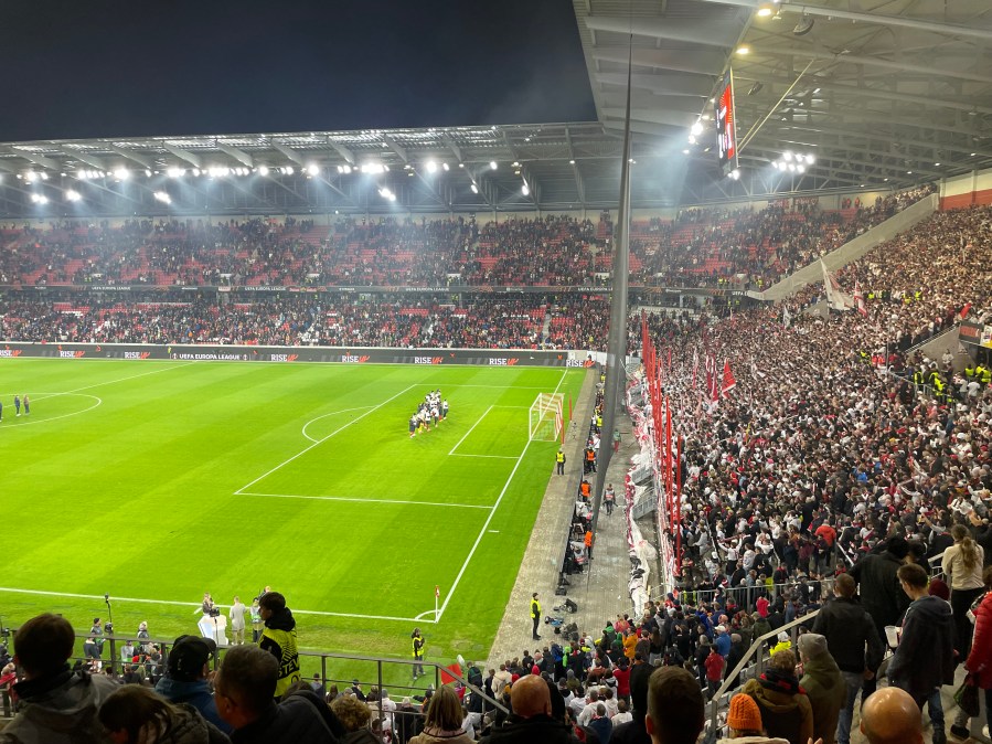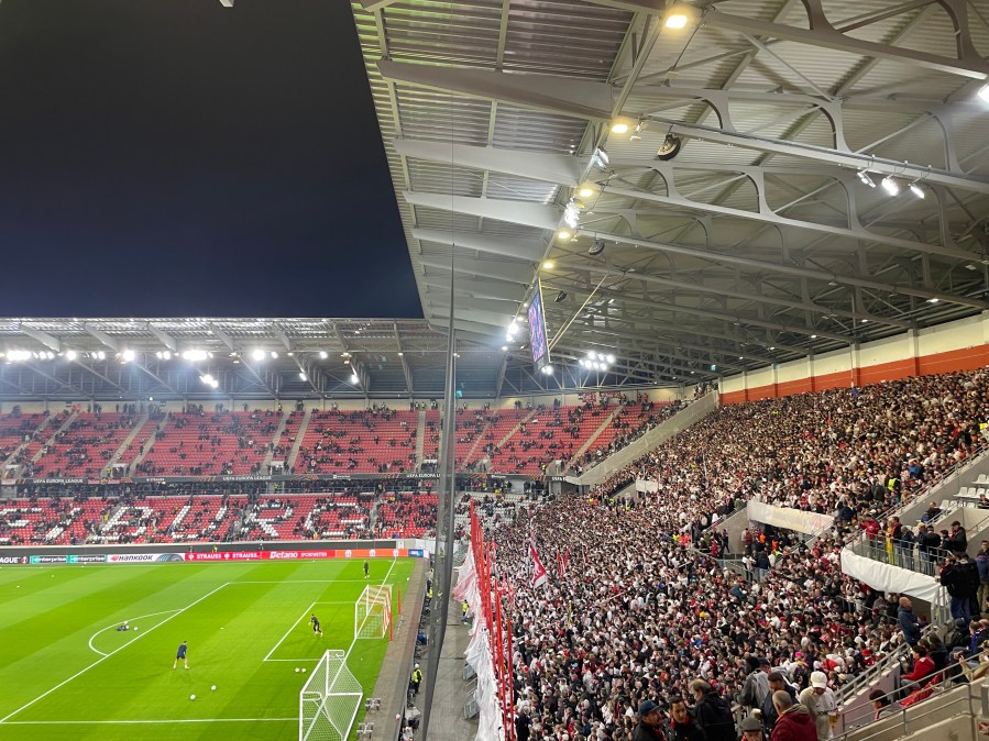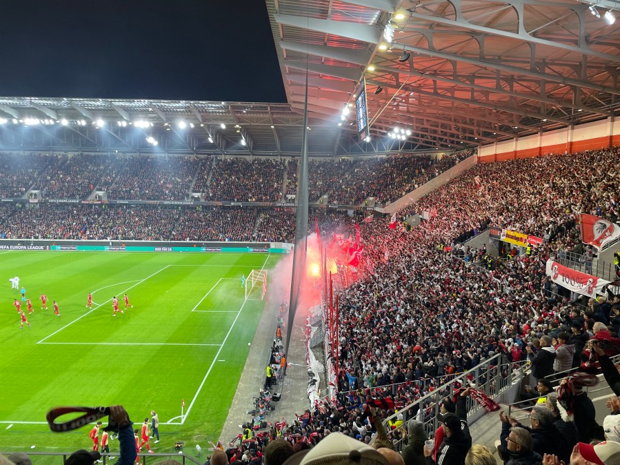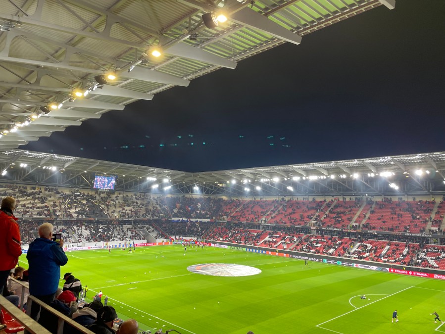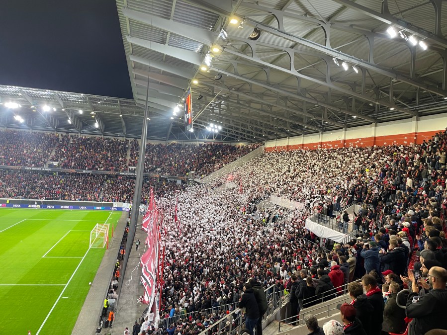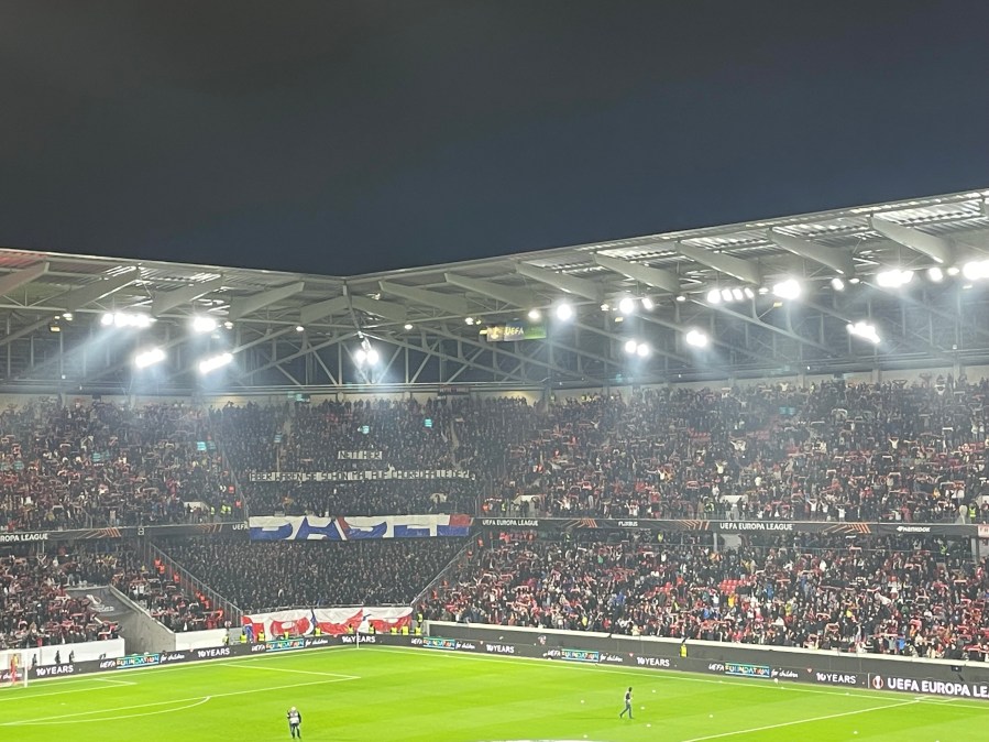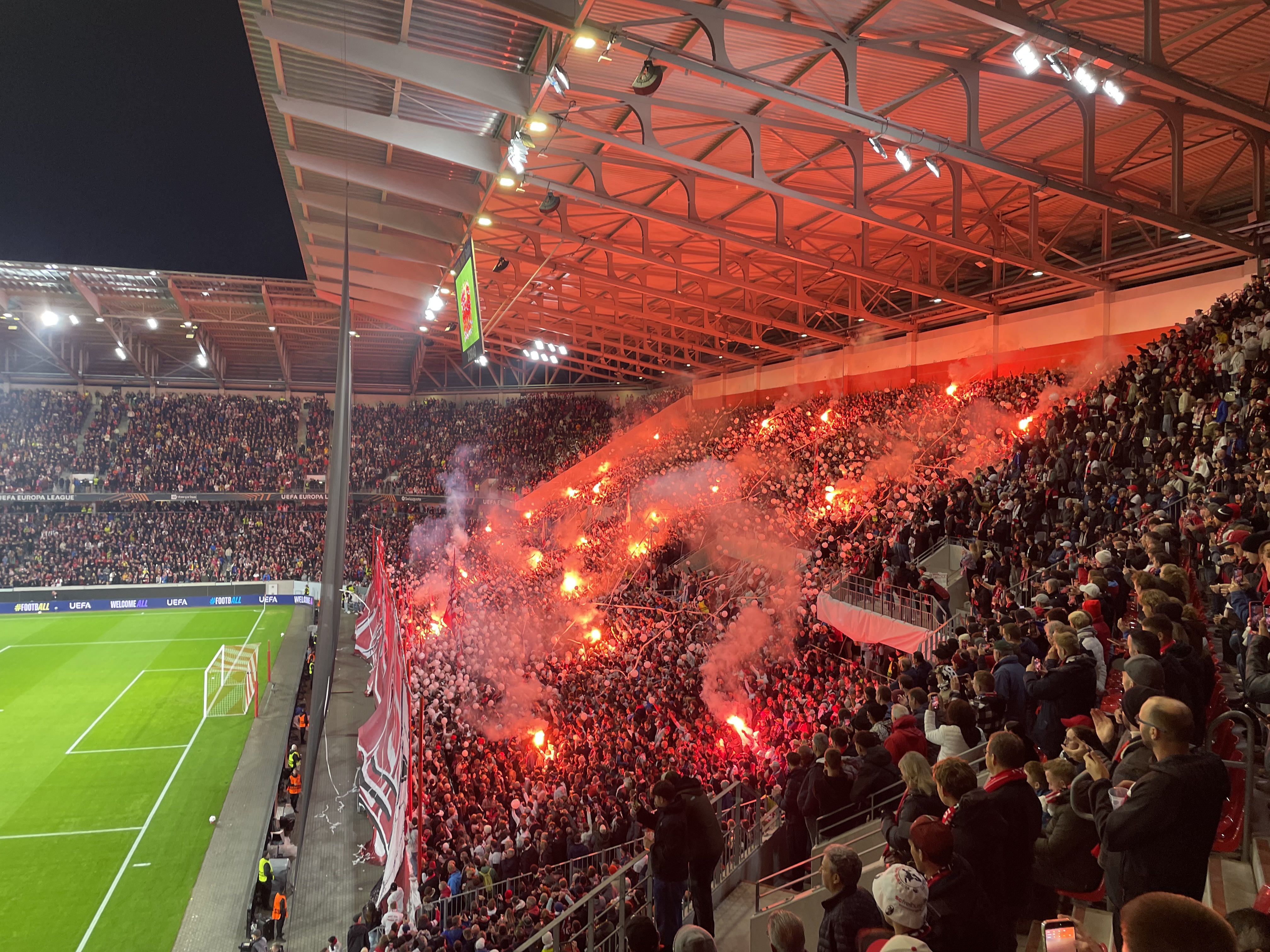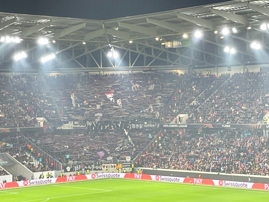 Positiv zu erwähnen ist, dass diese wirklich alle paar Minuten fuhr. Ich verstand aber nicht, warum die Haltestelle dann einen Kilometer vom Stadion war. Bei einem Neubau im Nichts, ist das doch wirklich besser planbar. Nun denn- circa 50 Minuten vor dem Spiel nahm ich meinen Platz im Stadion ein. Ich streifte den Umlauf der Kurve und nahm dadurch bereits die Ankündigungen für die Choreo wahr. Bereits beim Auflaufen der Mannschaft, ging in der Heimkurve die erste Fackel an und es wurde ziemlich laut. Das war definitiv Europapokalstimmung heute.