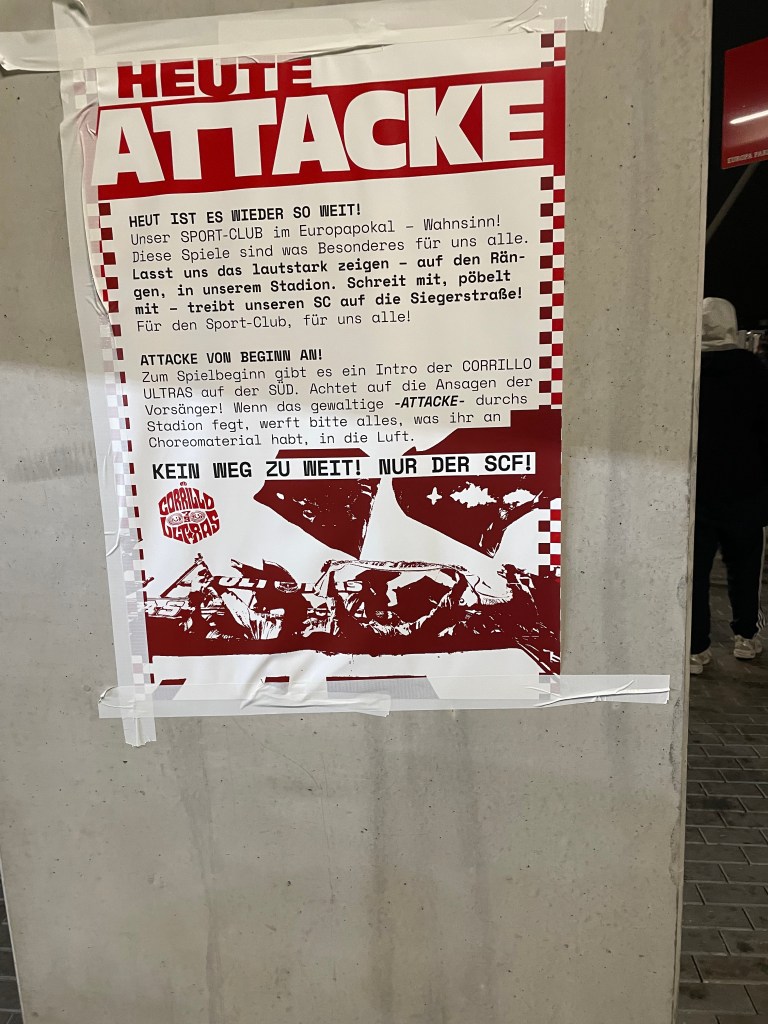 Die Heimkurve war solide. Immer mal wieder gingen Emotionsfackeln an. Die Emotionen beschränkten sich aber doch sehr arg auf den Kern der Kurve. An den Rändern und im oberen Bereich war die Mitmachquote dezimiert. Das schmälerte einen durchaus respektablen Auftritt der Freiburger Ultraszene erheblich. Per Spruchband kritisierte man noch den eigenen Verein für die Veröffentlichung eines Spieltagsschals und feierte danach noch ausgiebig mit der Mannschaft.