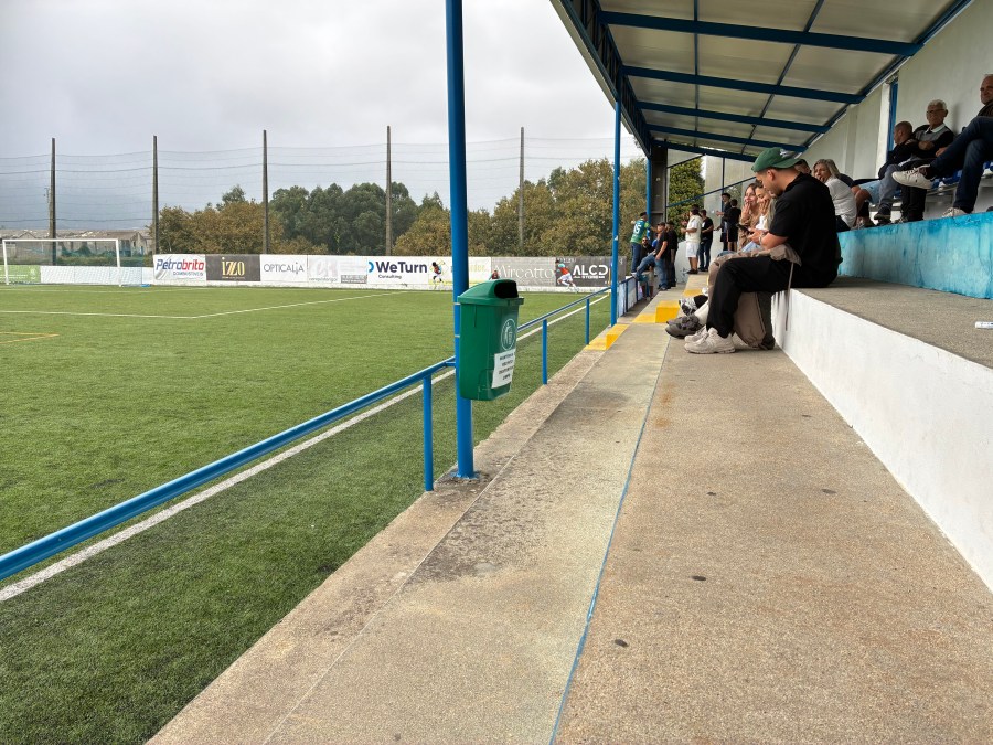 Es gab ein schönes, ranziges Vereinsheim und zwei Tribünen. Die Gäste befanden sich auf der kleinen Hintertortribüne. Ein kleiner sangesfreudiger Haufen von Heimfans, fand sich am äußersten Rand der Haupttribüne ein. Die Truppe brachte ein wenig Farbe in diesen Samstagnachmittag. In der Halbzeitpause zog der Pöbel ohne Ausnahme in die Kneipe und ließ die Fahnen unbewacht hängen. Durch einen cleveren Aufbruch war ich in der Schlange jedoch strategisch besser platziert und gönnte mir ein Fino mit Schnitzelbrötchen. Der Wirt, beehrte mich nach langer Zeit mal wieder mit dem wohl unlustigsten Kneipenspruch der Welt (Queria? Já Não Quer?)