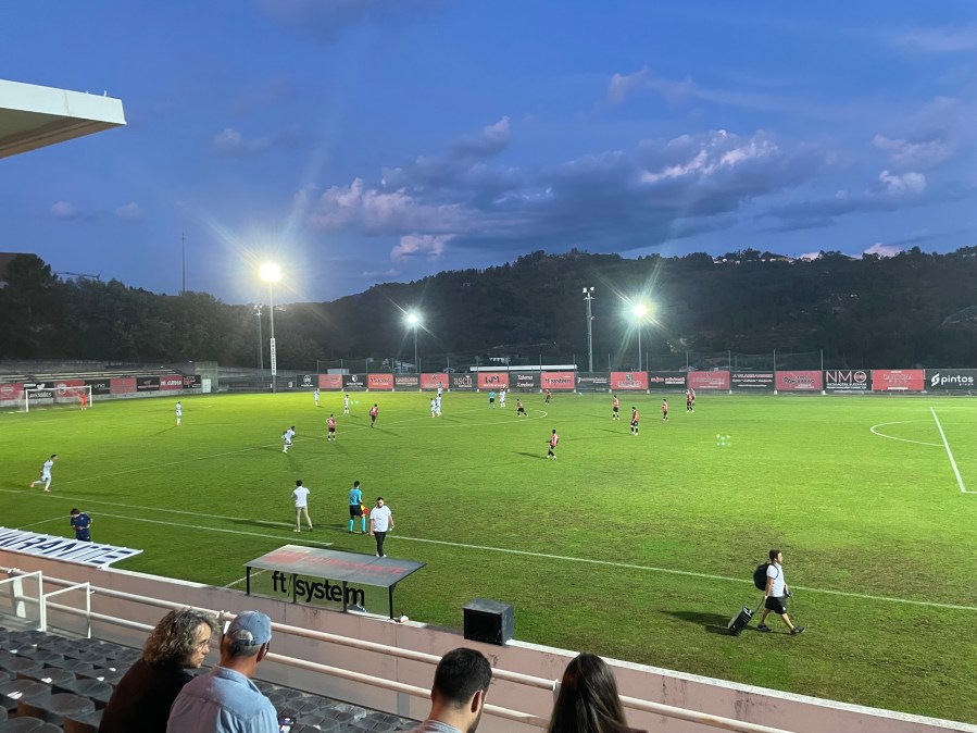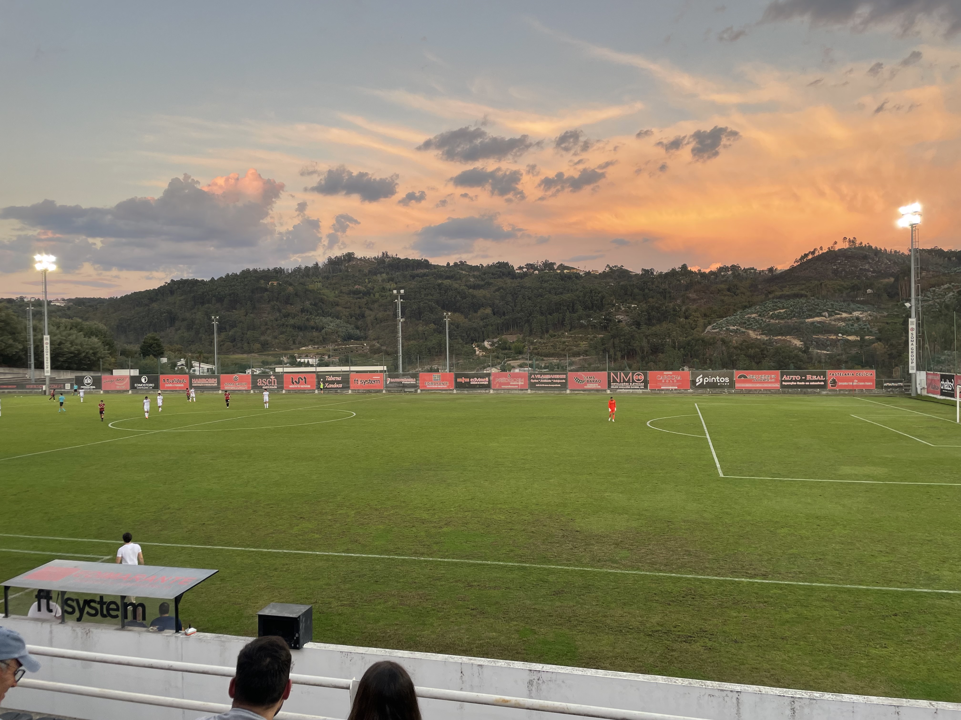Zum Glück war das heute nur ein Testspiel und die Rahmenbedingungen waren somit zu verschmerzen. Die Tribünen waren mit knapp 400 Leuten prächtig gefüllt. Es gab jedoch nur eine Handvoll Vitória Sympathisanten- der Rest war Fan des Heimvereins. Bemerkenswert. Das Stadion mit einer Tribüne und der Hügellage gefiel mir erneut recht gut. Der wunderschöne Sonnenuntergang war das unangefochtene Highlight des Spiels.