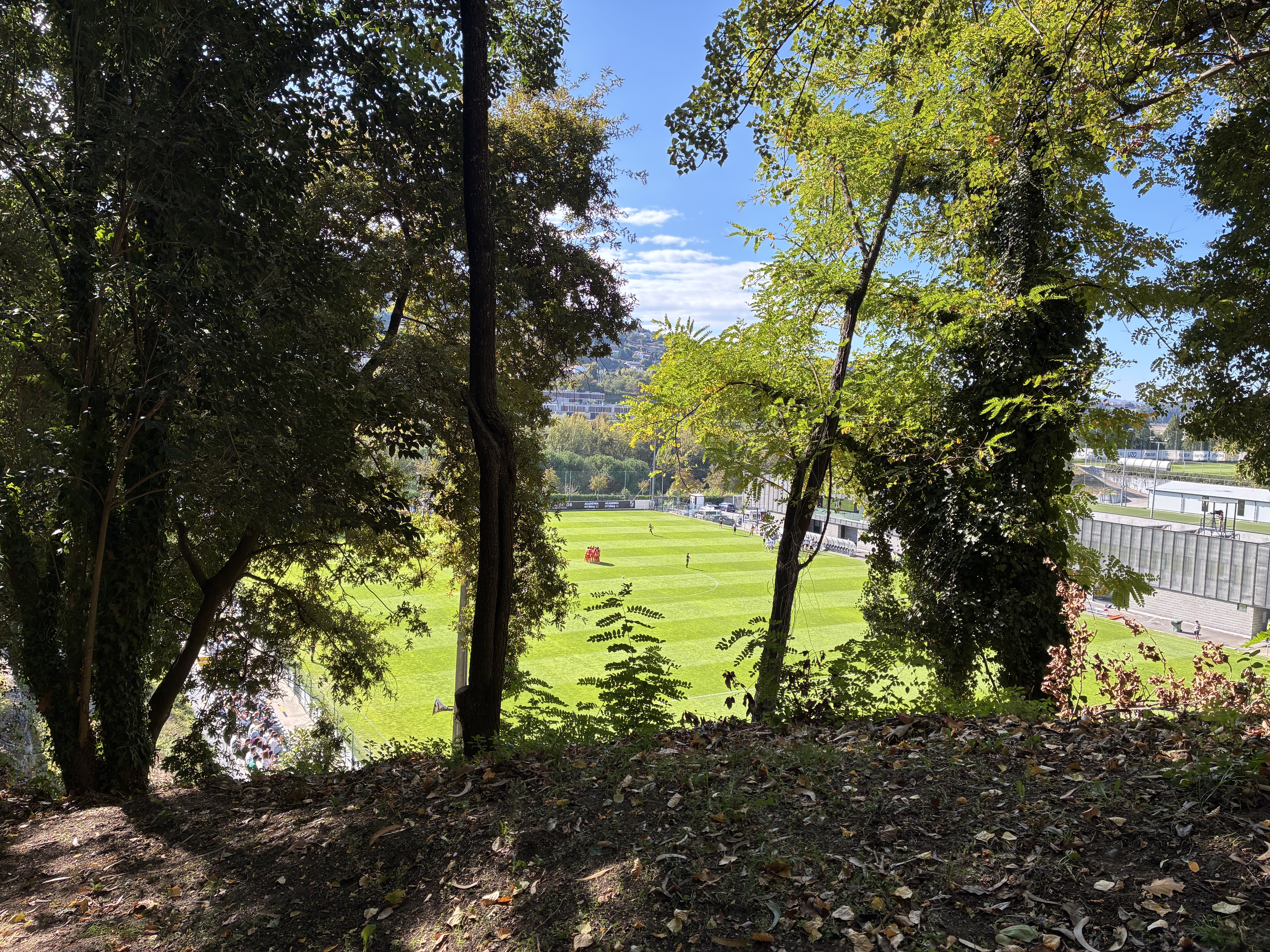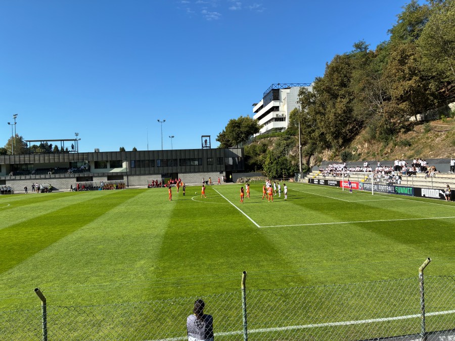 Dann ging es mit dem Auto in die schöne Stadt im Norden und ich steuerte dieses Mal die Vereinsakademie an, die am äußersten Rand der Kleinstadt liegt. Der naheliegende Park lud zum Spazieren ein, aber aufgrund der fortgeschrittenen Zeit lief ich zügig den Berg nach oben und kaufte mir eine Eintrittskarte für das Spiel. Auf dem Akademiegelände waren zahlreiche Plätze zu finden und die Frauen scheinen standardmäßig auf Platz 5 zu spielen. Um zum Spielfeld zu kommen, musste man die mühsam erklommenen Höhenmeter wieder abgeben. Dann wartete unten ein recht schmuckloser Platz mit Ausbau an zwei Seiten auf uns. Es gab lediglich Stufen und keine schattenspendende Tribüne, sodass die erstaunlichen 430 Zuschauenden ordentlich ins Schwitzen gerieten. Dafür war der Ausblick auf den angrenzenden Hügel sehenswert.