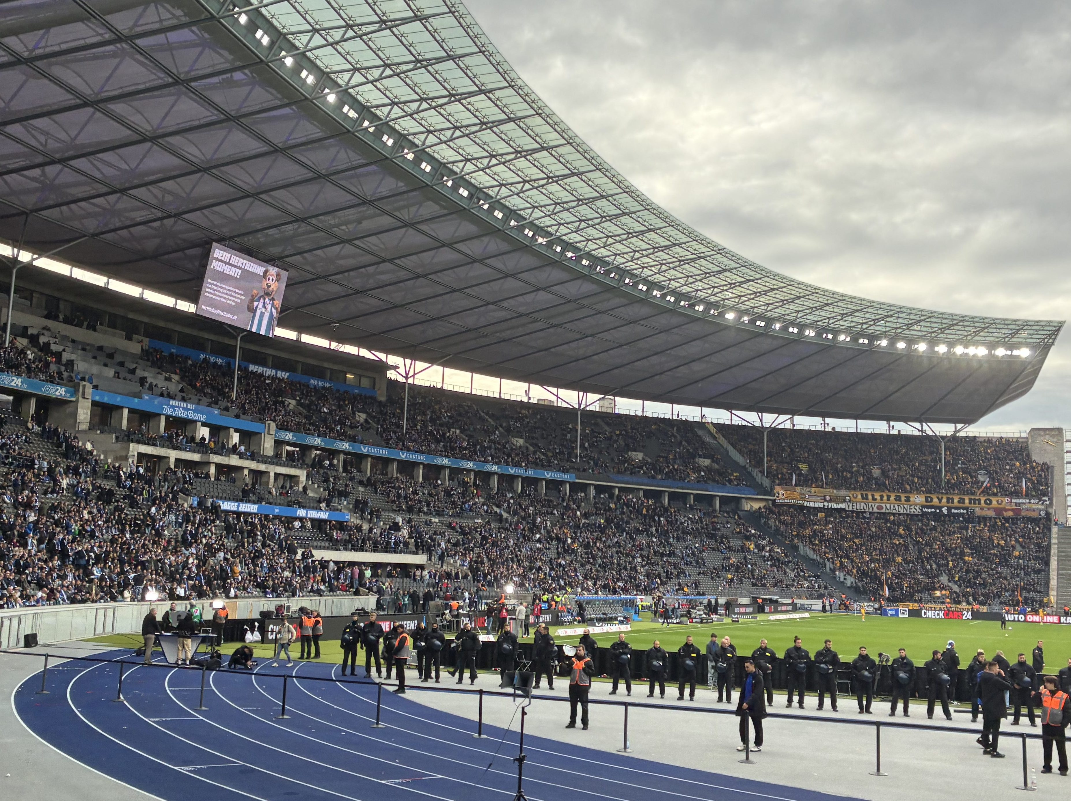 Schon früh hatte ich mich dafür entschieden das Spiel gegen Dynamo zu meinem 1.000 werden zu lassen. Ich war mir sicher, dass es auf den Rängen einen würdigen Rahmen geben würde und ich wollte das Spiel unbedingt mit Hertha machen. Ein gewisses Risiko bestand natürlich, dass das Spiel auf Rasen und Rängen in die Hose gehen könnte- aber ich blickte dem Tag mit viel Optimismus entgegen. Nachdem der Vorabend ruhig geblieben war, gönnte ich mir am Samstagmorgen zumindest etwas Ruhe und fuhr erst zur Stadionöffnung um 10:30 zum Olympiastadion. Der Einlass war recht unkompliziert und wenige Minuten später war ich beim Aufkleberverkauf. Der Andrang war in den Anfangsminuten enorm und in der Folge ging der Verkauf recht konstant seinen Gang. Circa 12:10 konnten wir ausverkauft vermelden. Durch den Verkauf verpasste ich die Rennerei im Stadion und erschloss mir anhand der Videos im Nachgang, dass ich zumindest den Moment durch die „Scheiß-Dynamo“ Sprechchöre mitbekommen hatte. Wenn mich meine Erinnerung der baulichen Begebenheiten des Olympiastadions nicht täuscht, dann hätte da auch wirklich schlimmeres passieren können. Bei einem Sturz hätte das für die Dynamos potenziell lebensbedrohlich enden können. Warum man so ein Risiko eingeht, erschließt sich mir absolut nicht.