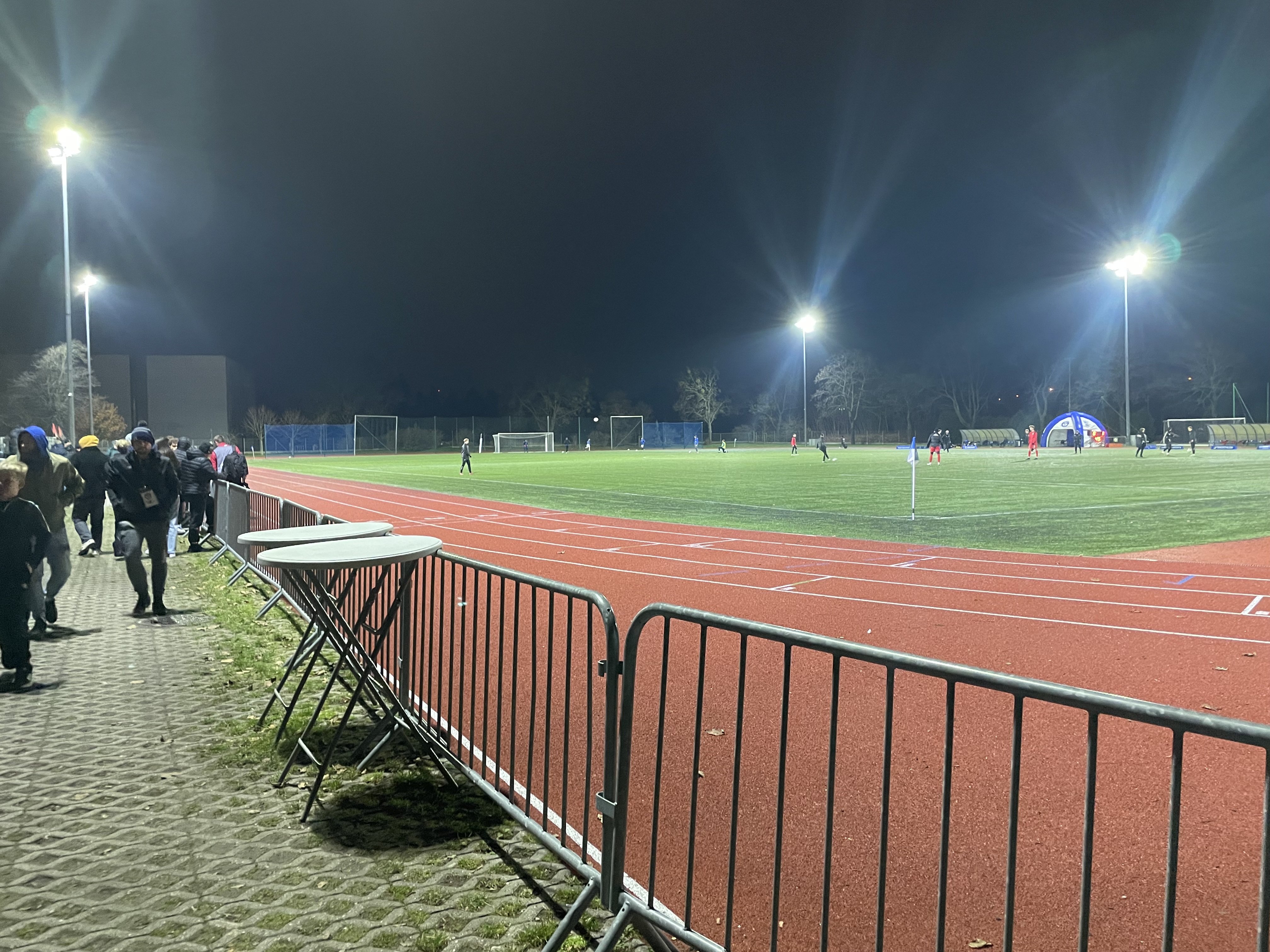 Der Sportplatz verfügte nur über einen Ausbau an einer Seite in Form einer kleinen Stahlrohrtribüne. Circa 20 Leute unterstützten direkt neben dem Eingang die Heimmannschaft. So musste ich an diesem Haufen vorbeiwatscheln, um einen Platz einnehmen zu können. Ob mein überschwappender Café die Situation auffälliger oder unauffälliger machte, ist nicht überliefert. Im abgesperrten Gästeblock unterstützten ein paar Kids die Mannschaft. In der Halbzeit wurde der Trennzaun aber geöffnet, damit die Gästefans zum Verpflegungsstand gehen konnten. Merkwürdig, dass trotzdem drei Polizeiwannen am Stadion waren und nach Abpfiff auch prominent vor dem Stadioneingang Aufstellung nahmen. Nötig war das definitiv nicht.