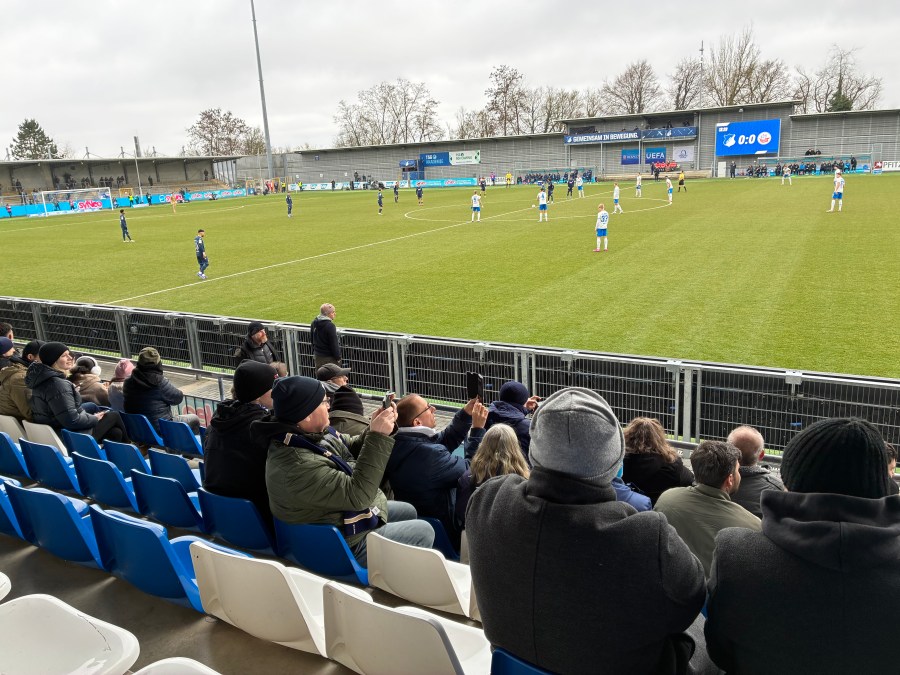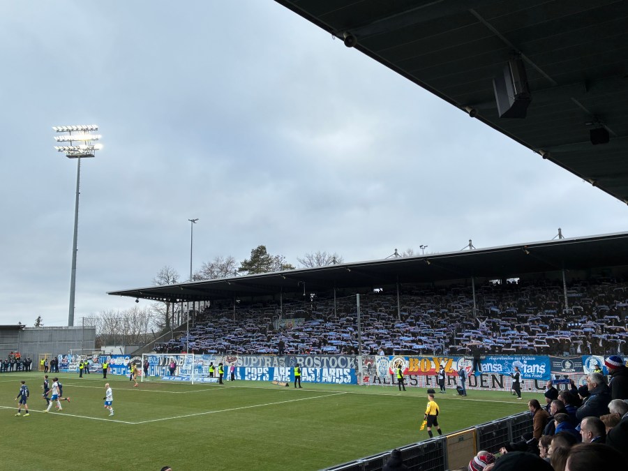 Mit bösen Blicken für den Ordner ging es dann hinein und es war erstaunlich wie viele Hansa Fans auch auf der normalen Tribüne zu finden waren. Dass war beispielsweise beim Spiel gegen Stuttgart II noch anders gewesen. Ich hatte keine Lust diesem Konstrukt noch durch Konsum Geld in den Rachen zu werfen und die Schlangen waren auch einigermaßen desolat. Also ging es direkt auf meinen Platz.