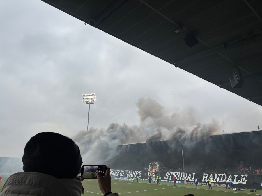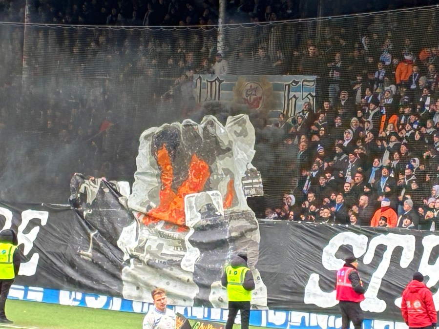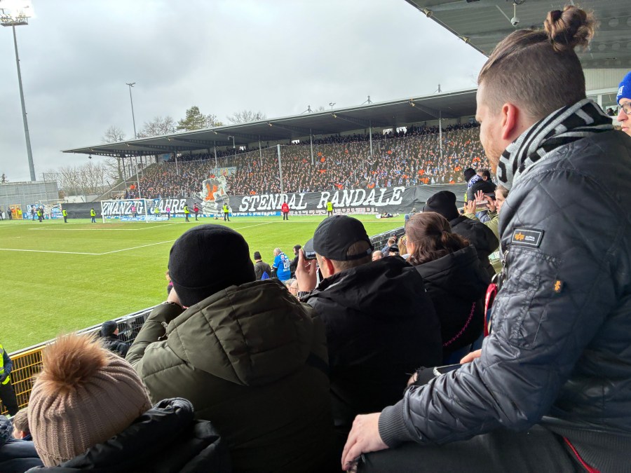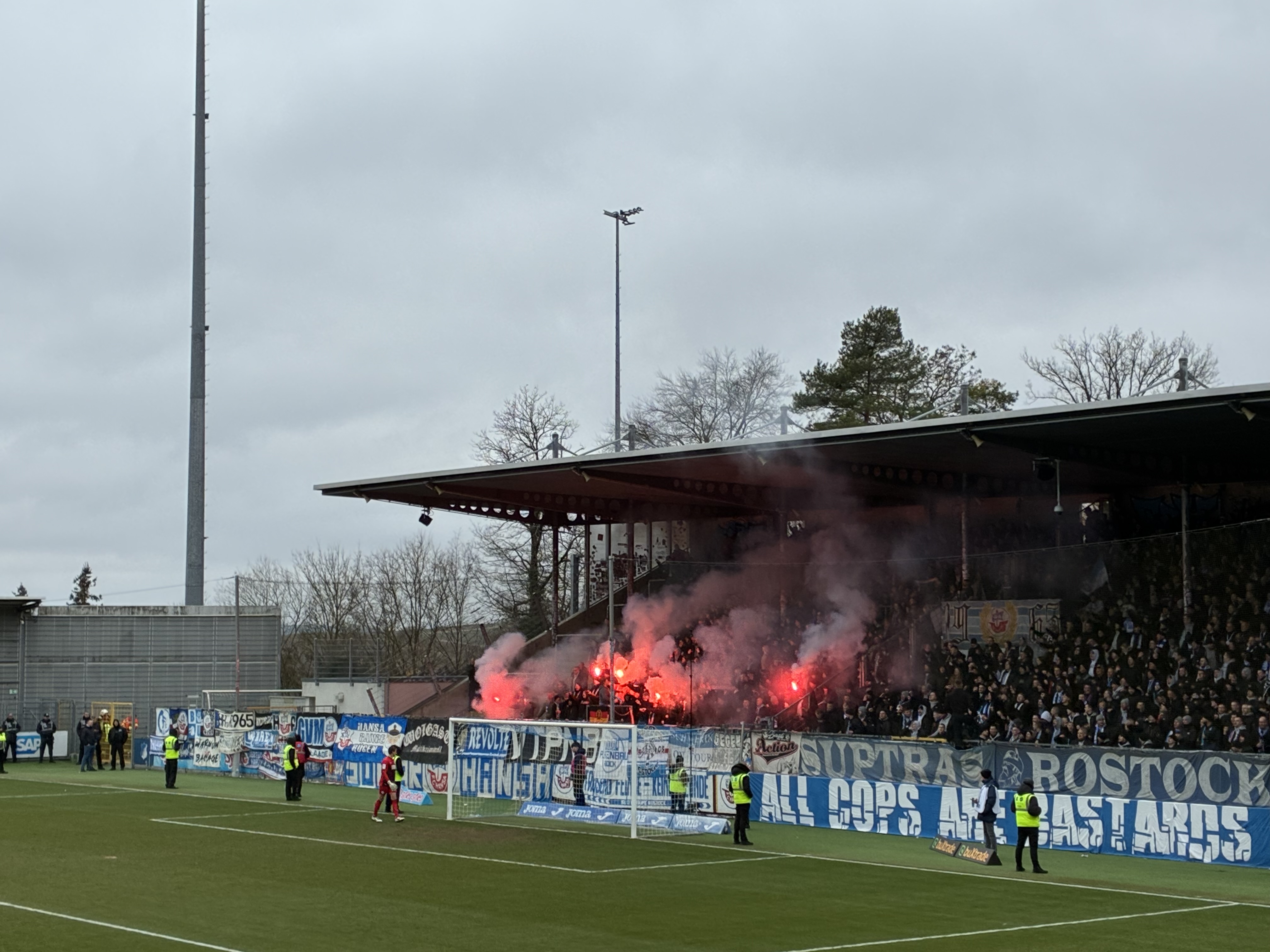 An diesem Wochenende war das erste Spiel nach dem 20-jährigen Jubiläum der Stendal-Randale. Nach einer Spielabsage in Braunschweig kam es im Jahr 2006 am Umsteigebahnhof in Stendal zu Randale und heftigen Auseinandersetzungen mit der Polizei. Dementsprechend war die Sonderzuganreise heute sicher kein Zufall (wenn auch eine WET-Tour krasser gewesen wäre) und kundige Stimmen (ich hatte natürlich keinen blassen Schimmer) eine optische Aktion erwartet. So kam es dann auch und am Zaun wurde ein riesiges „Zwanzig Jahre Stendal Randale“ gezeigt. Dazu gab es in der Mitte des Blockes eine Visualisierung eines brennenden Polizeiautos und eines Polizisten mit Schutzschild. Dazu wurden in orangenen Bombern Fackeln und schwarze Rauchtöpfe angeschmissen, die aufgrund des Windes eine krasse Rauchentwicklung hatten. Sicher werden die meisten heutigen Aktiven damals noch nicht dabei gewesen sein. Irgendwie crazy, dass dieses Ereignis gefühlt einen riesigen Stellenwert in der Geschichte der Rostocker Fanszene einnimmt und so erinnert wird.