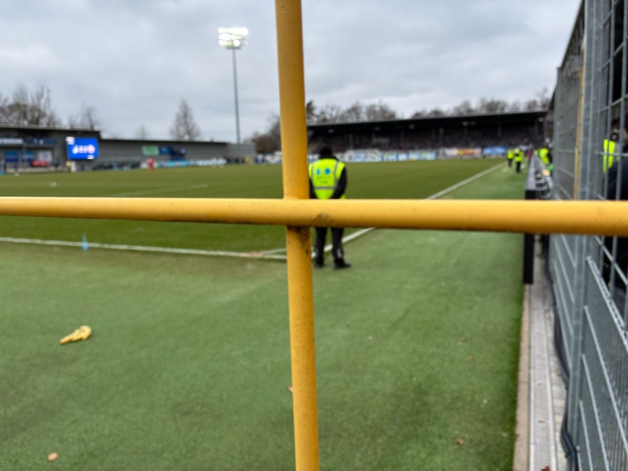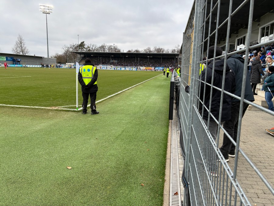 Am Bahnhof quatschte die Staatsmacht dann wirklich jede einzelne Person und sortierte Heim- von Auswärtsfans. Ich ging glaubwürdig genug als bäuerlicher Depp durch und durfte mich auf den Weg zum Heimeingang machen. Auf dem Weg gabelten mich noch zwei orientierungslose Dudes auf, denen ich den Weg wies und mit denen ich den Berg hochkraxelte- ehe sich am Eingang die Wege trennten. Die beiden kauften entspannt ihre Eintrittskarte, während ich mit meinem Wochenendrucksack an der Einlasskontrolle scheiterte. Bereits bei Stuttgart II hatte ich diese Ängste- mittlerweile gibt es aber eigentlich recht zuverlässig Abgabemöglichkeiten. Man sollte meinen vor allem, wenn man in einem Kaff spielt- in dem es eben auch am Bahnhof keine Schließfächer gibt, dann sollte das schon fast eine Lizenzauflage sein. Der erste Tipp war den Rucksack im Auto zu lassen (Danke!), der zweite Tipp war der aggressive Verweis auf die Stadionordnung.