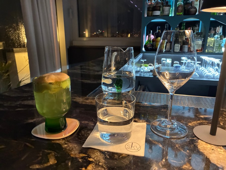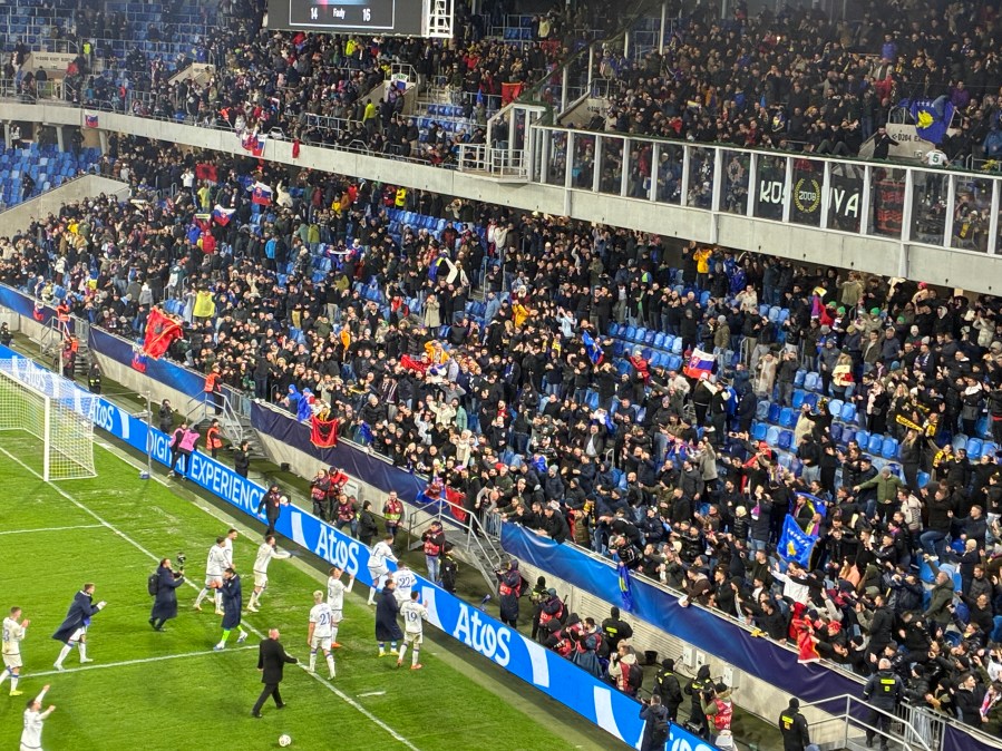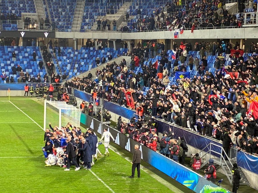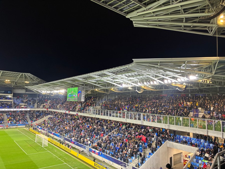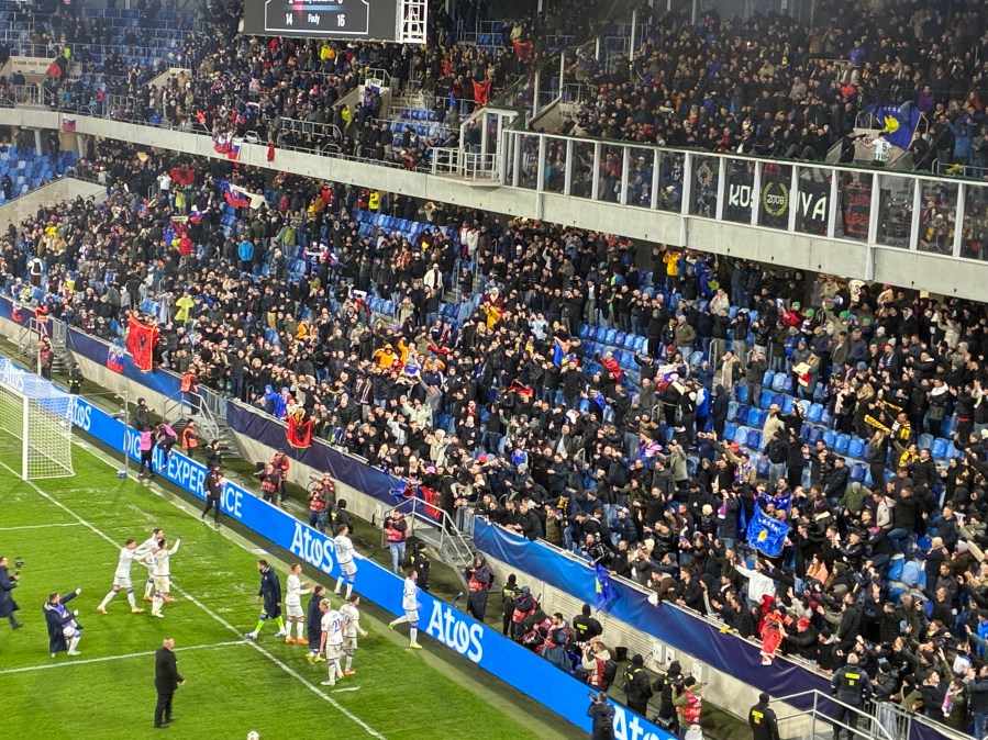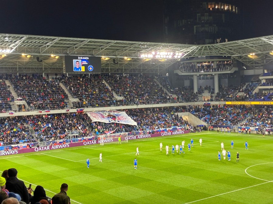 Bei furchtbarem Wetter erreichte ich Breclav und musste dort auch noch einmal ein wenig Zeit herumkriegen. Dann kam endlich der letzte Zug und brachte mich nach Bratislava. Auch dort erwartete mich eine Mischung aus Regen und teils starken Windböen. Zu Fuß erreichte ich mein Hotel, bezog das Zimmer und nach einer kurzen Pause wagte ich mich wieder nach draußen. Ich warf noch einen kurzen Blick auf die Kosovo-Fans, die gerade die Shuttlebusse zum Stadion bestiegen und stimmte mich dann schon einmal stilvoll auf mein Jubiläum ein. In einer wirklich coolen Skybar trank ich einen herausragenden Cocktail und wankte ziemlich angezählt aus der Bar. Ein herzhaftes Abendessen reduzierte die Umdrehungen wieder ein bisschen und kurze Zeit später betrat ich die Straßenbahn, die mich zum Stadion brachte.