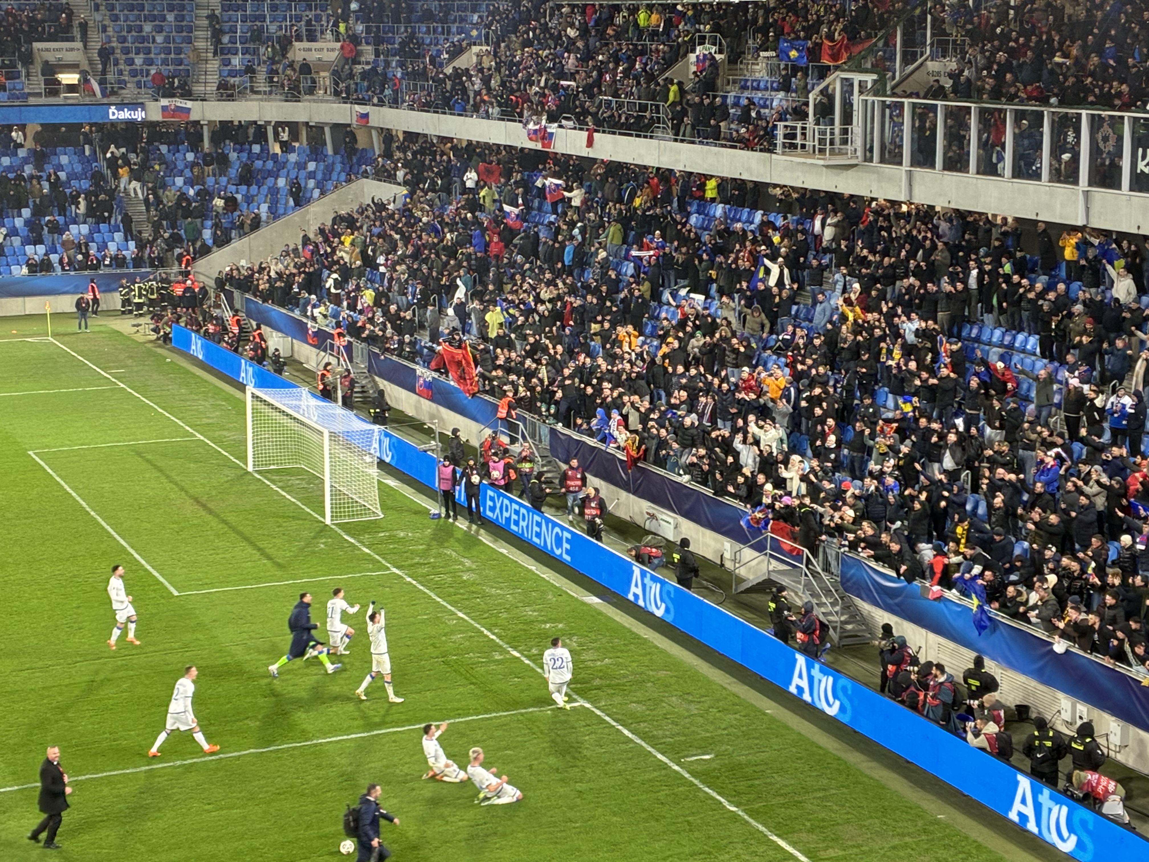 Bei furchtbarem Wetter erreichte ich Breclav und musste dort auch noch einmal ein wenig Zeit herumkriegen. Dann kam endlich der letzte Zug und brachte mich nach Bratislava. Auch dort erwartete mich eine Mischung aus Regen und teils starken Windböen. Zu Fuß erreichte ich mein Hotel, bezog das Zimmer und nach einer kurzen Pause wagte ich mich wieder nach draußen. Ich warf noch einen kurzen Blick auf die Kosovo-Fans, die gerade die Shuttlebusse zum Stadion bestiegen und stimmte mich dann schon einmal stilvoll auf mein Jubiläum ein. In einer wirklich coolen Skybar trank ich einen herausragenden Cocktail und wankte ziemlich angezählt aus der Bar. Ein herzhaftes Abendessen reduzierte die Umdrehungen wieder ein bisschen und kurze Zeit später betrat ich die Straßenbahn, die mich zum Stadion brachte.