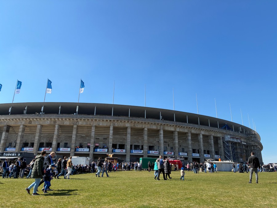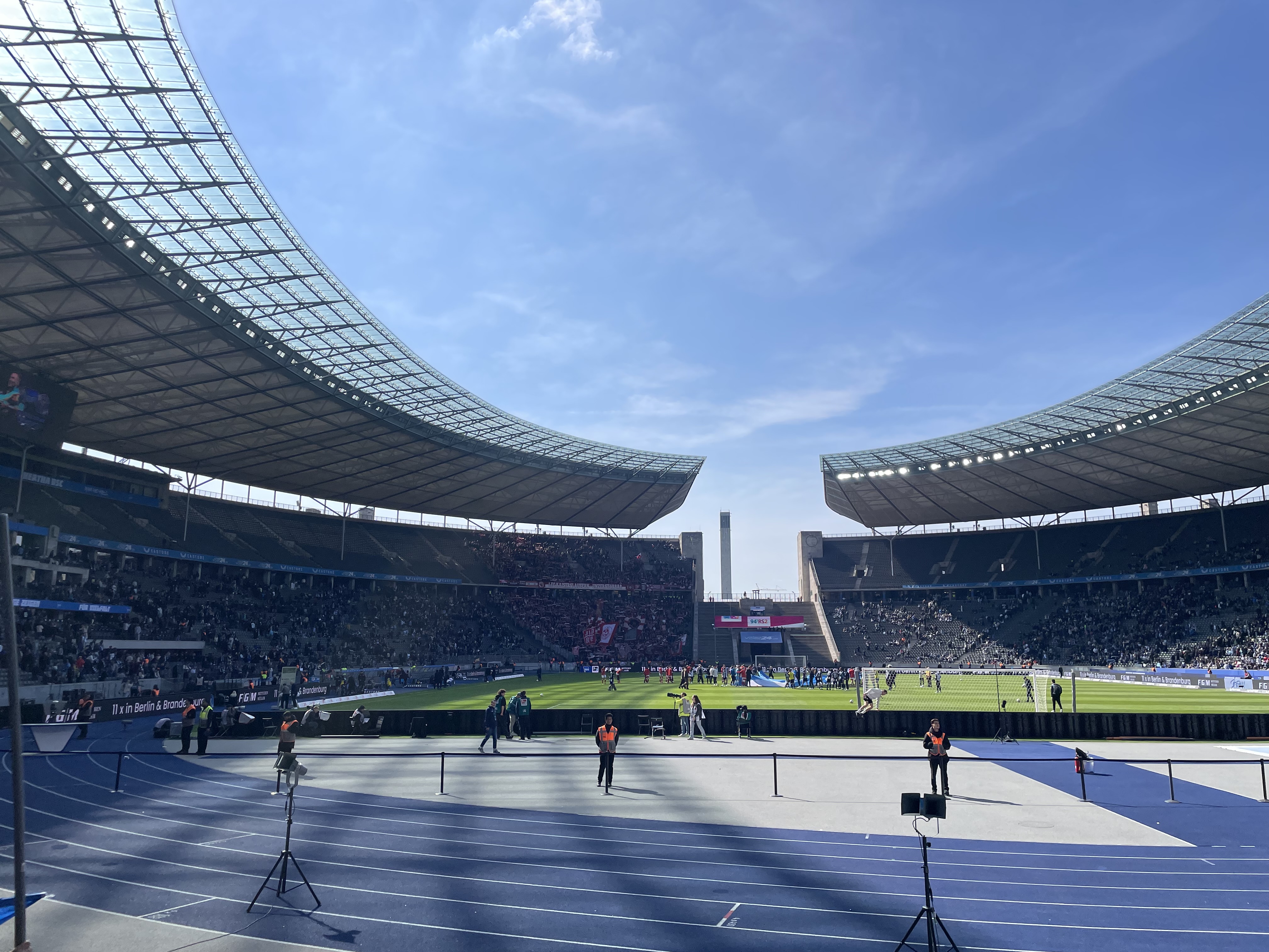 Aufgewertet wurde das Spiel dann erheblich durch die Begleitung. Mit dem Klabauterkeaper und dem Mini-Ha-Ho-He ging es nach einem netten Frühstück mit dem Fahrrad zum Potsdamer Hauptbahnhof. Der Nachwuchsherthaner ließ es sich nicht nehmen die Fahne auf dem Fahrradrücksitz in den Wind zu recken und erntete zahlreiche freundliche Blicke und auch das eine oder andere Ha-Ho-He. Für diese Momente macht man doch den ganzen Quatsch! Wir erreichten dann problemlos das Olympiastadion und erstmals in dieser Saison schaffte ich es am Spieltag das temporär an mich übertragene Auswärtsabo abzuholen. Dann ging es hinein und bei dem herausragenden Wetter lud die Wiese förmlich zum Verweilen ein. Bei gutem Besuch und Fußball rückte der Anpfiff immer näher und ich verabschiedete mich in die Kurve.