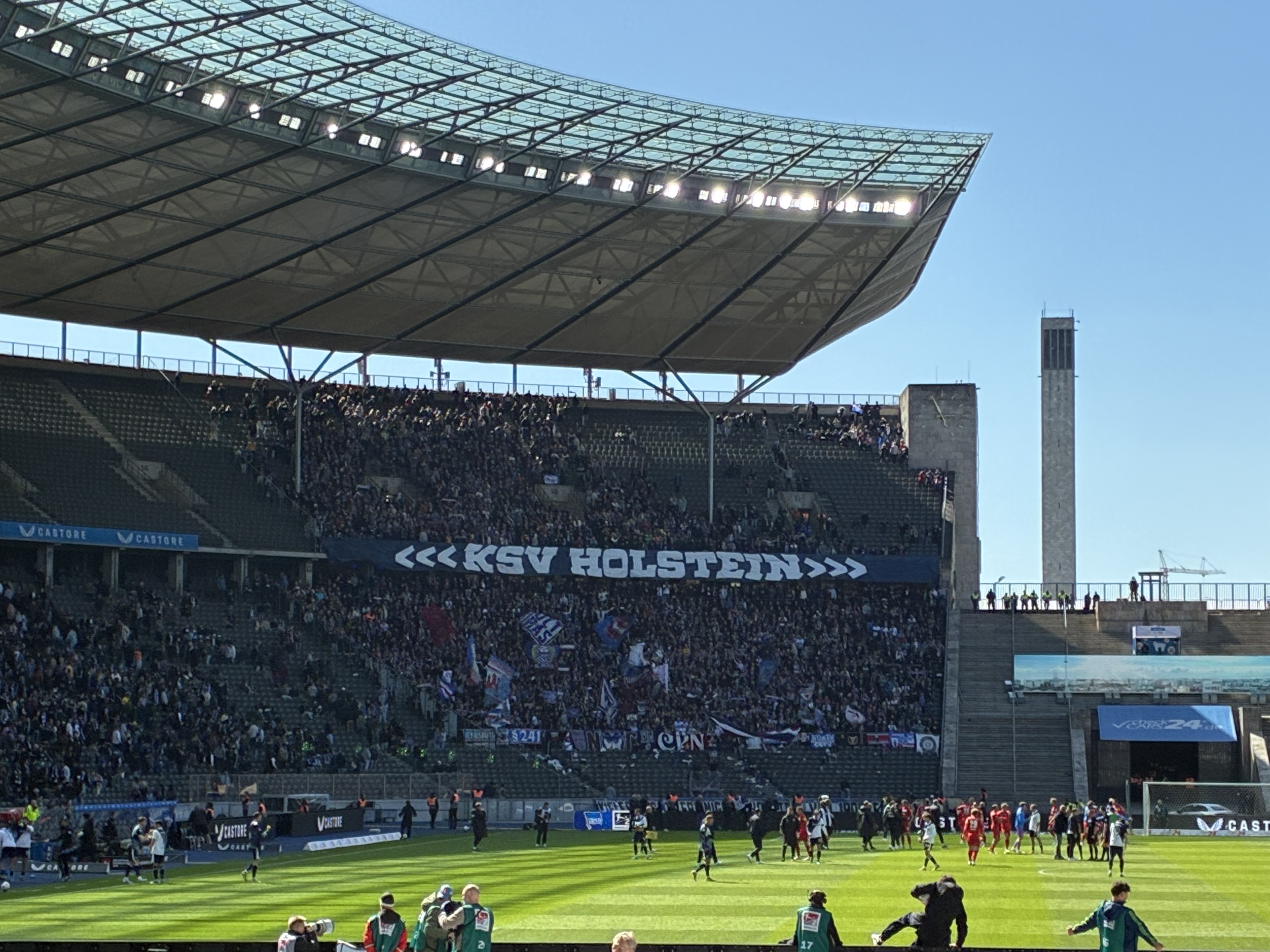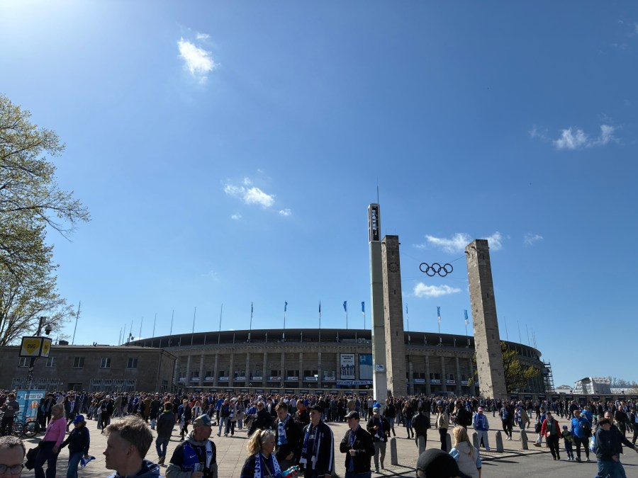 Mit dem extrem leeren Regio ging es nach Osnabrück und dort gelang durch einen kleinen Galopp der Zustieg in den ICE nach Berlin. Die Fahrt war dann sehr entspannt und überpünktlich rollten wir in Spandau ein. Dort ersprintete ich die S-Bahn (die danach wäre ausgefallen- Big!) und kam somit sogar vor 12:00 am Olympiastadion an. Natürlich waren die Leute zu diesem Zeitpunkt aber bereits im Stadion, sodass meine halbherzigen Versuche meinen Rucksack in ein Auto zu bekommen, versandeten. Früher hätte ich mich über die 5 Euro schwarz geärgert- heute war es mir in Anbetracht meines großen Rucksacks, ziemlich egal.